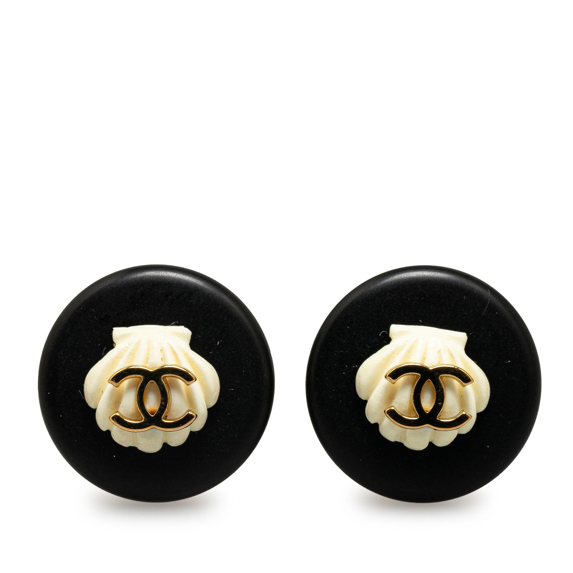 Product Details: Black Chanel CC Button Shell Clip On Earrings. These earrings feature a plastic body, gold plated CC logo, and clip-on closures. 0.8" L x 0.8" W x 0" D. Serial number 96C.
