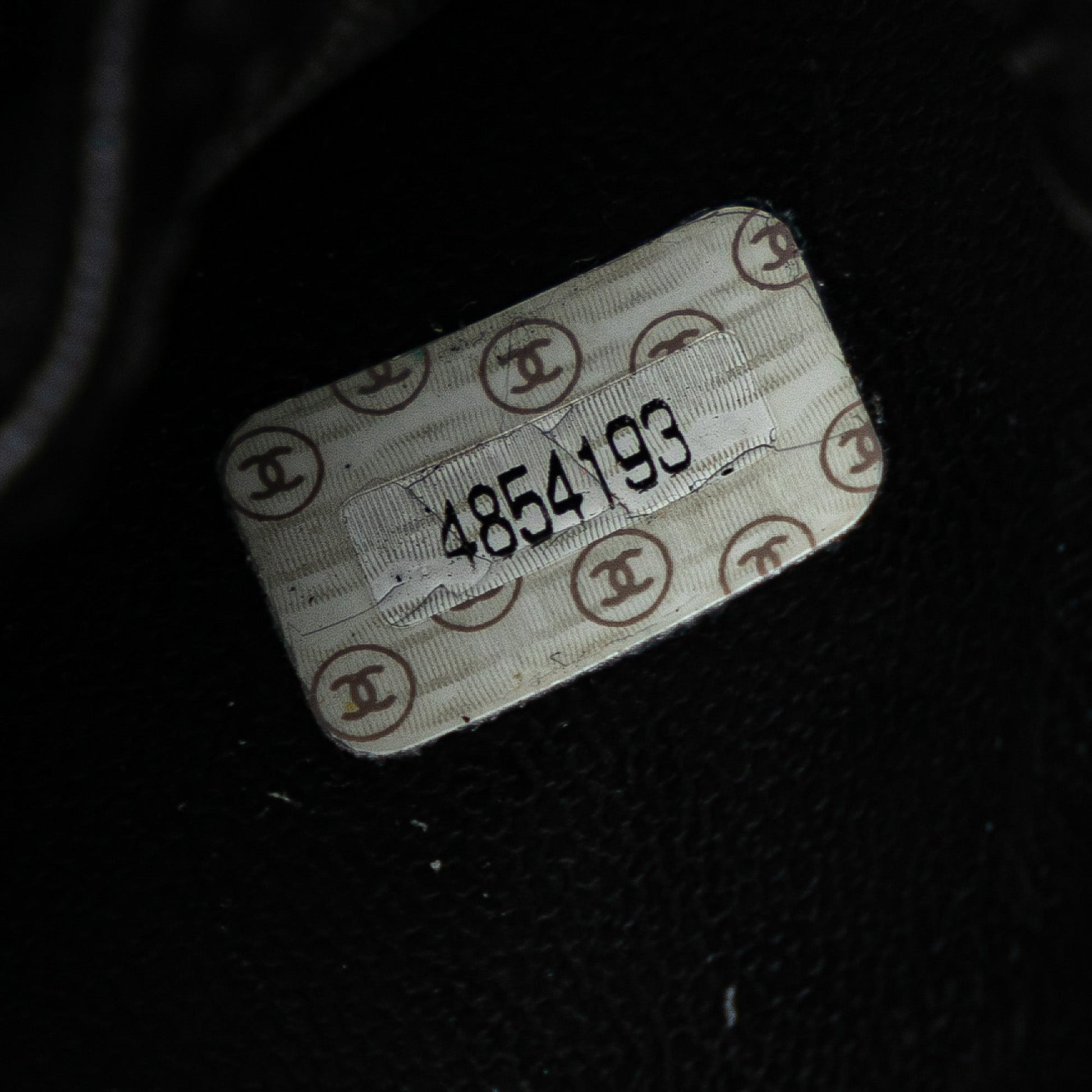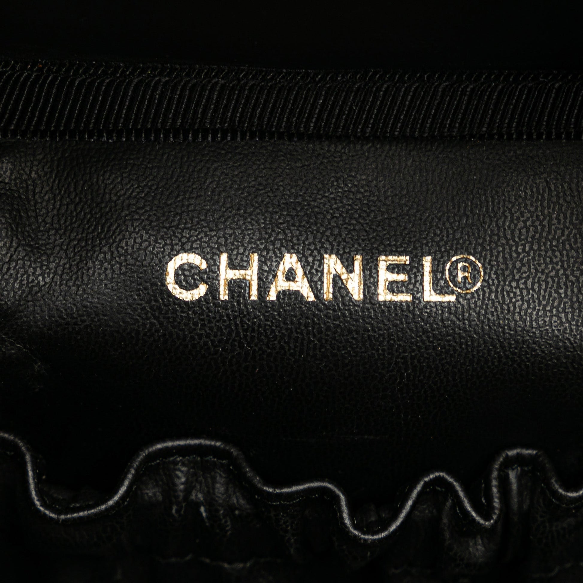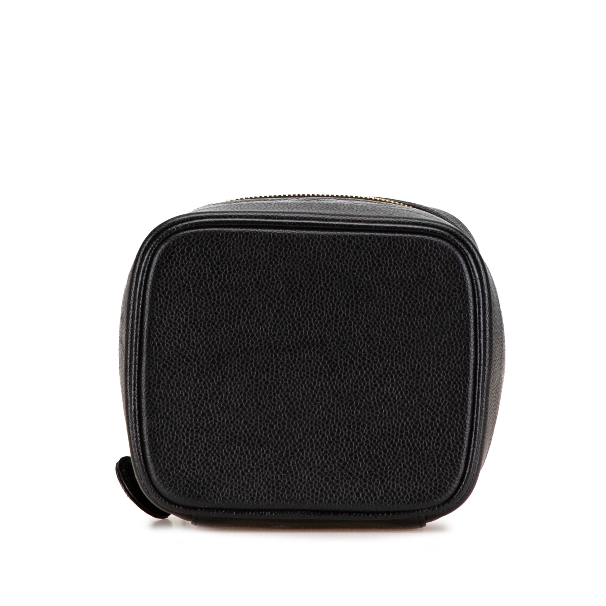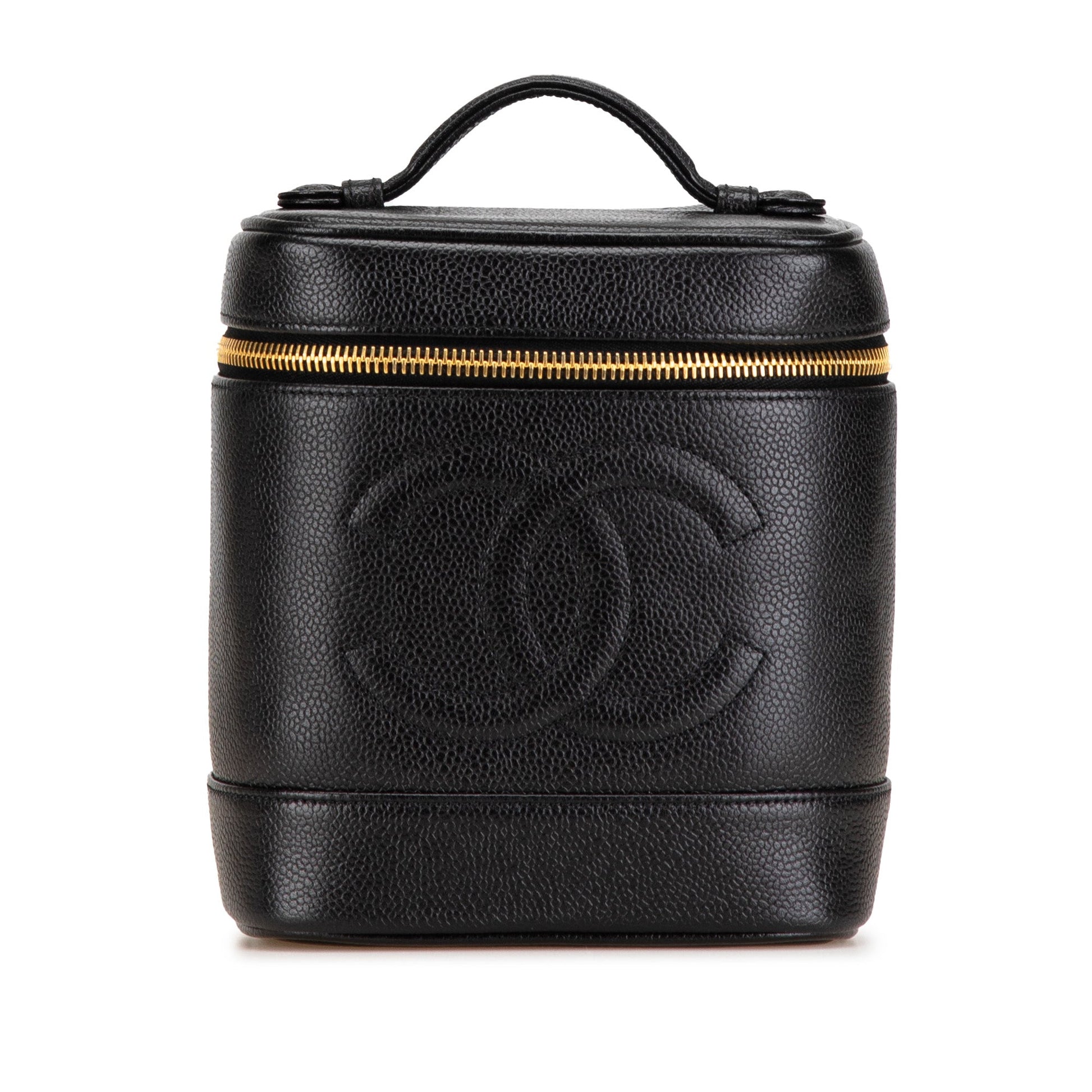 Product Details: Black Chanel CC Caviar Vanity Case. This vanity bag features a caviar leather body, a flat leather top handle, a top zip-around closure, and an interior slip pocket. 6.7" L x 5.7" W x 4.7" D, 1.2" drop. Serial number 4854193.