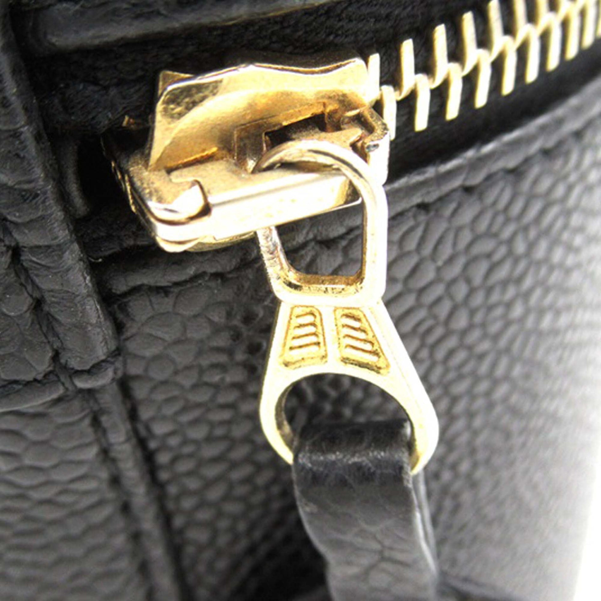 Product Details: Black Chanel CC Caviar Vanity Case. This vanity bag features a caviar leather body, a flat leather top handle, a zip-around closure, and an interior slip pocket. 6.3" L x 5.9" W x 4.7" D, 0.8" drop. Serial number 7709450.