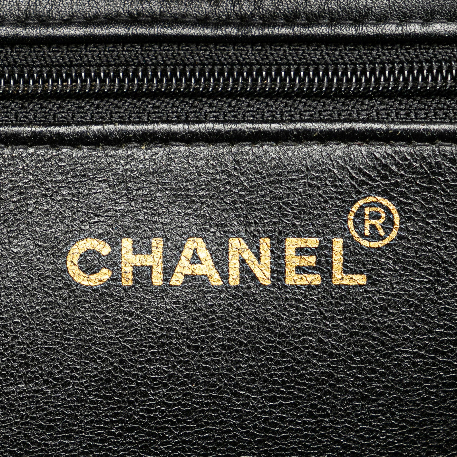 Product Details: Black Chanel CC Lambskin Chain Tote. This tote bag features a lambskin leather body, leather-woven chain link straps, an open top, and an interior zip pocket. 12.2" L x 16.1" W x 2" D. Serial number 3572883.