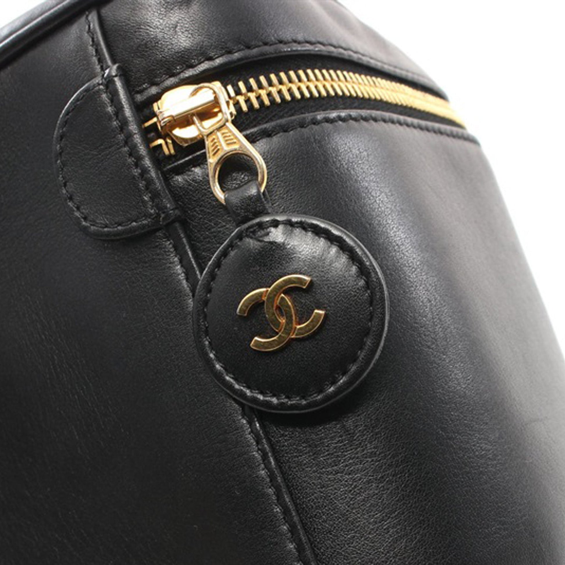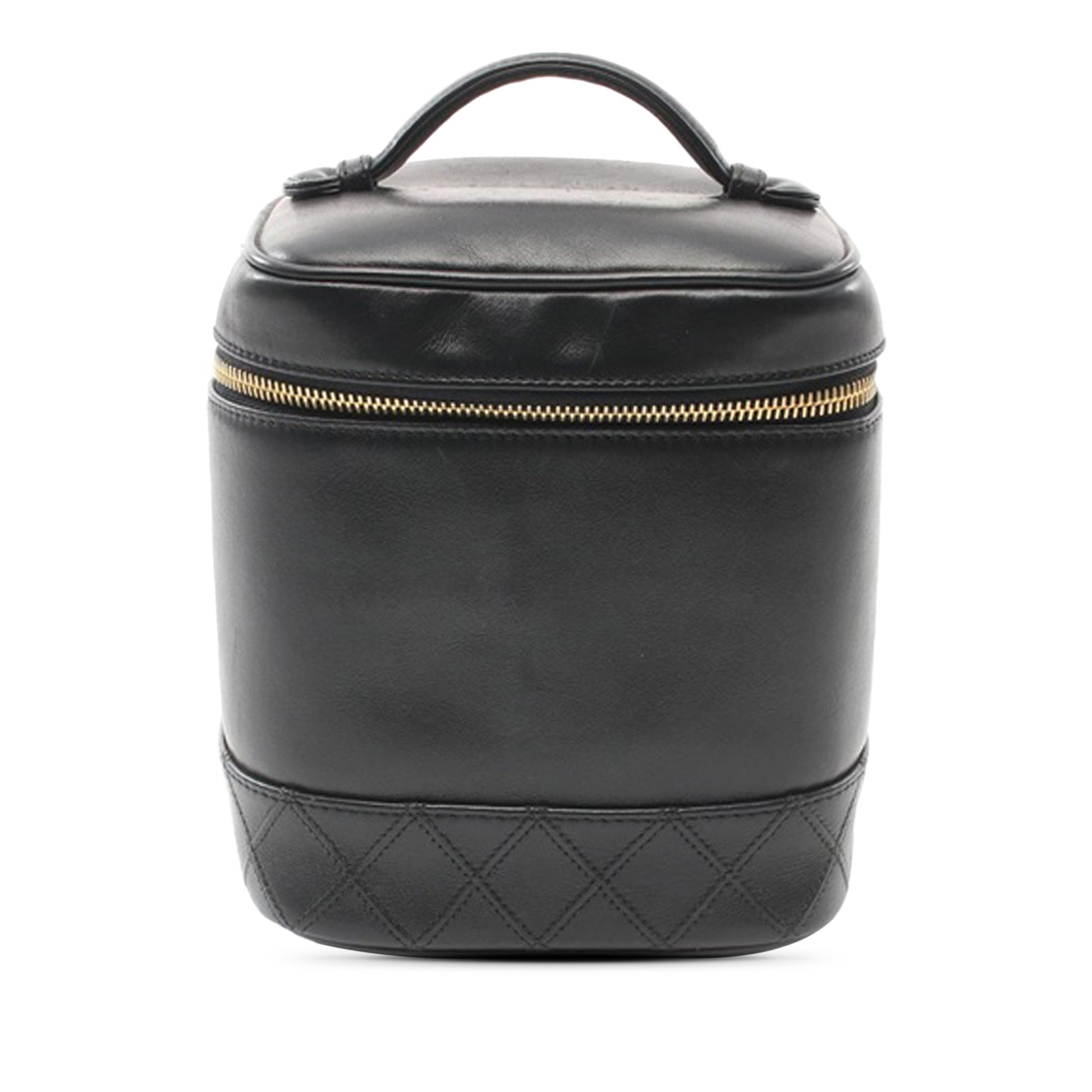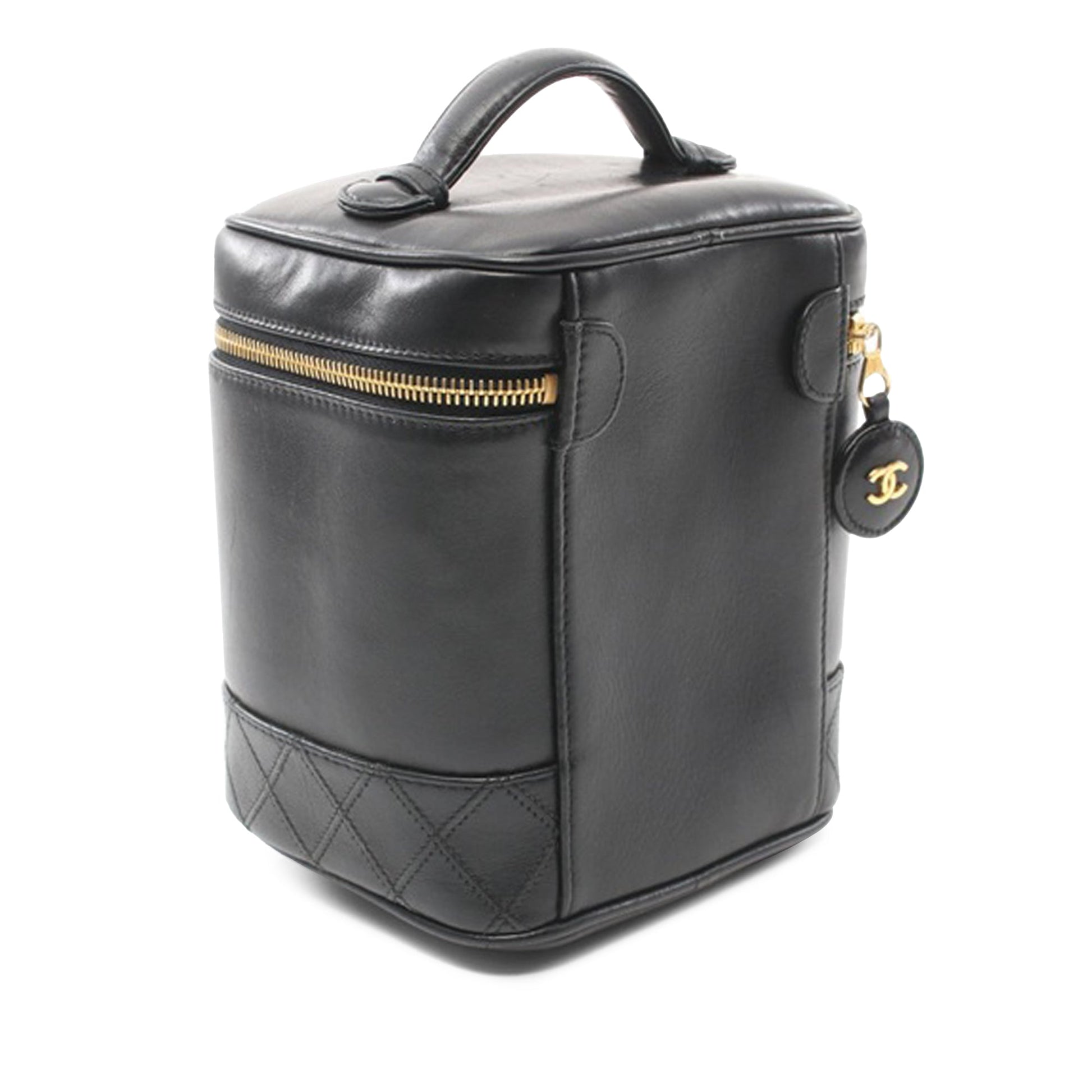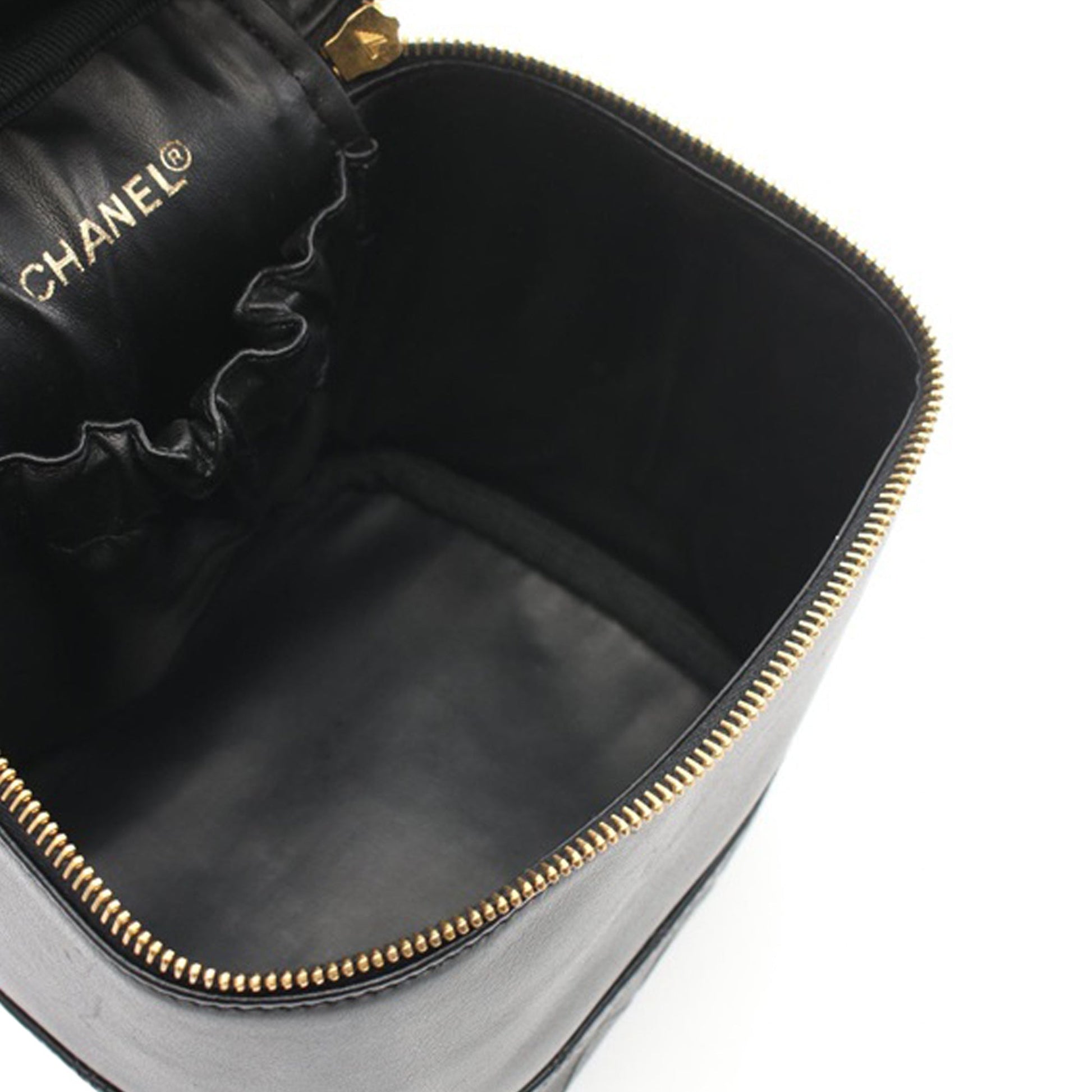 Product Details: Black Chanel CC Lambskin Vanity Case. This vanity bag features a lambskin leather body, a flat top handle, a zip around closure and an interior slip pocket. 6.7" L x 5.9" W x 4.7" D, 2.4" drop. Serial number 3501313.