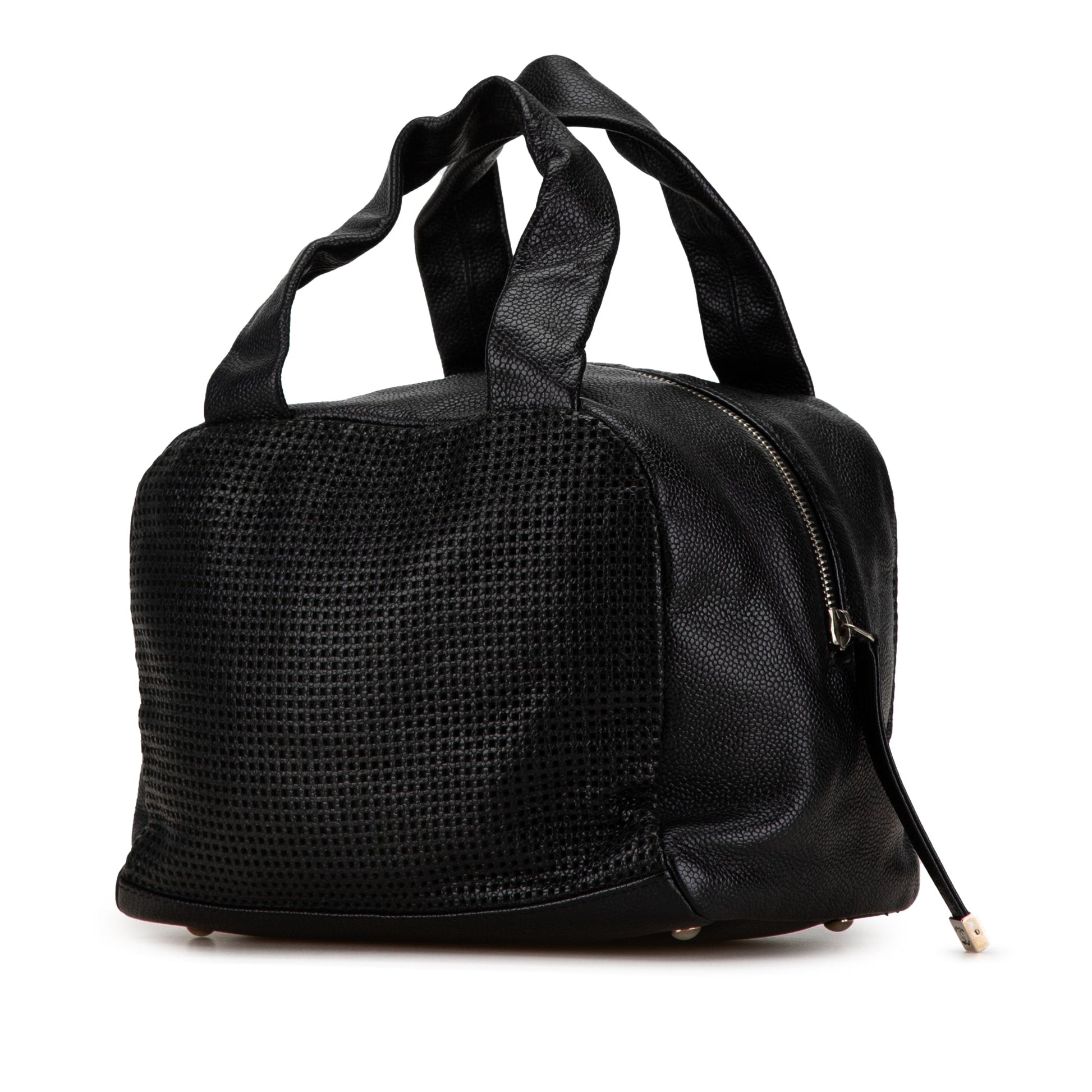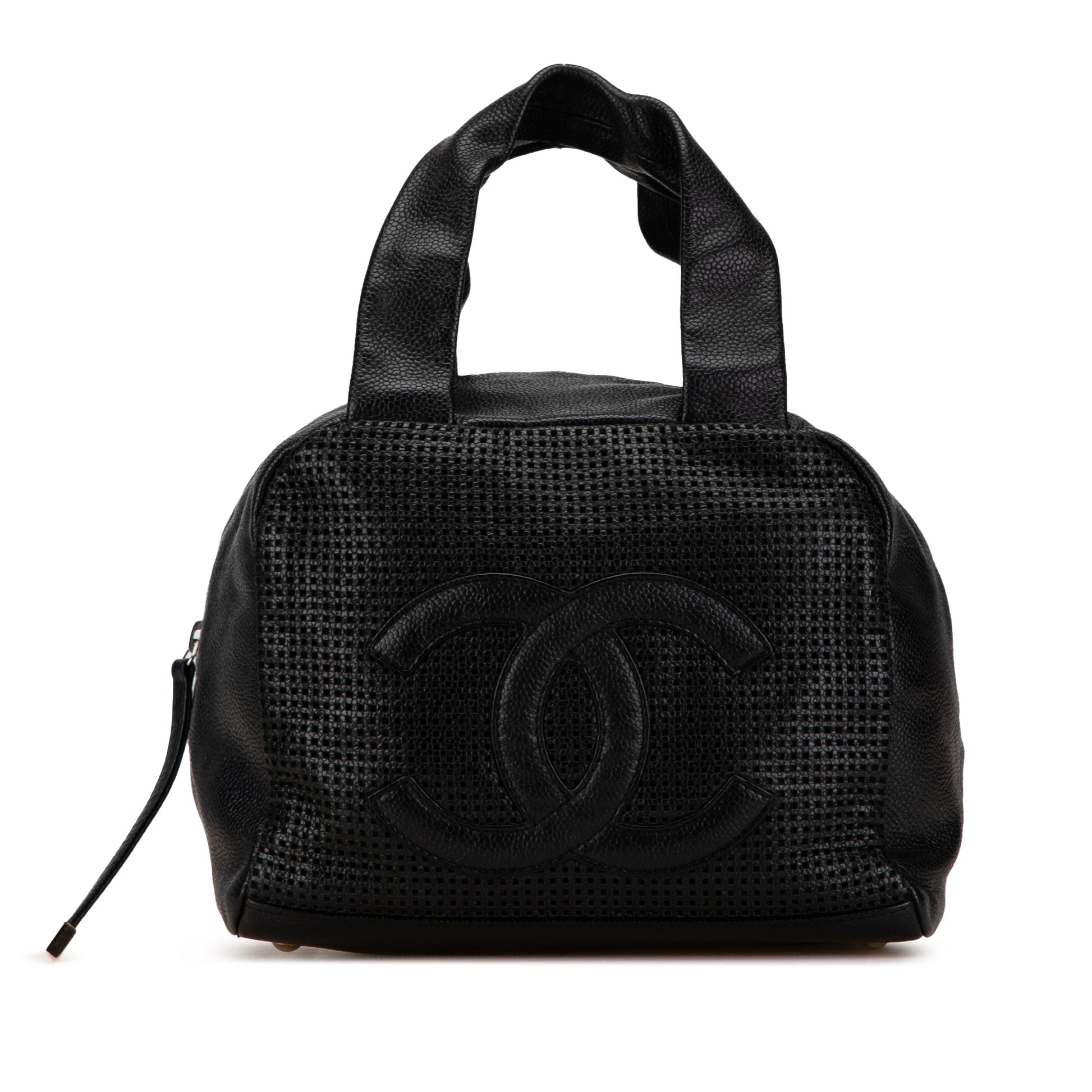 Product Details: Black Chanel CC Perforated Caviar Bowler Bag. This handbag features a perforated caviar leather body, flat leather handles, a top zip closure and an interior zip pocket. 6.3" L x 8.5" W x 6.3" D, 4.7" drop. Serial number 9577491.