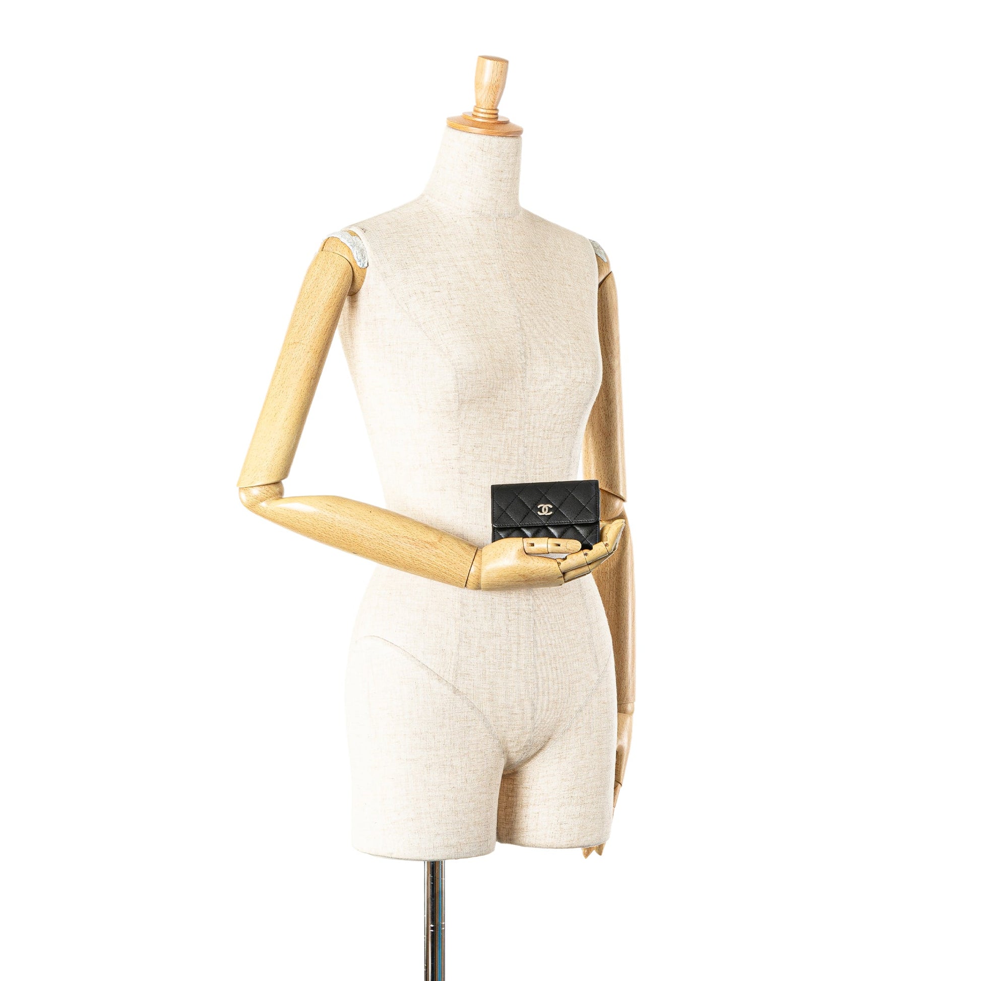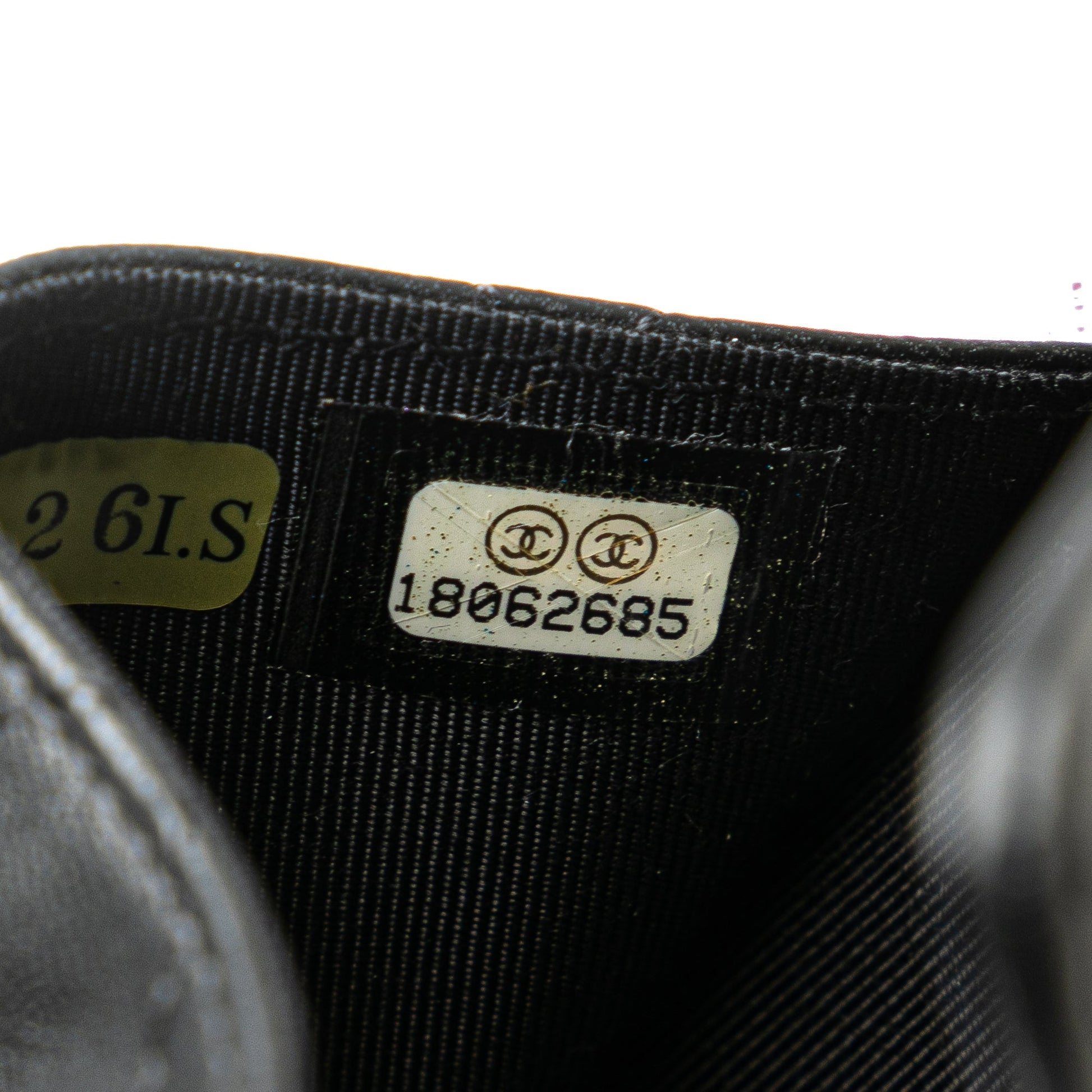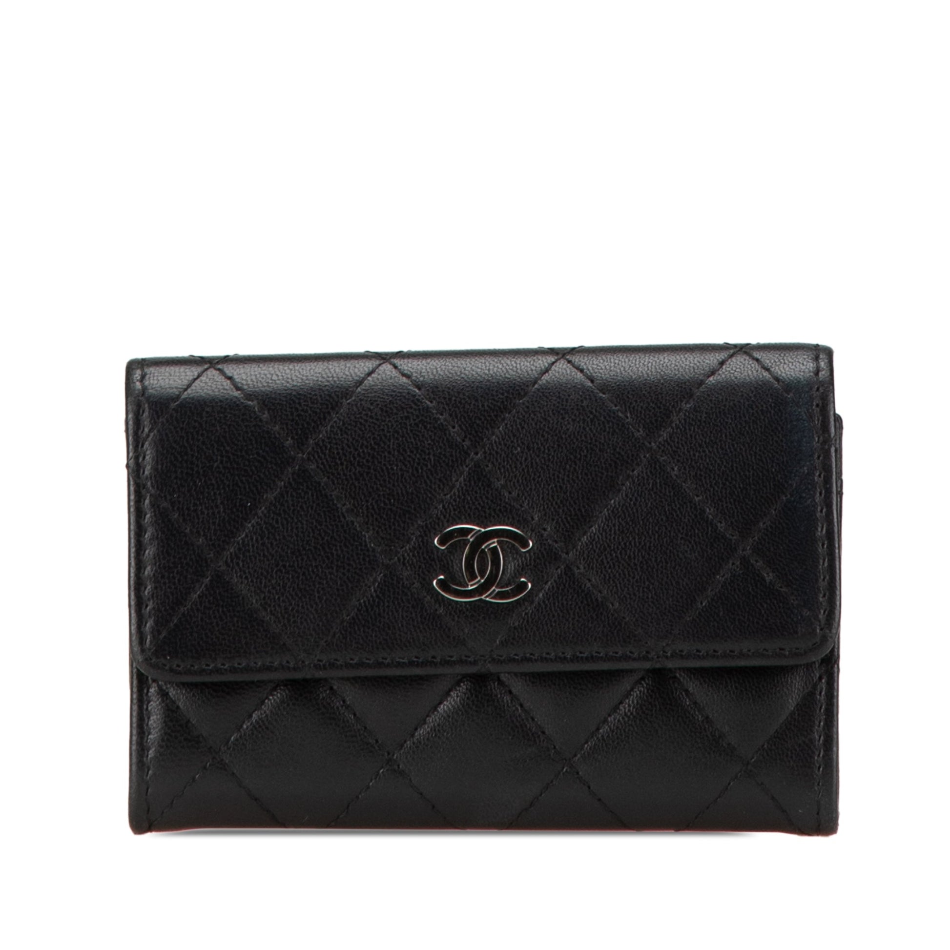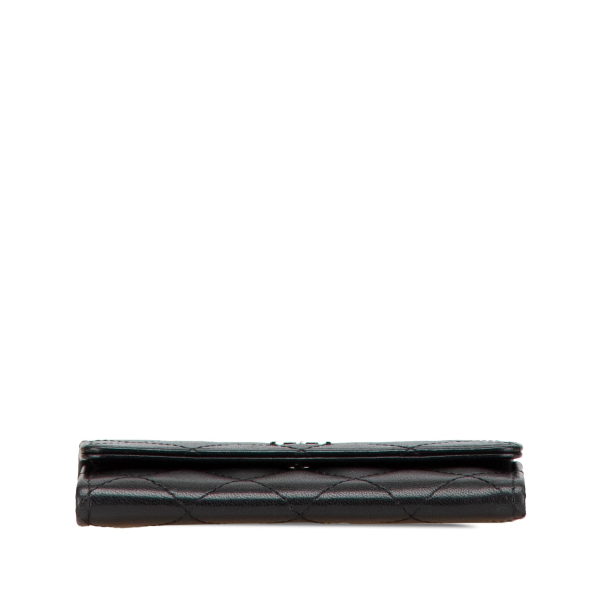 Product Details: Black Chanel CC Quilted Lambskin Card Holder. This card holder features a quilted lambskin leather body, a top flap with snap button closure, and an interior slip pocket. 2.8" L x 4.5" W x 0.4" D. Serial number 18062685.