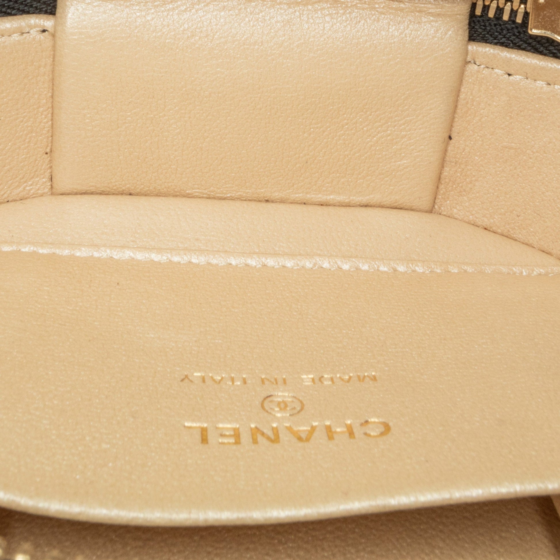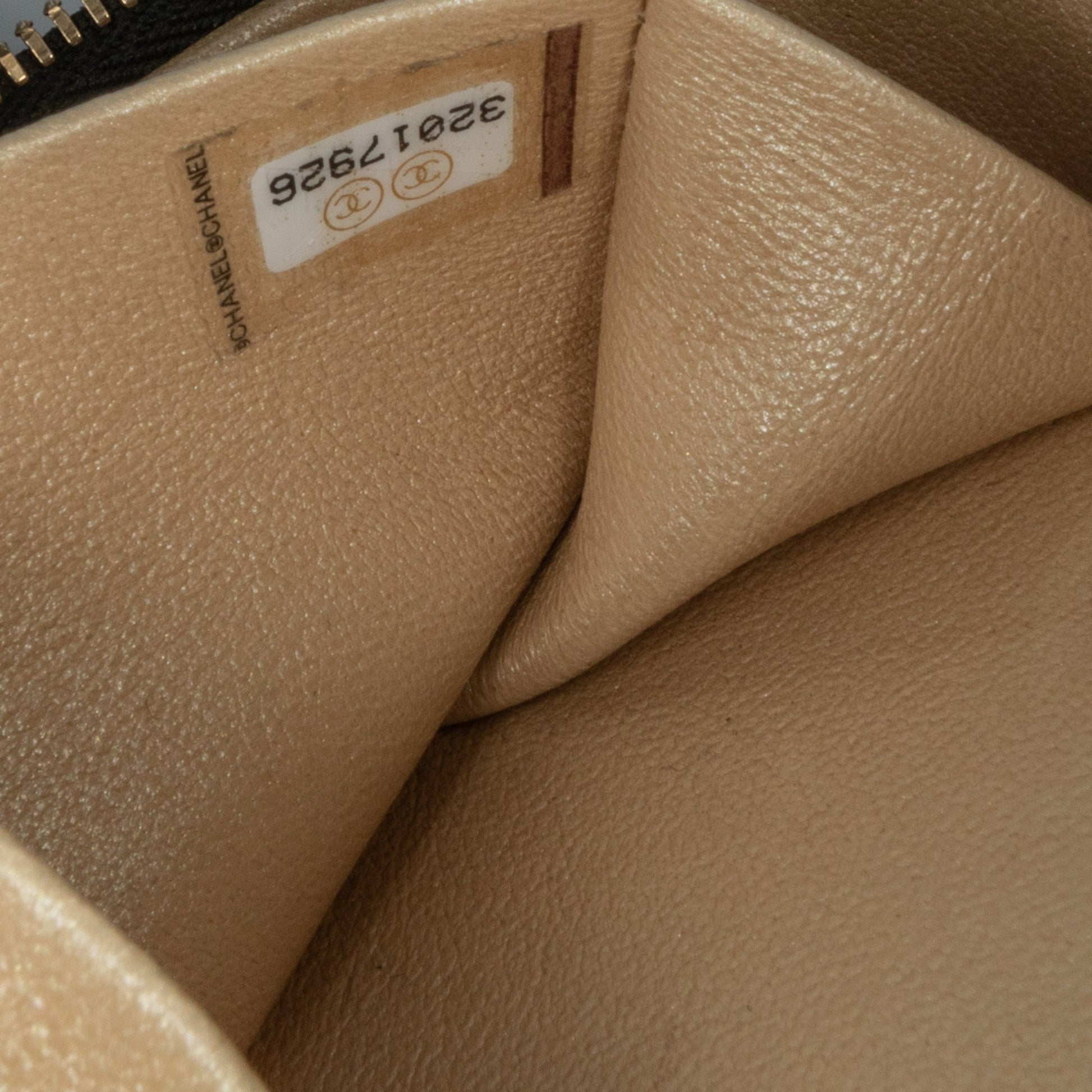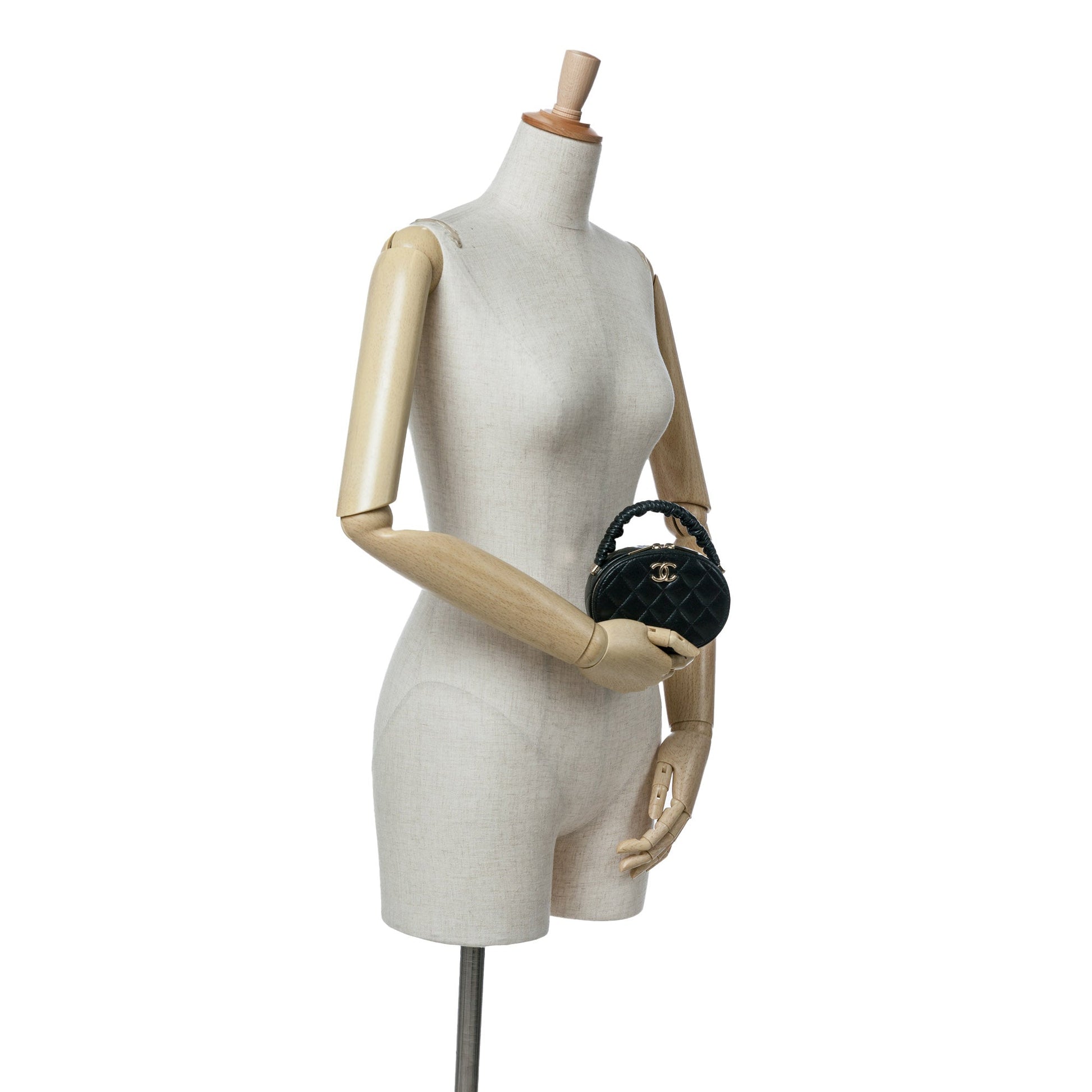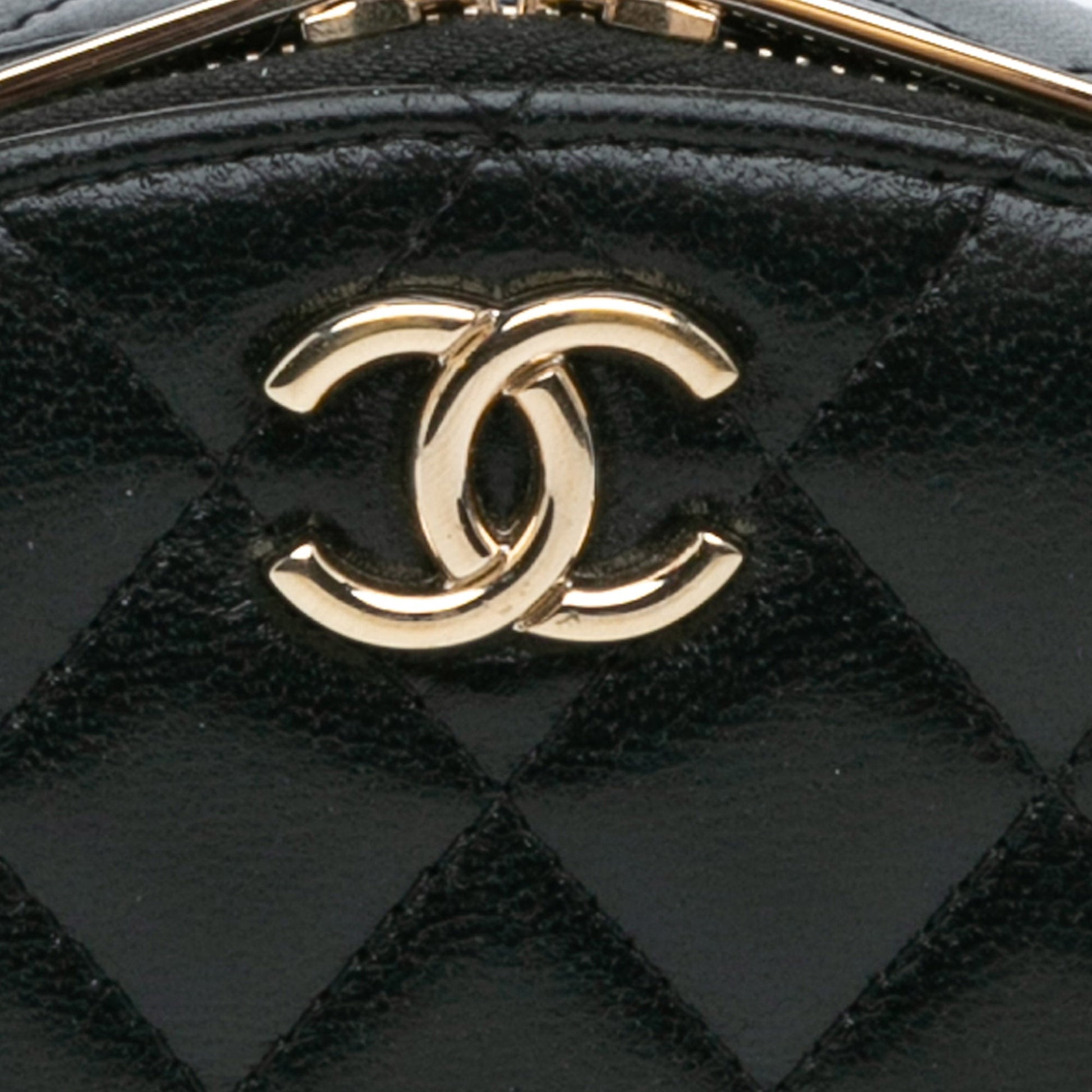 Product Details: Black Chanel CC Quilted Lambskin Oval Top Handle Clutch Handbag. This bag features quilted lambskin leather with gold-tone hardware, a rolled handle, a zip closure at top, and an interior slip pocket. 3.9" L x 5.1" W x 2.4" D, 1.6" drop. Serial number 32017926.