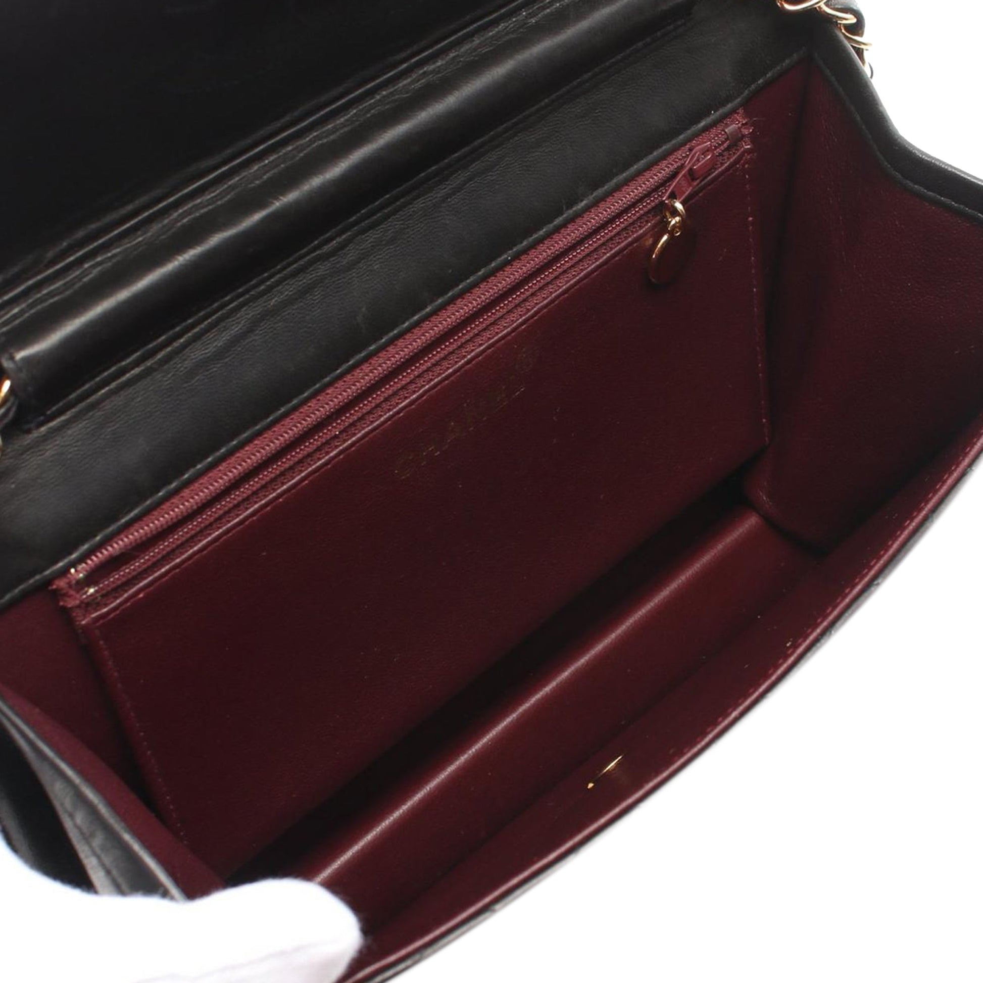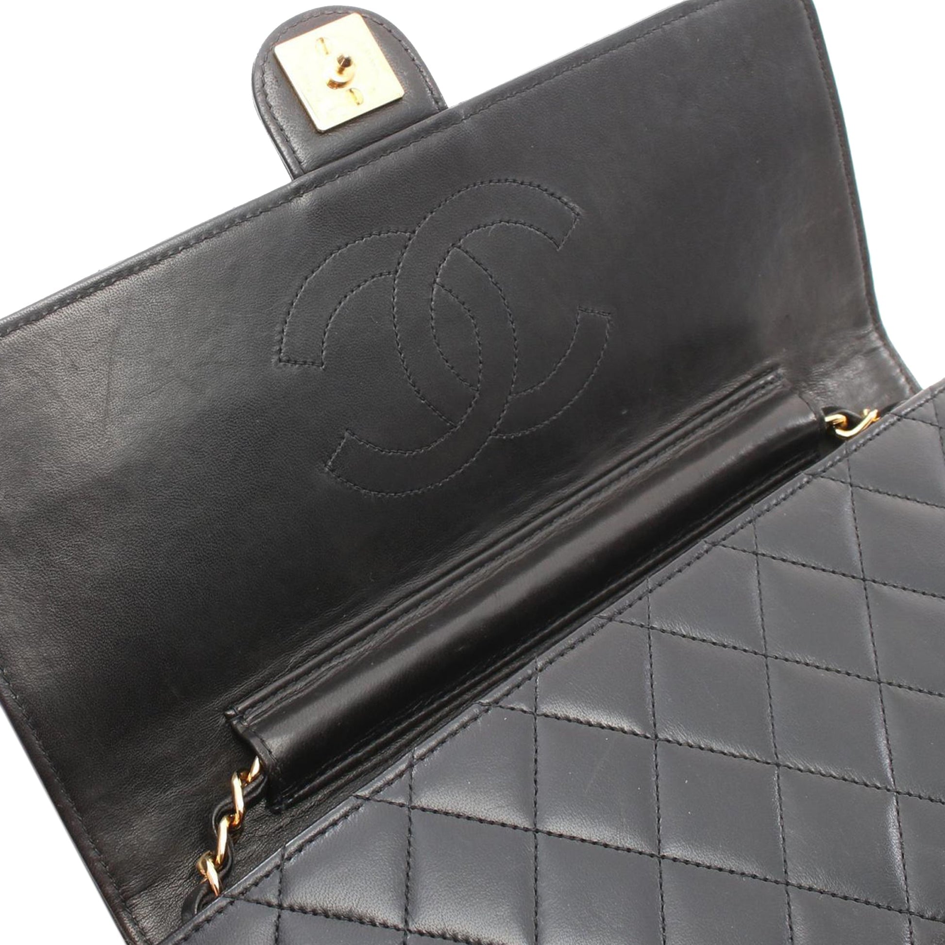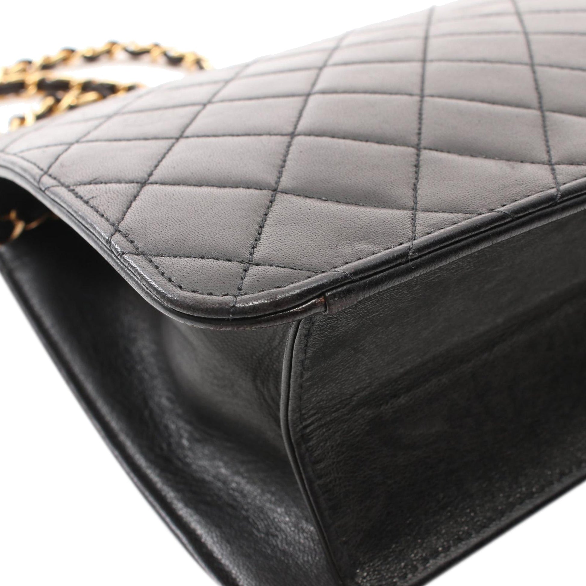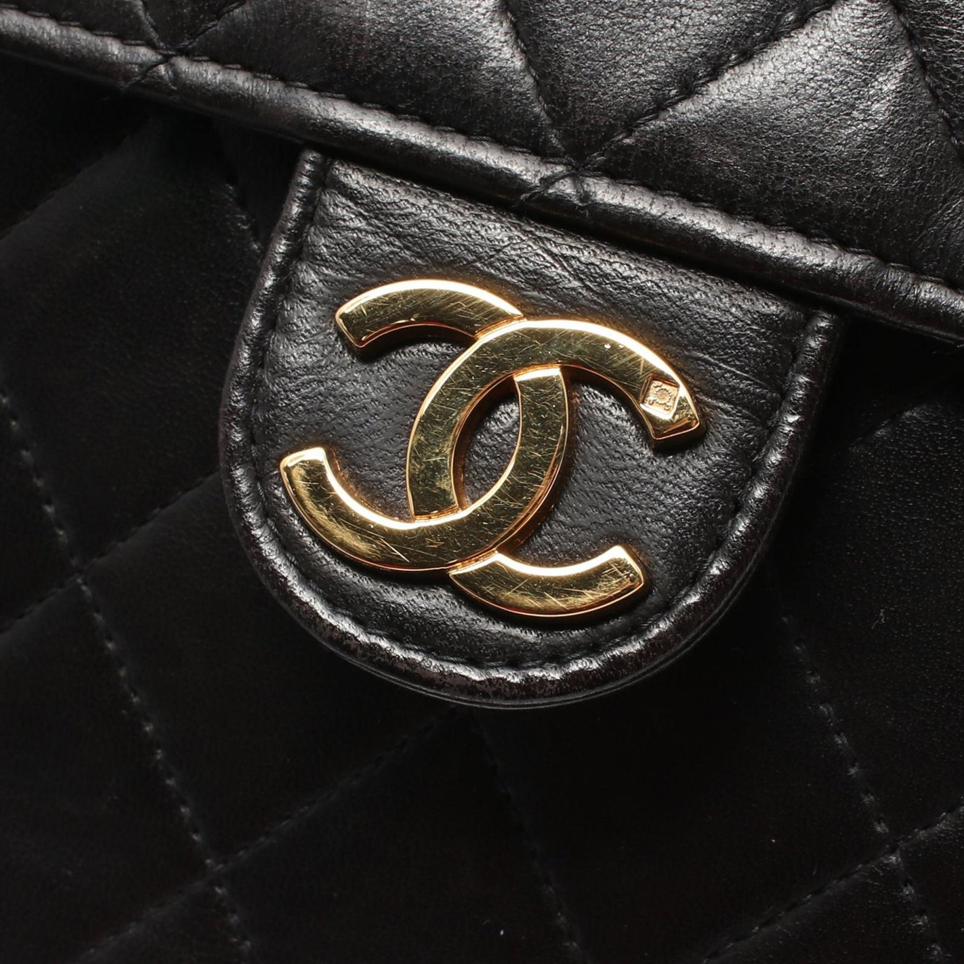 Product Details: Black Chanel CC Quilted Lambskin Single Flap Crossbody Bag. This shoulder bag features a quilted lambskin leather body, a leather woven chain strap, a front flap with magnetic snap closure, and an interior zip pocket. 7.3" L x 9.8" W x 3.1" D. Serial number 5270588.