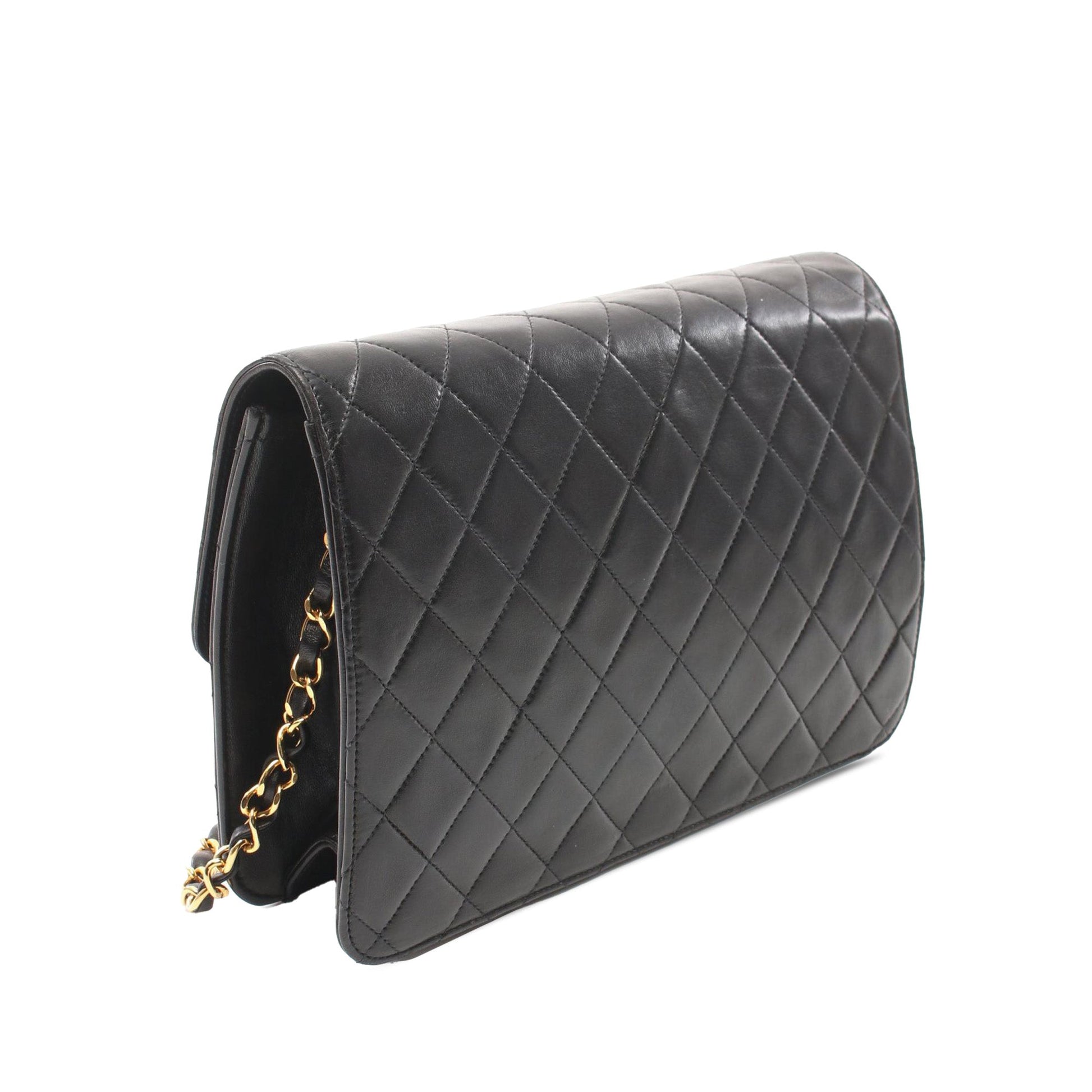 Product Details: Black Chanel CC Quilted Lambskin Single Flap Crossbody Bag. This crossbody bag features a quilted lambskin leather body, a leather woven chain strap, a front flap with magnetic snap closure, and an interior zip pocket. 7.3" L x 9.8" W x 3.1" D. Serial number 2816838.