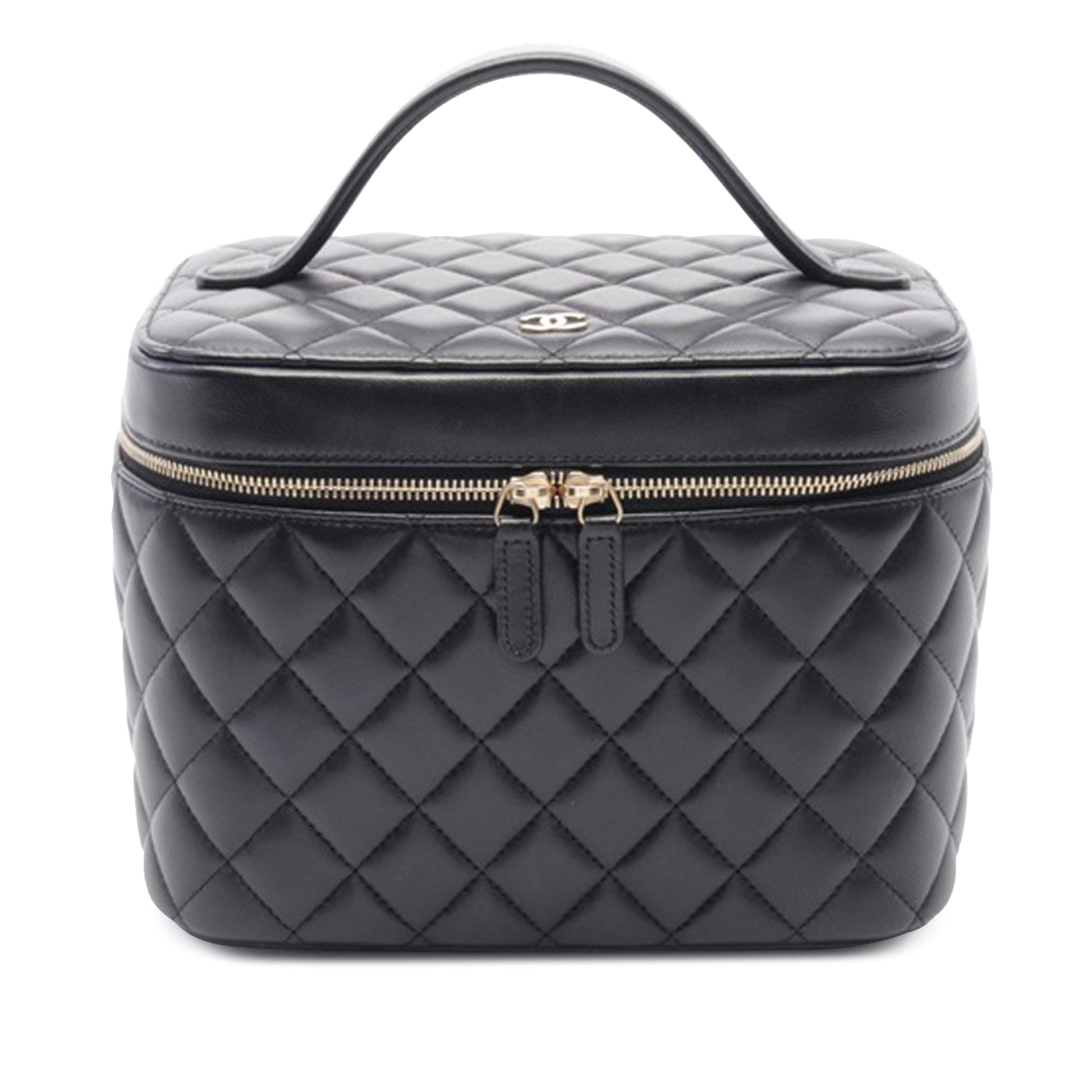 Product Details: Black Chanel CC Quilted Lambskin Vanity Bag. This vanity bag features a quilted lambskin body, a flat top handle, a top zip around closure, and interior slip pockets. 5.5" L x 8.1" W x 5.1" D, 7.1" drop. Serial number 22931343.