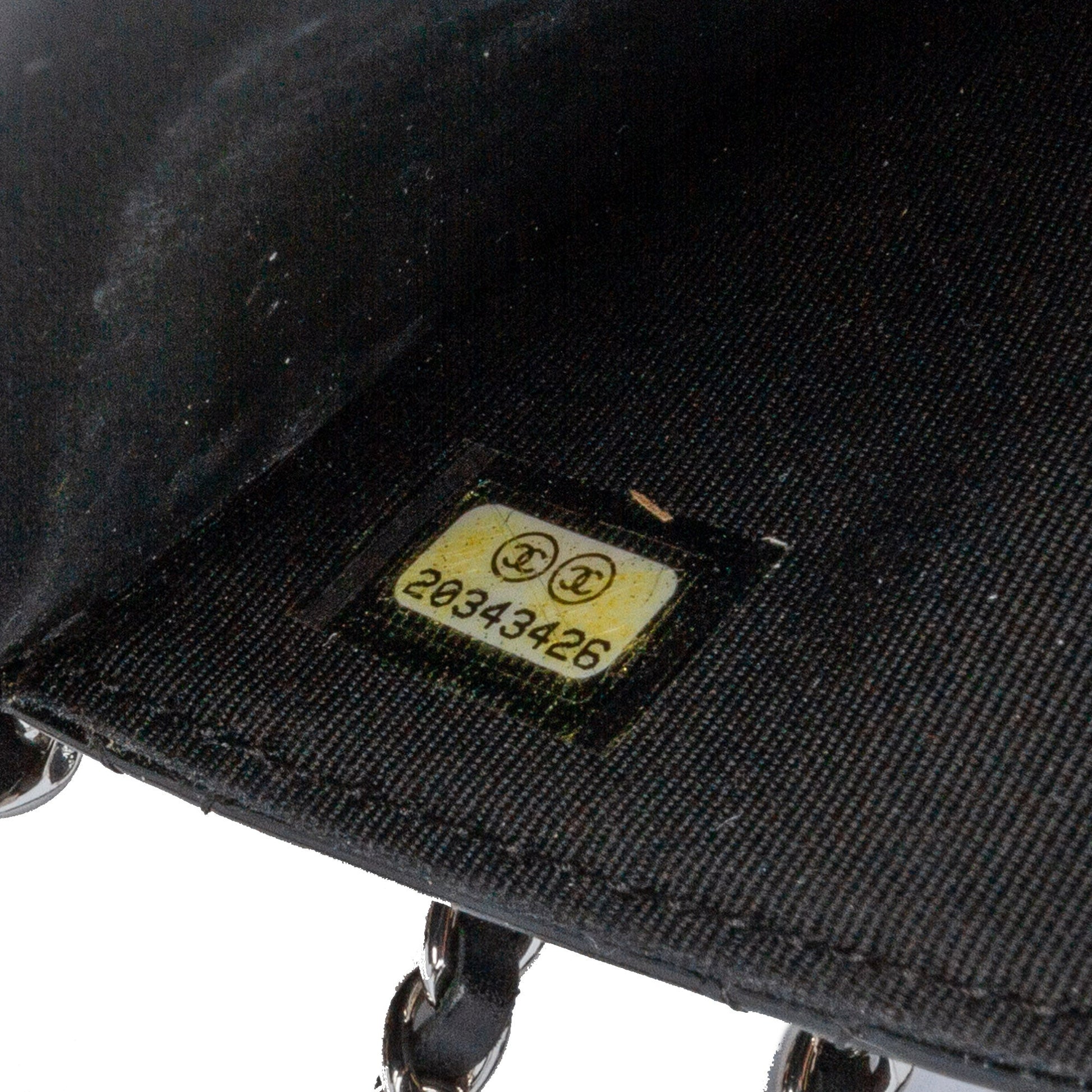 Product Details: Black Chanel CC Quilted Patent Wallet On Chain Crossbody Bag. This wallet on chain features a quilted patent leather body, a leather woven chain link strap, a front flap with snap closure, an interior zip compartment, and interior zip and slip pockets. 5.1" L x 7.5" W x 1.2" D. Serial number 20343426.