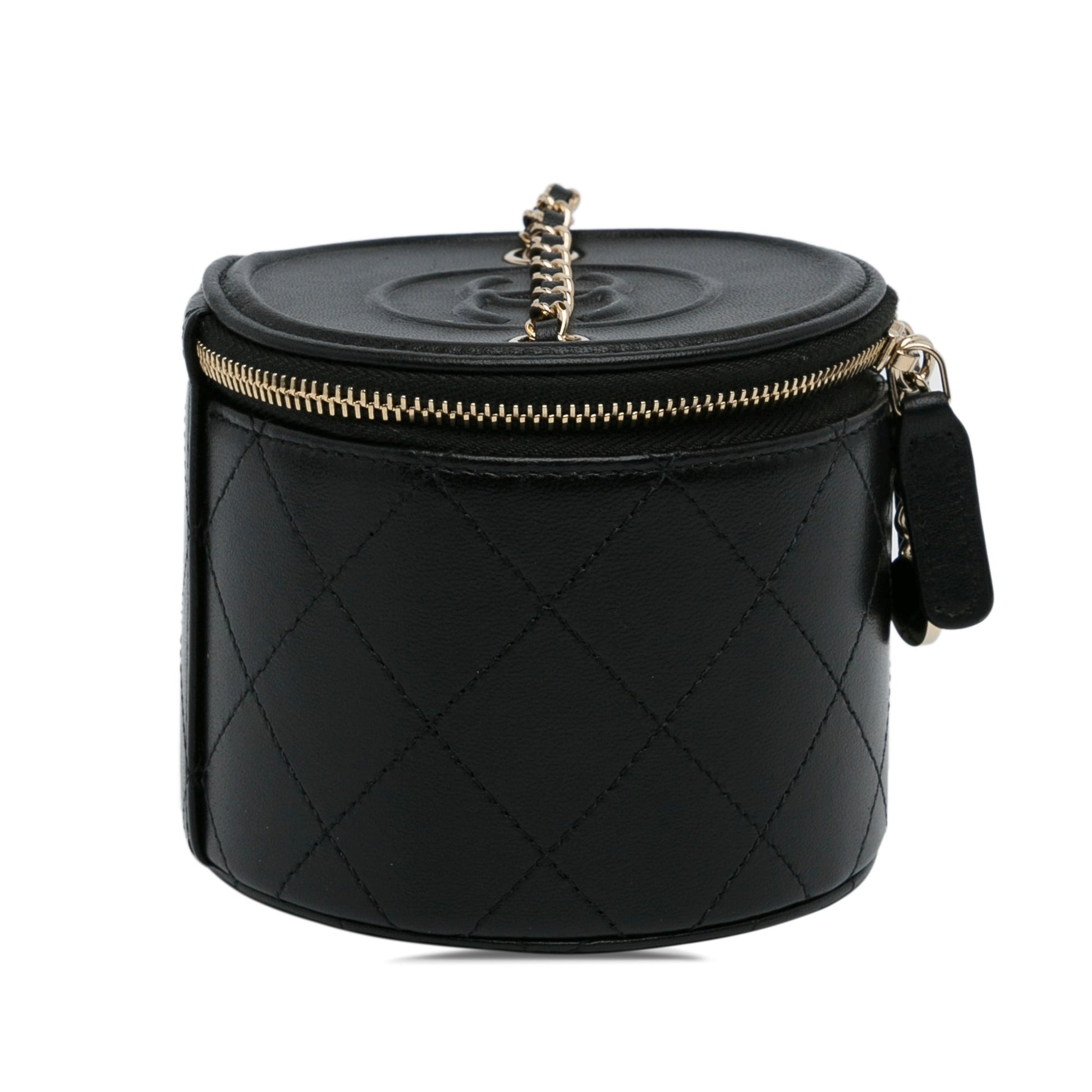 Product Details: Black Chanel CC Round Vanity Bag. This vanity bag features a quilted leather body, a leather woven chain strap, and a zip around closure. 3.5" L x 4.1" W x 3.9" D. Serial number 31399907.