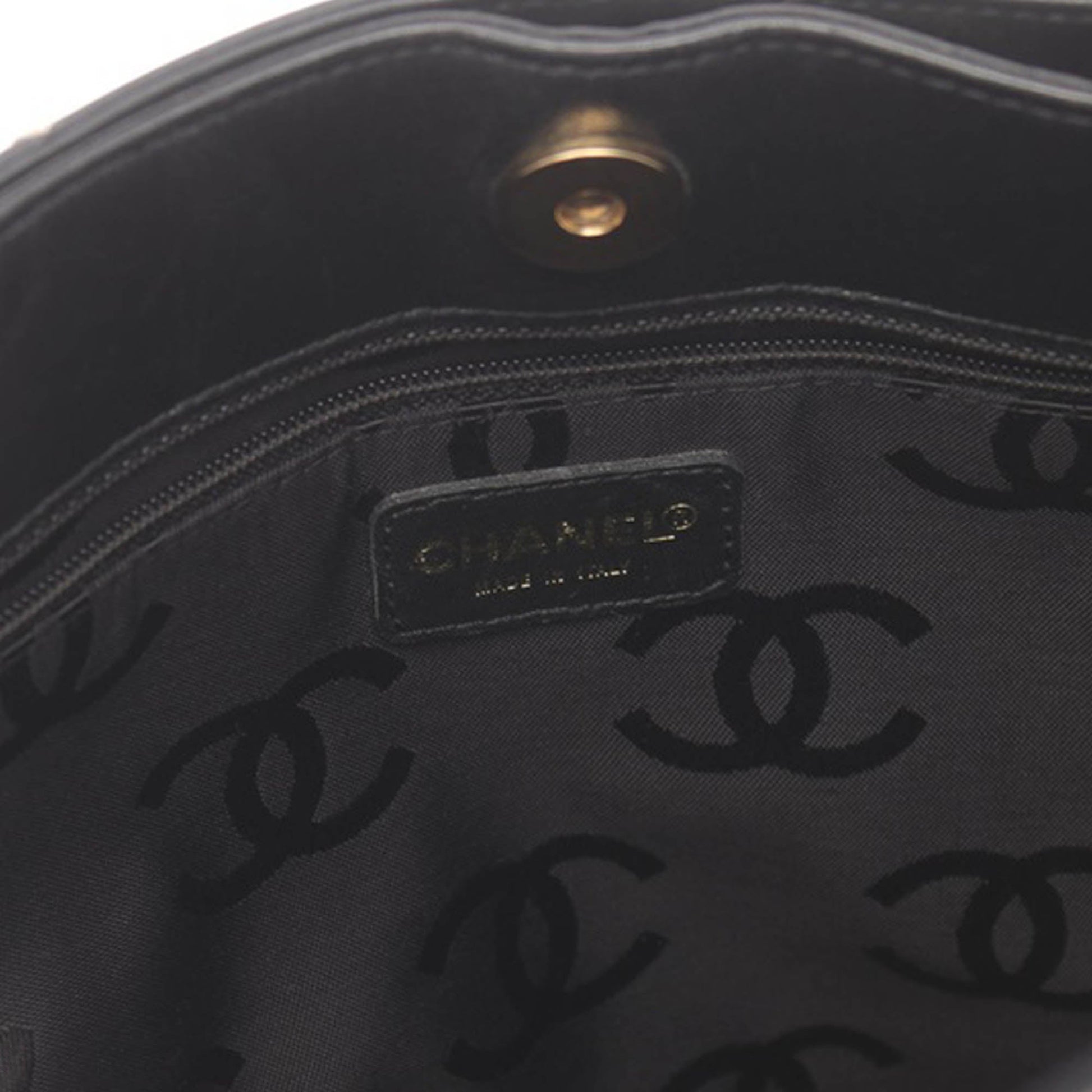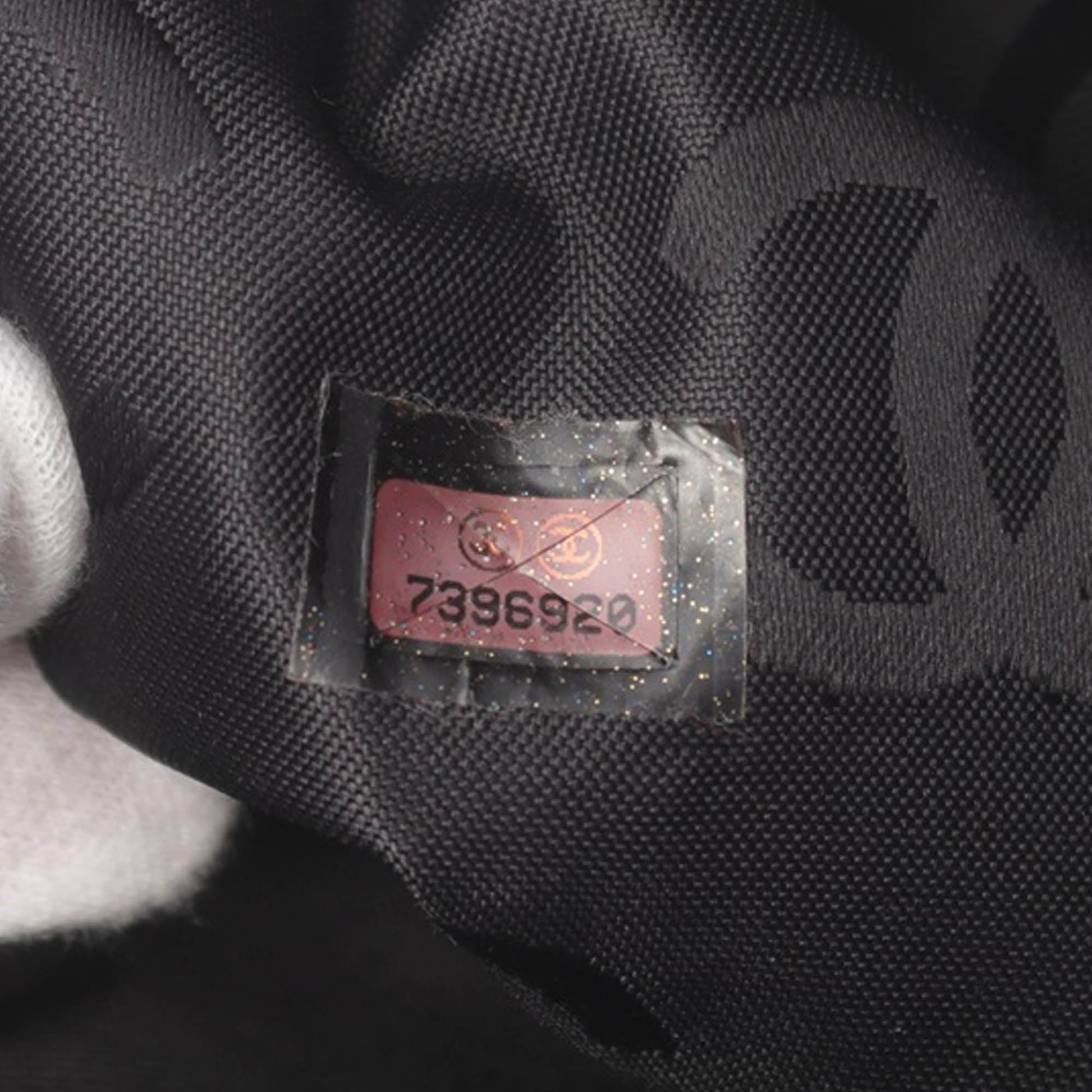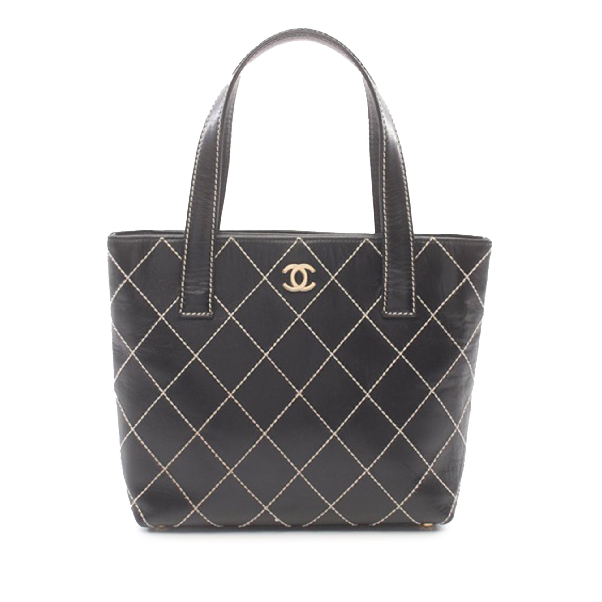 Product Details: Black Chanel CC Wild Stitch Calfskin Handbag. This handbag features a quilted leather body, flat leather handles, an open top with magnetic snap closure, and interior zip and slip pockets. 9.1" L x 9.4" W x 3.1" D. Serial number 7396920.