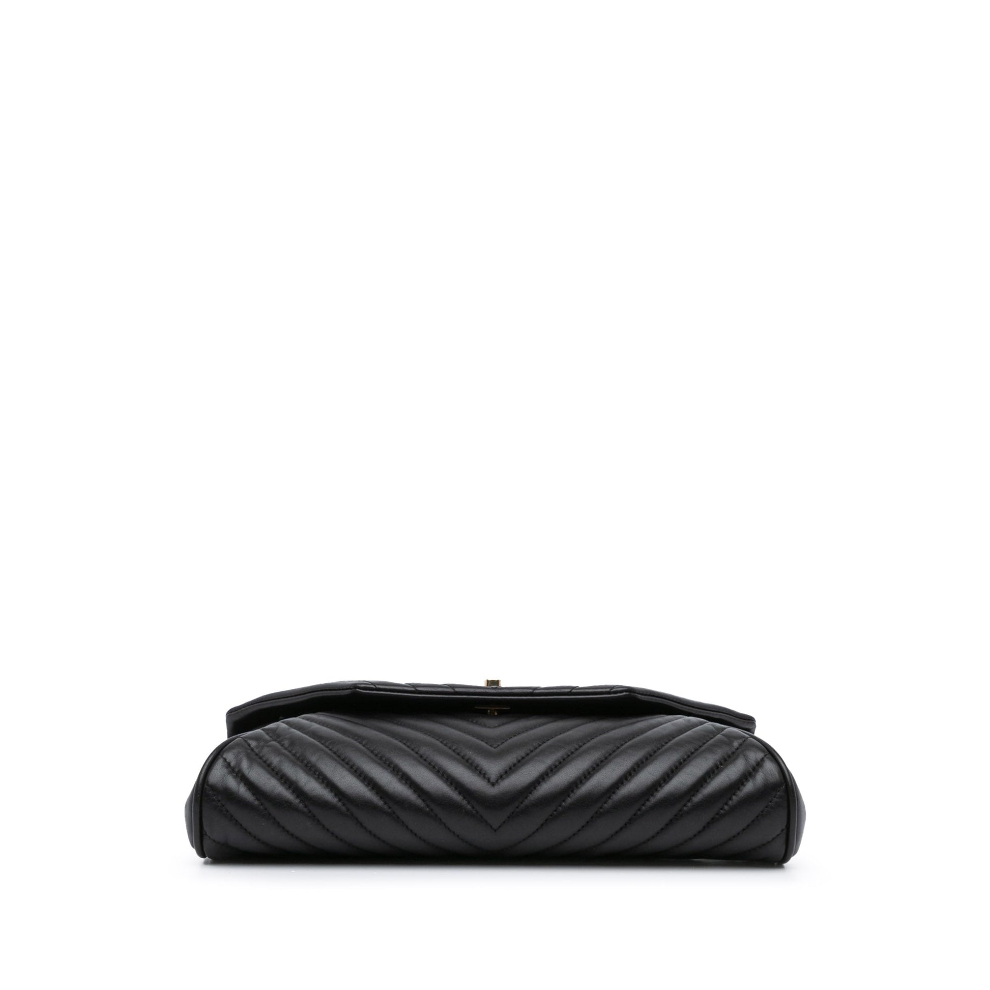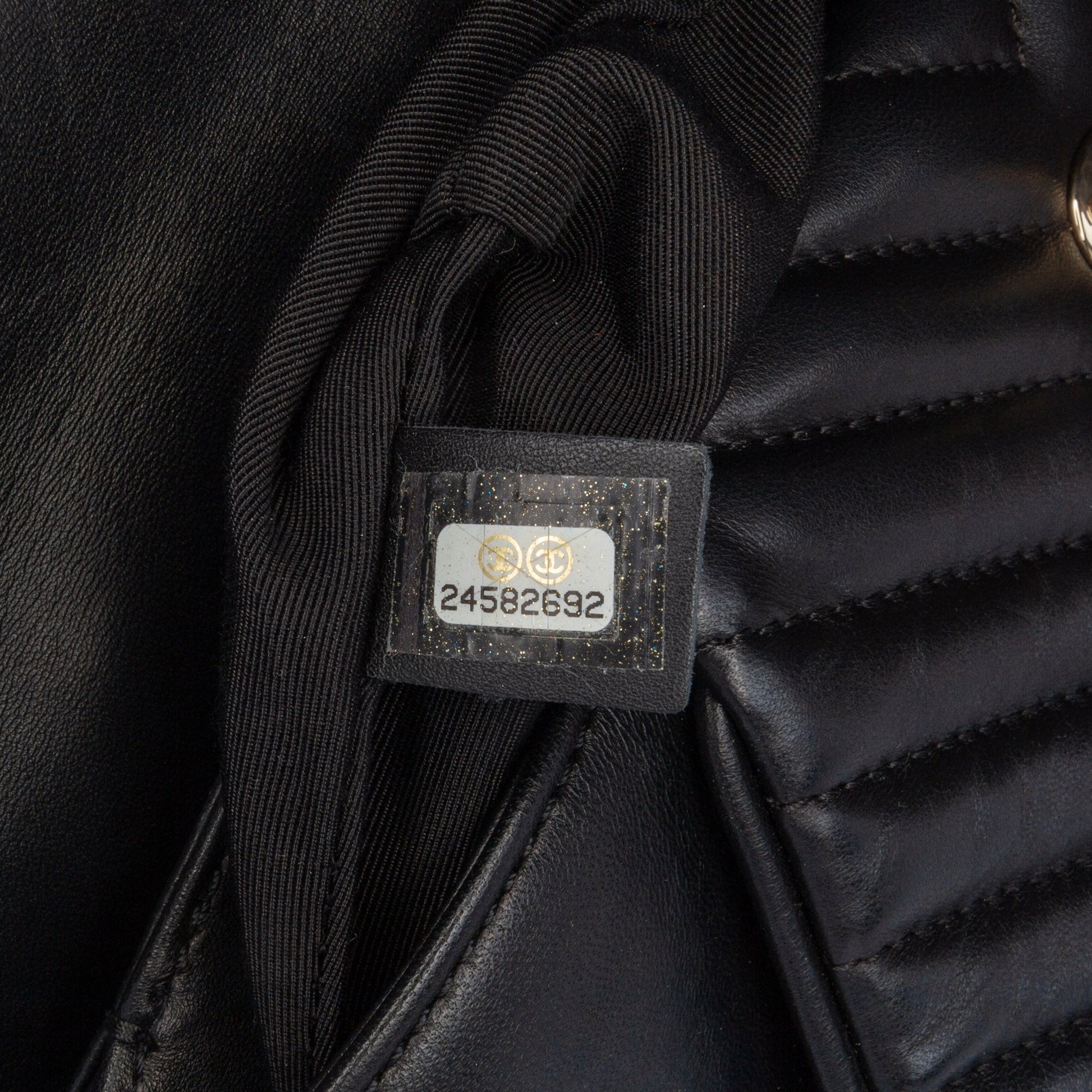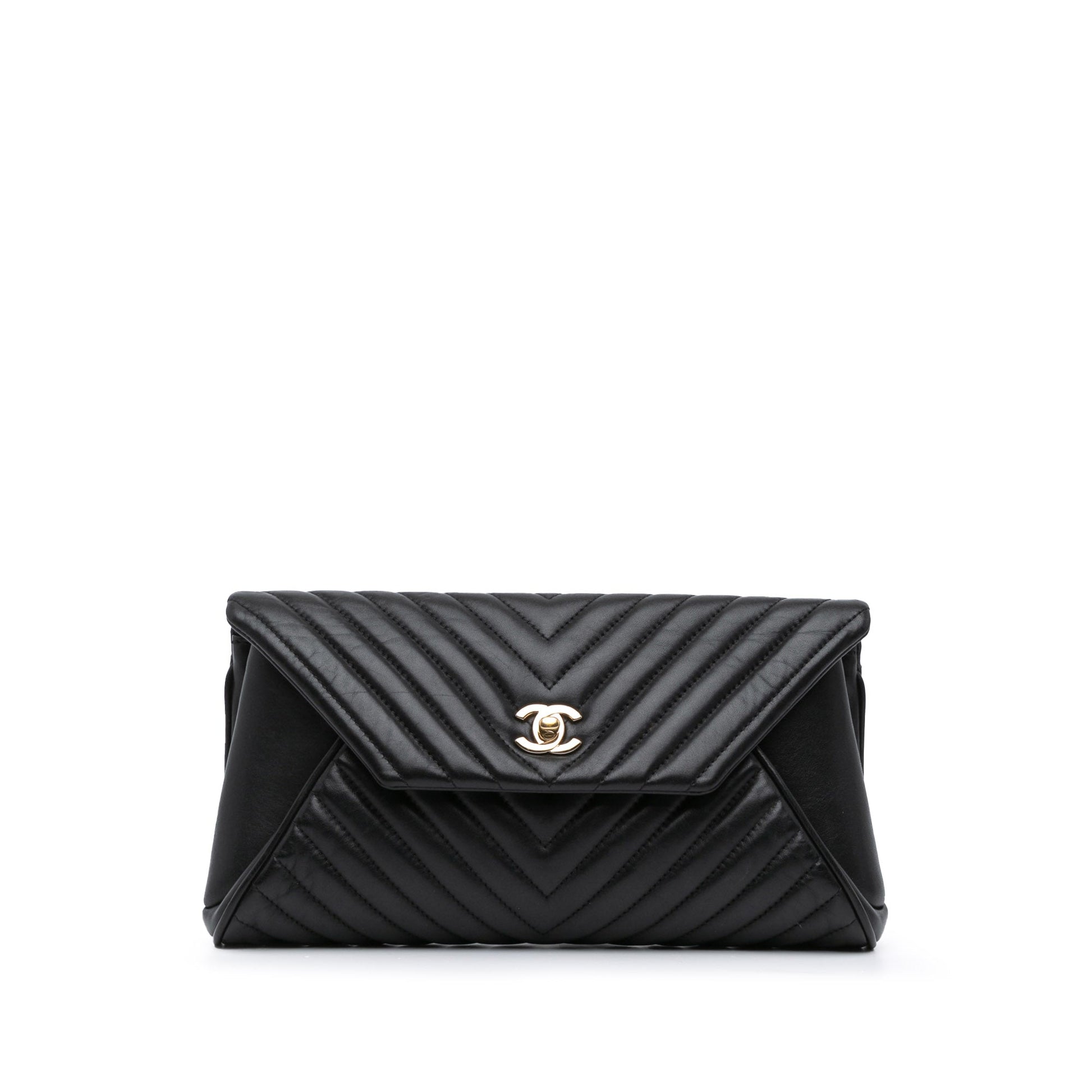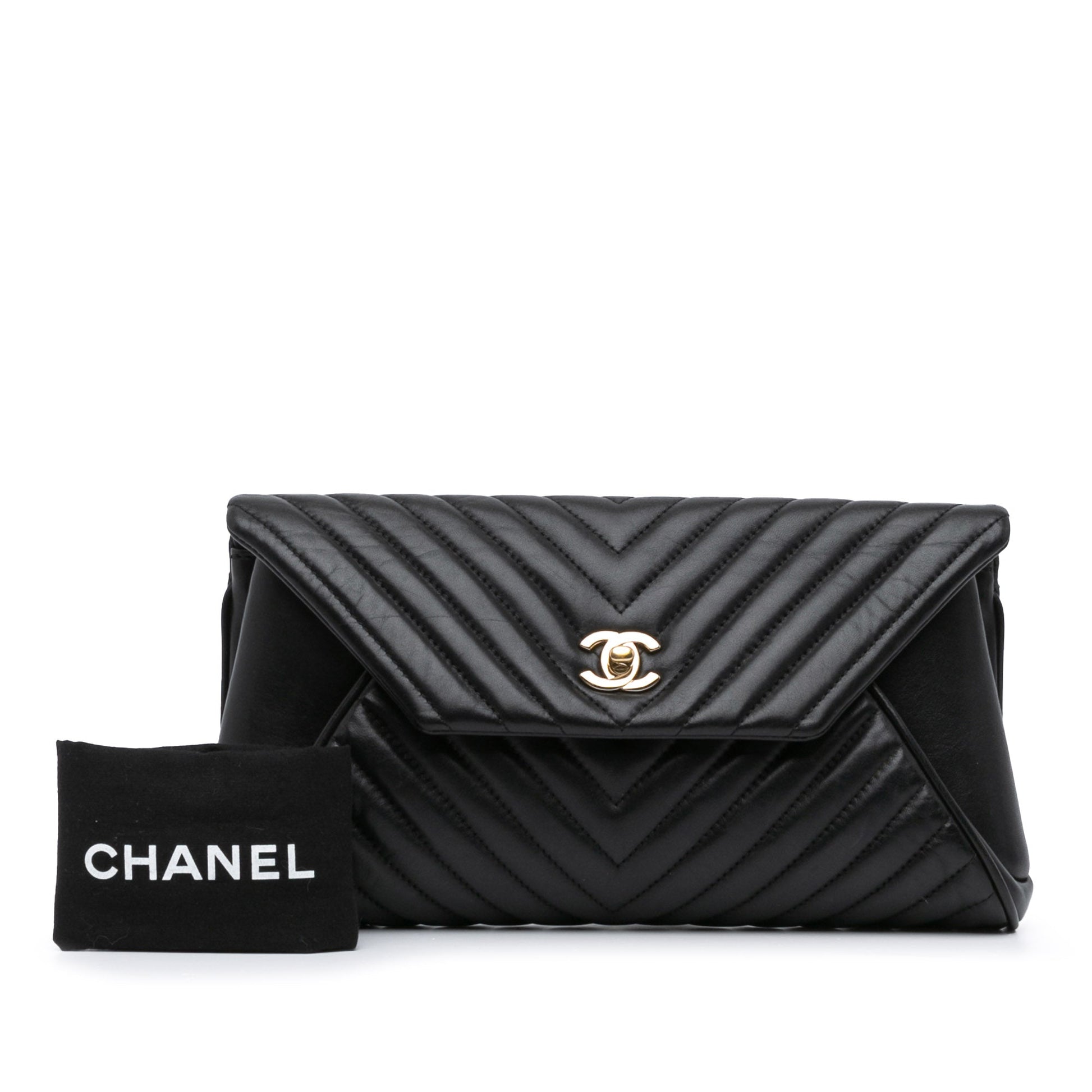 Product Details: Black Chanel Chevron Lambskin Fold Up Again Clutch. The Fold Up Again clutch features a quilted lambskin leather body, a front flap with turn-lock closure, and an interior slip pocket. 7.5" L x 12.2" W x 2.4" D. Serial number 24582692.