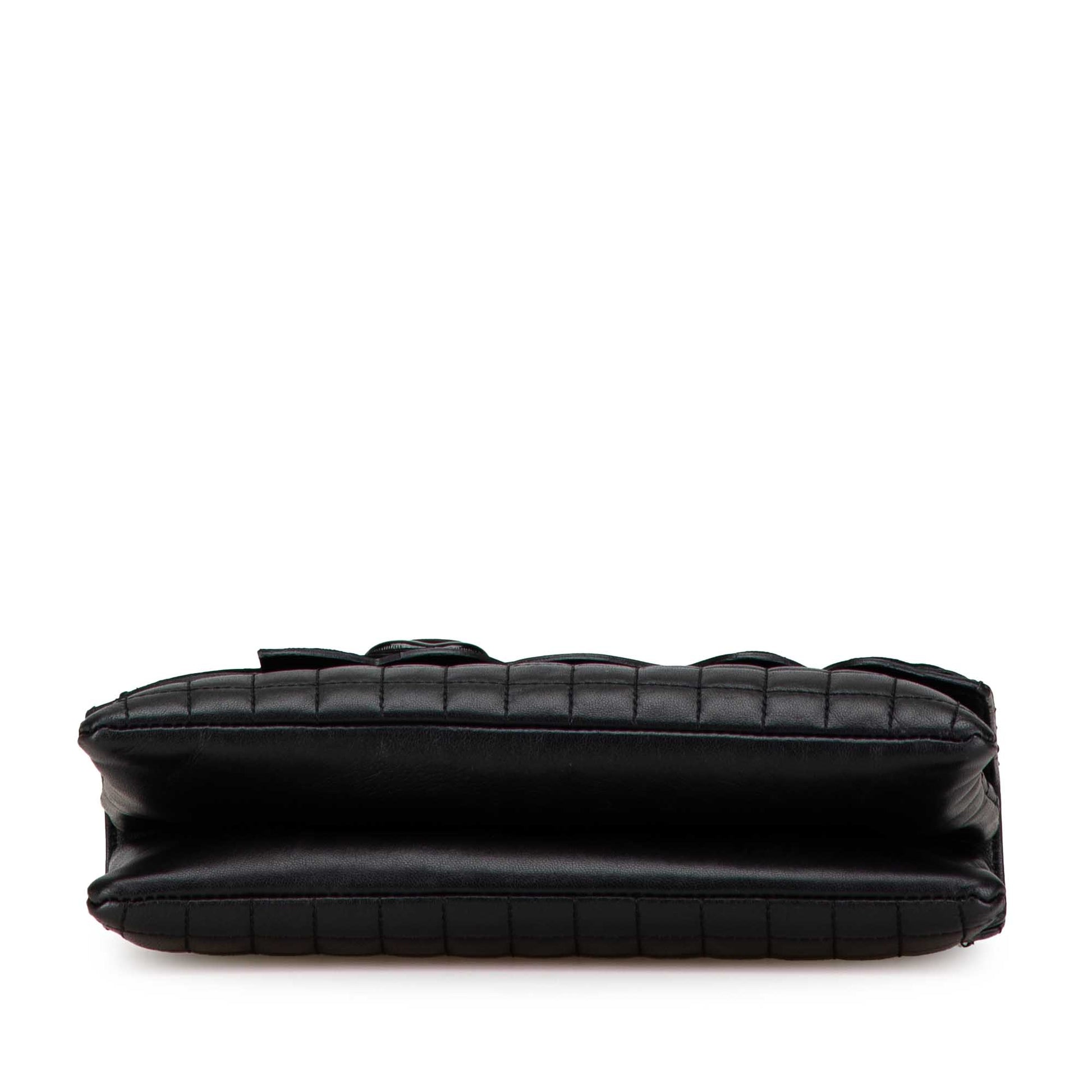 Product Details: Black Chanel Choco Bar Calfskin Camellia No. 5 CC Shoulder Bag. This shoulder bag features a quilted leather body, leather woven chain strap, a front flap with magnetic closure, interior slip compartments, and an interior zip pocket. 5.9" L x 9.3" W x 1.6" D. Serial number 10272935.