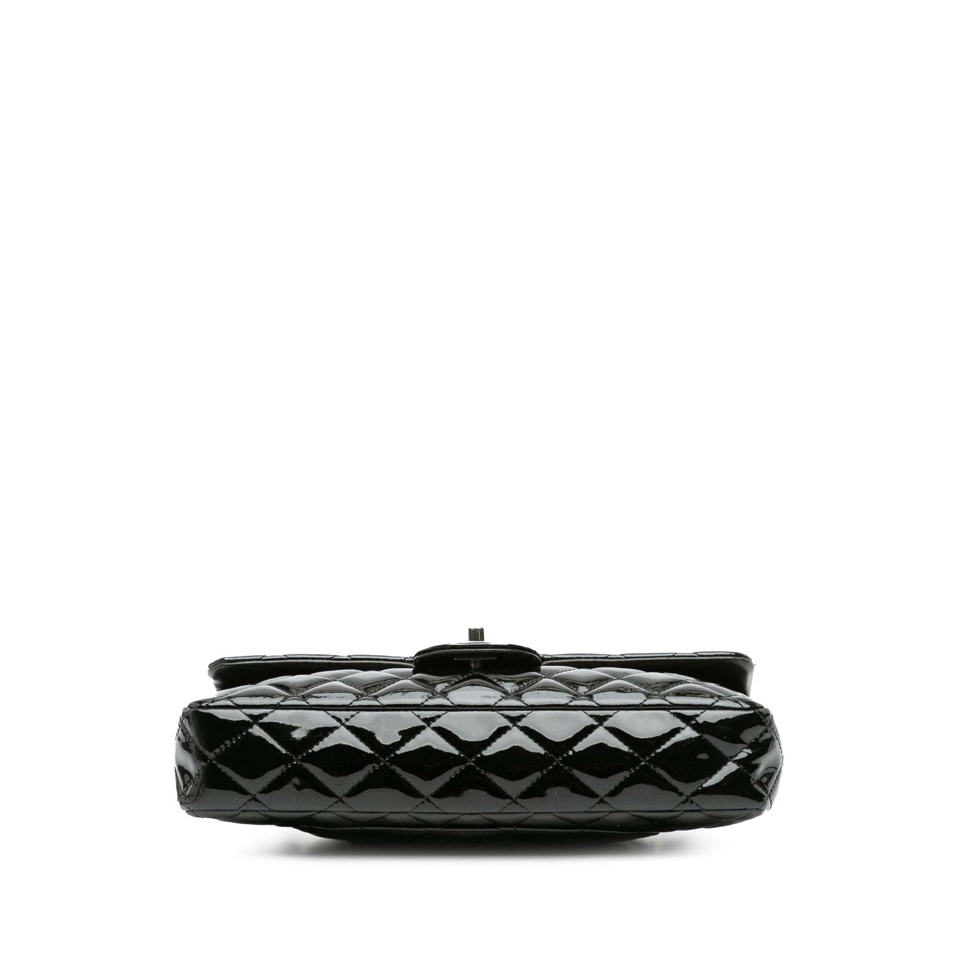 Product Details: Black Chanel Classic Patent East West Single Flap Shoulder Bag. The East West Classic Flap features a quilted patent leather body, leather woven chain straps, a front flap with a CC turn lock closure, an exterior back slip pocket, and interior zip and slip pockets. 5.1" L x 9.8" W x 2" D, 9.1" drop. Serial number 14378929.