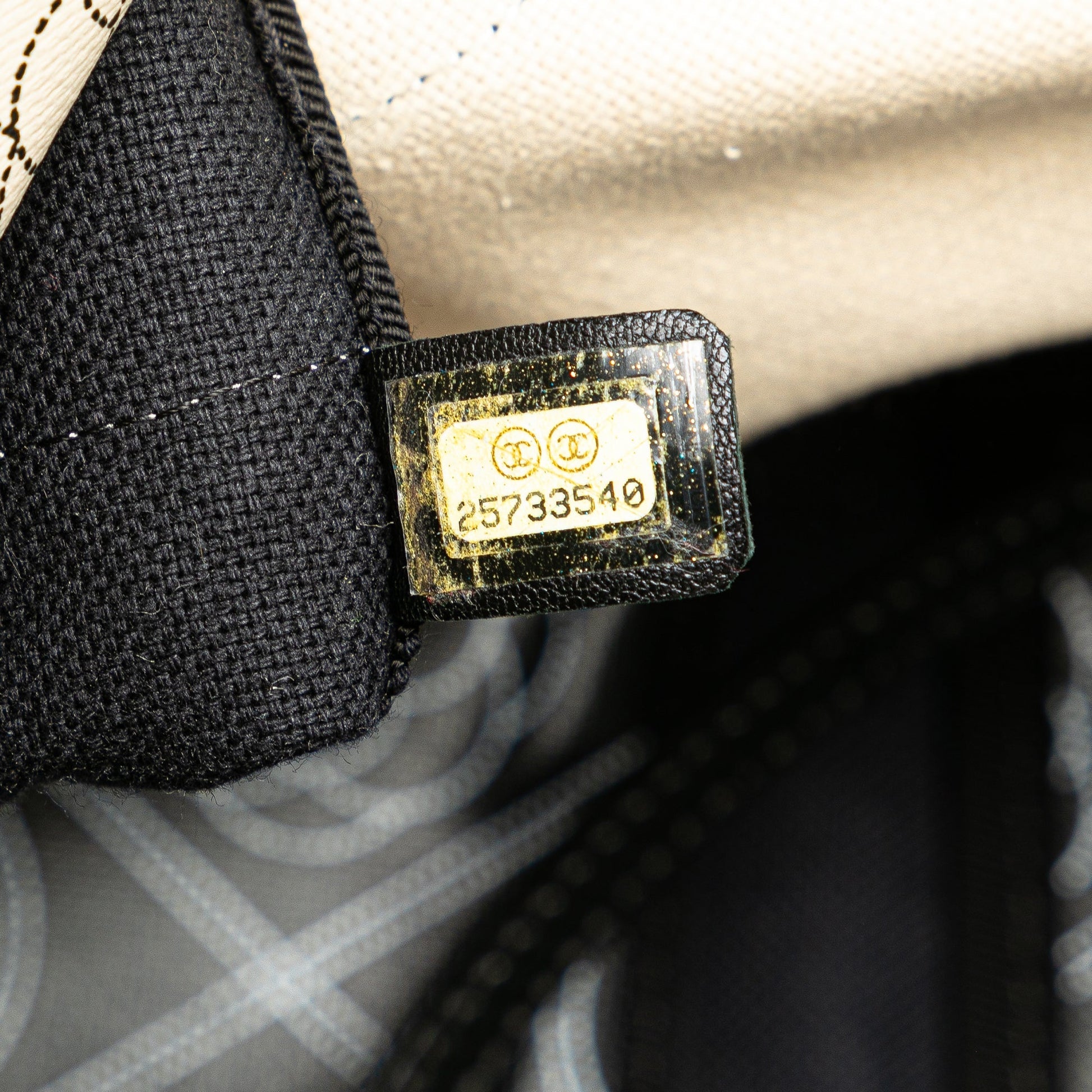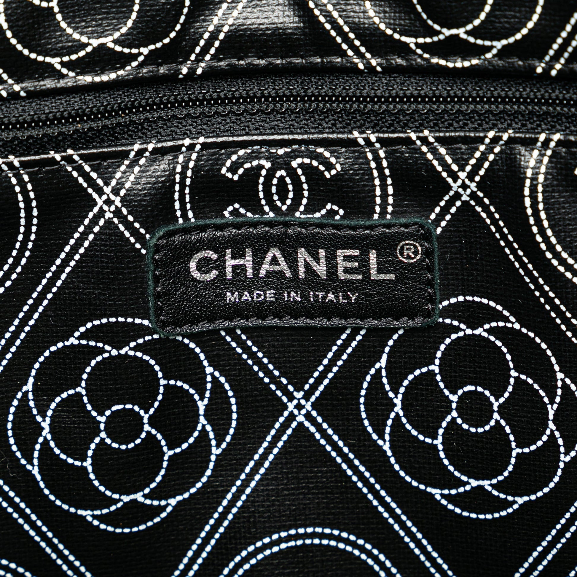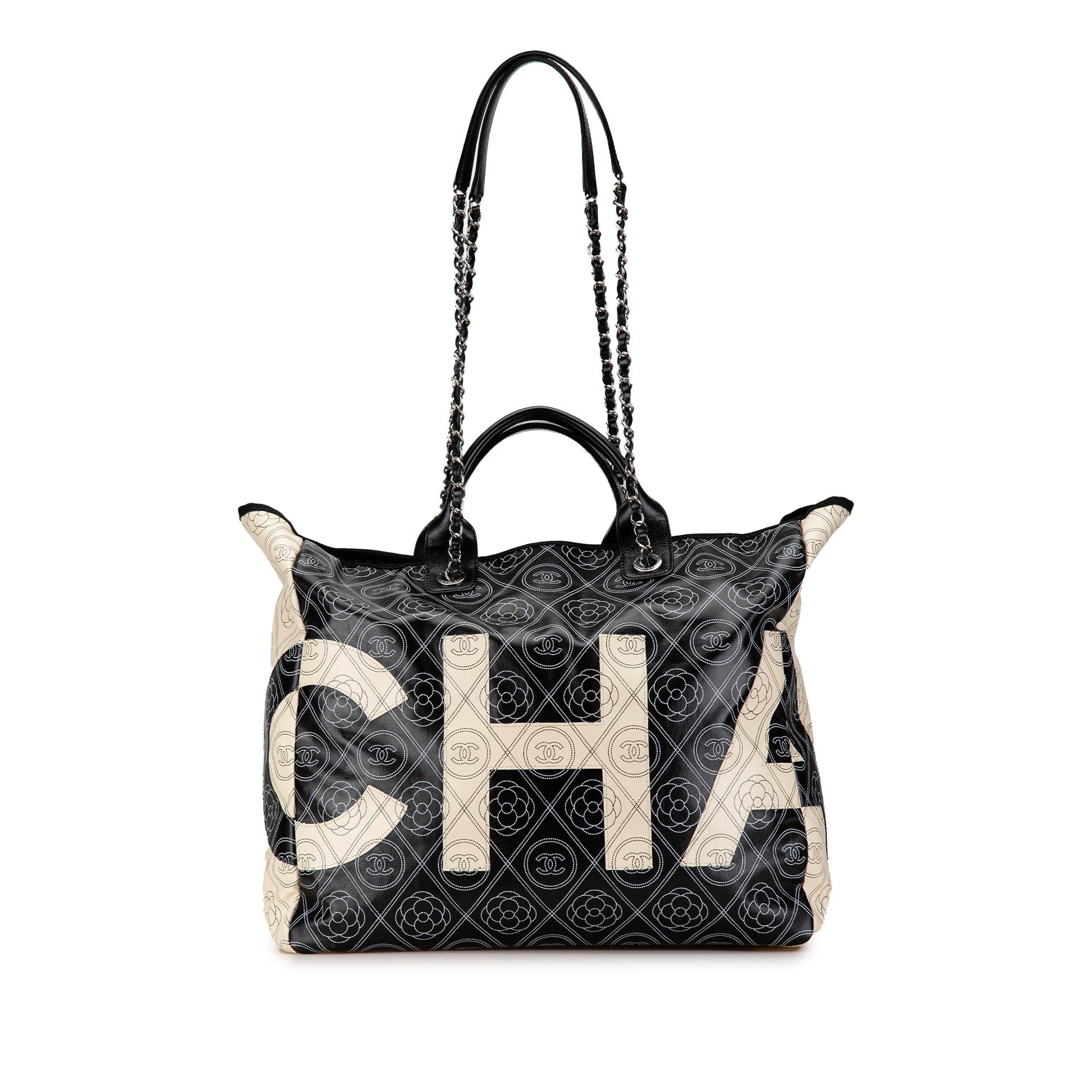 Product Details: Black Chanel Coated Canvas Camellia Logo Deauville Shopping Tote Satchel. This satchel features a printed coated canvas body, flat leather handles, leather woven chain straps with leather shoulder guards, an open top, and interior zip pockets. 13.4" L x 15" W x 5.5" D, 3.5" drop. Serial number 25733540.