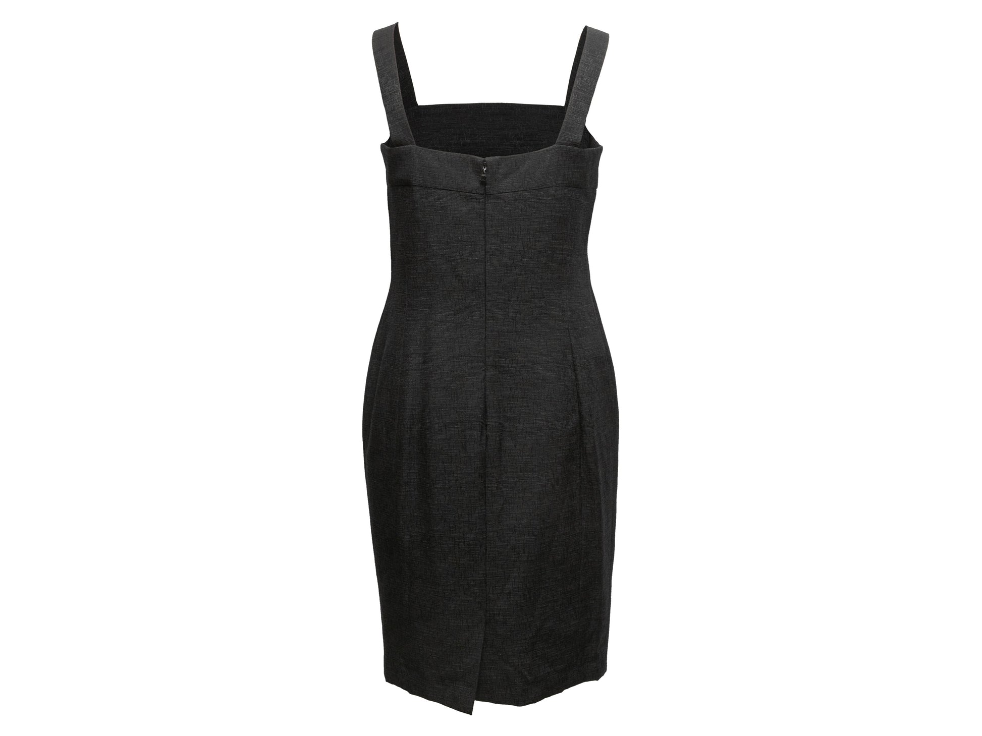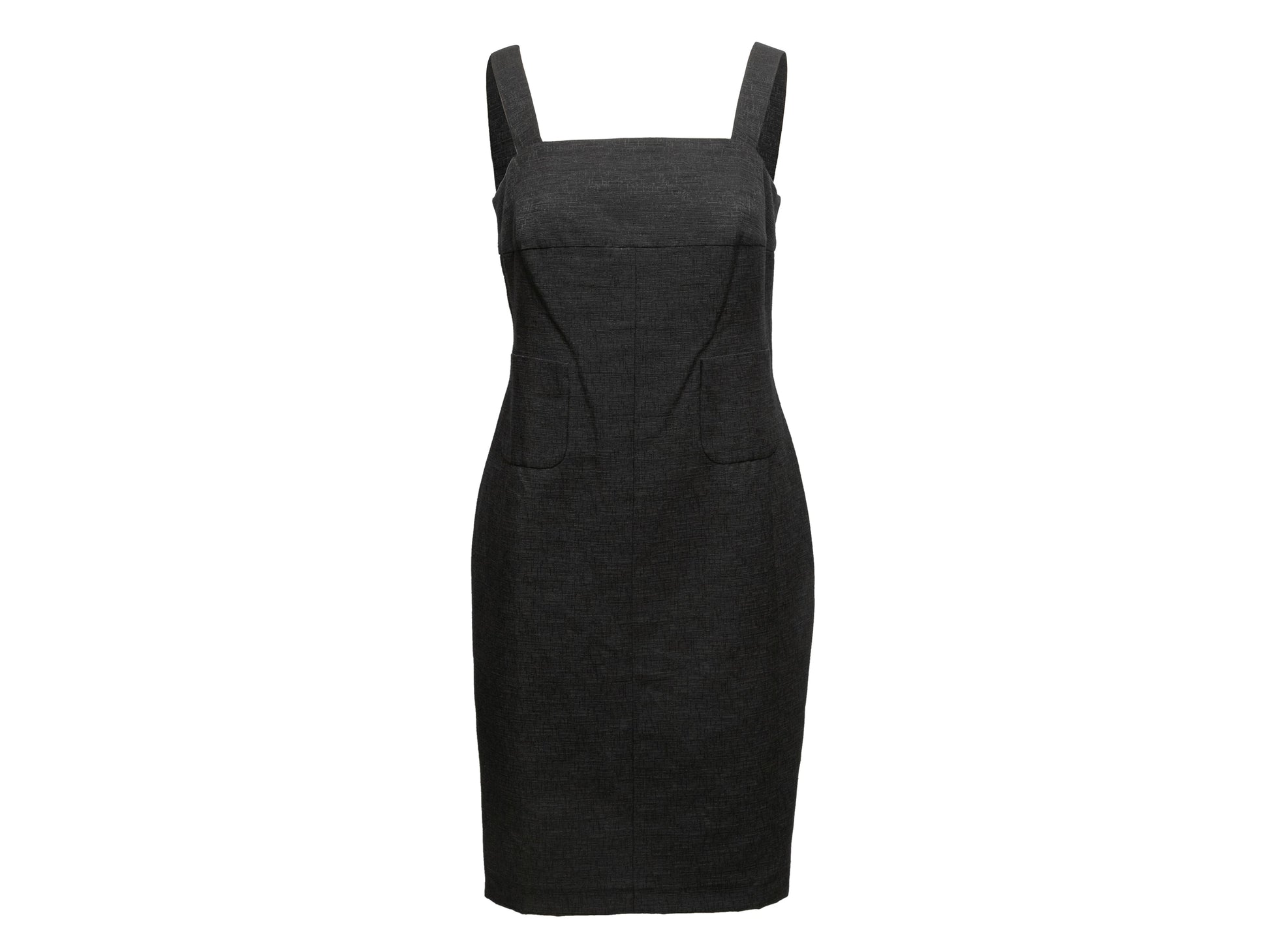 Product Details:Black sleeveless knee-length dress by Chanel. From the Cruise 2012 Collection. Square neckline. Dual front patch pockets. Zip closure at back. 31" bust, 32" waist, 38" length, 11.75" shoulder width.