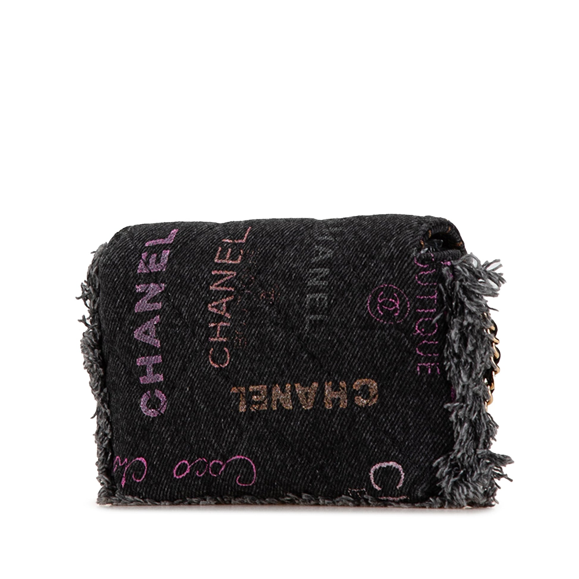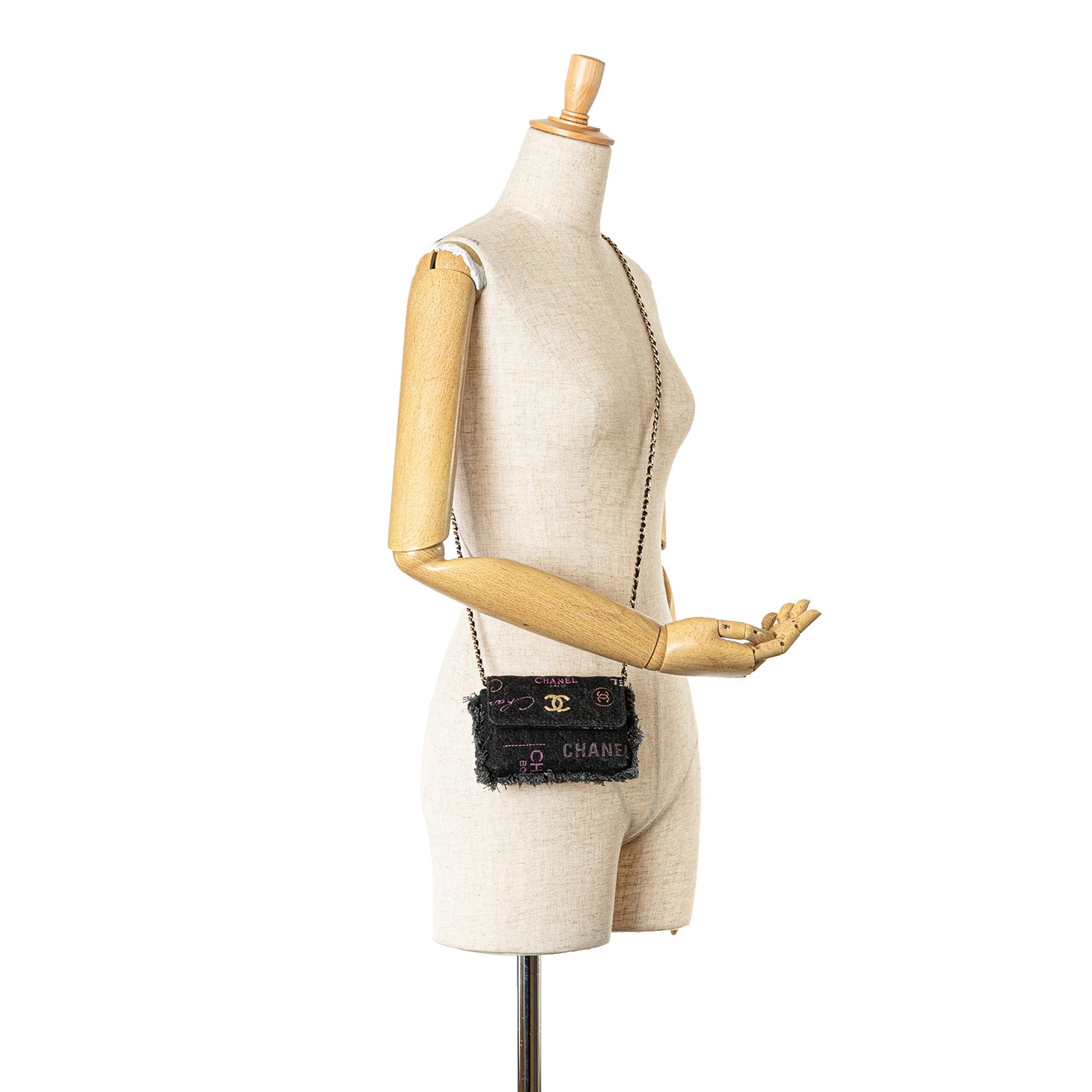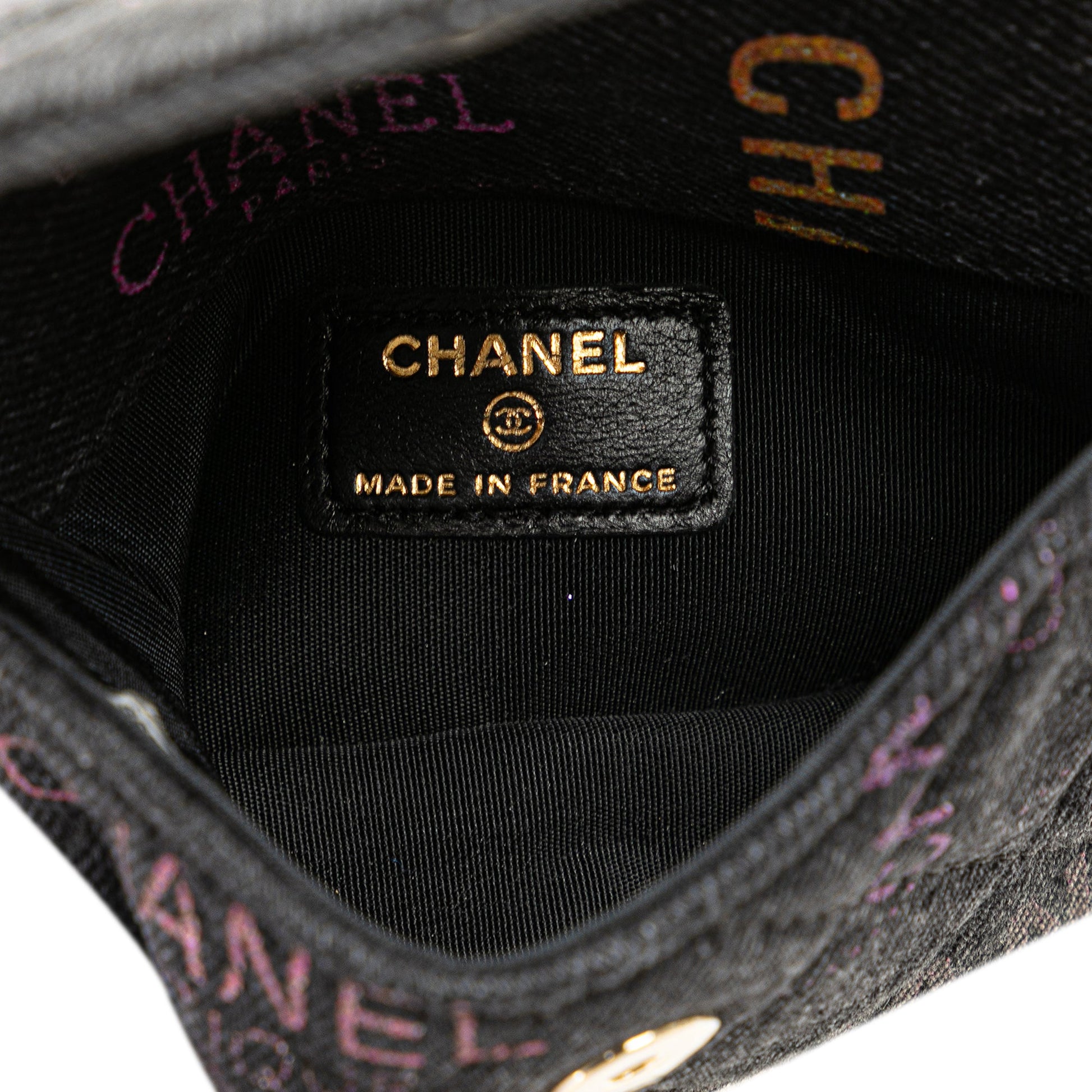 Product Details: Black Chanel Denim Mood Clutch with Chain Crossbody Bag. This crossbody features a denim body, leather woven chain strap, a front flap with magnetic closure, and an interior slip pocket. 3.7" L x 5.9" W x 0.8" D. Serial number 31944238.