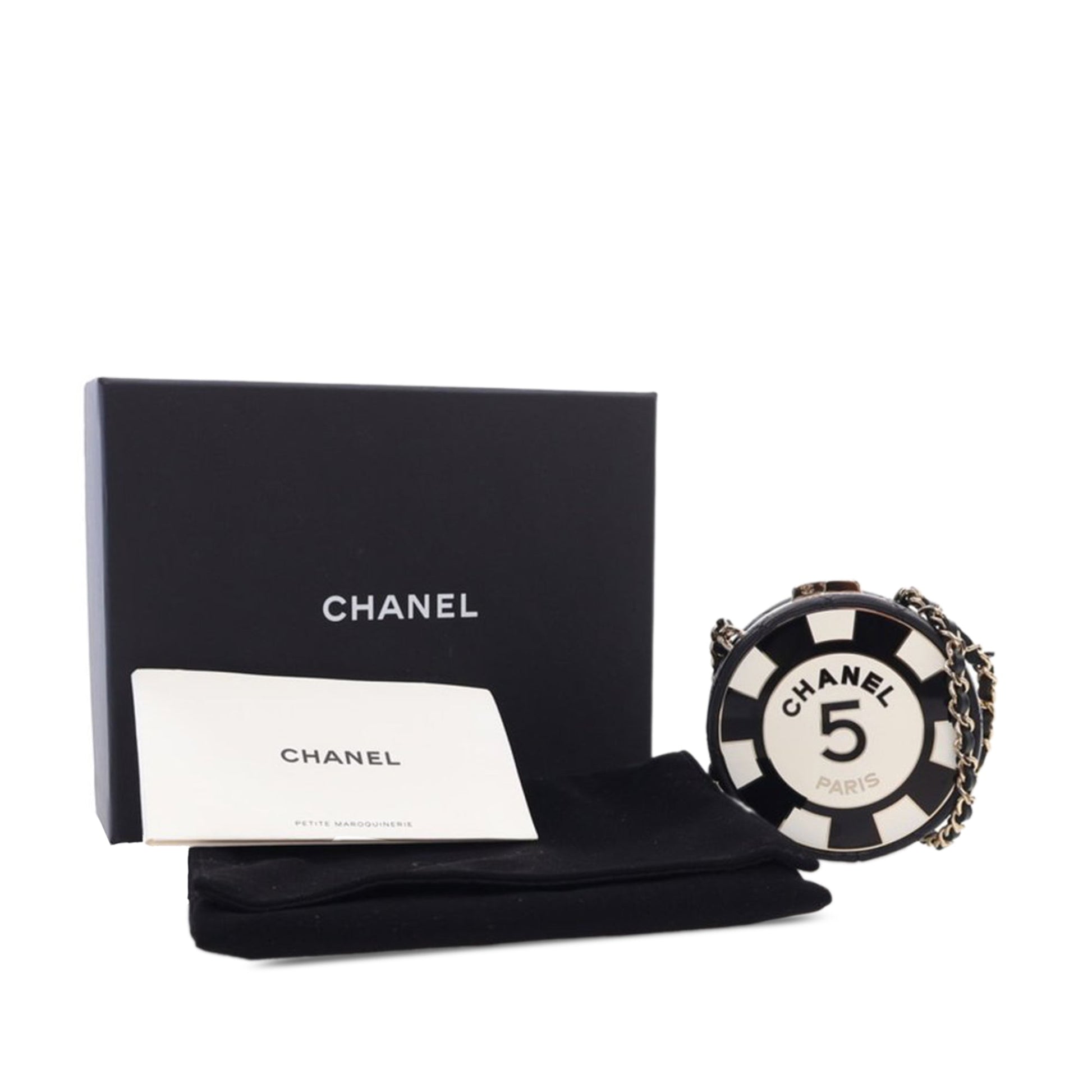 Product Details: Black Chanel Enamel and Quilted Lambskin Round Poker Chip Clutch with Chain Crossbody Bag. This crossbody bag features a enamel and lambskin body, a leather woven chain strap, a top clasp closure, and an interior mirror. 3.1" L x 3.1" W x 1.2" D.