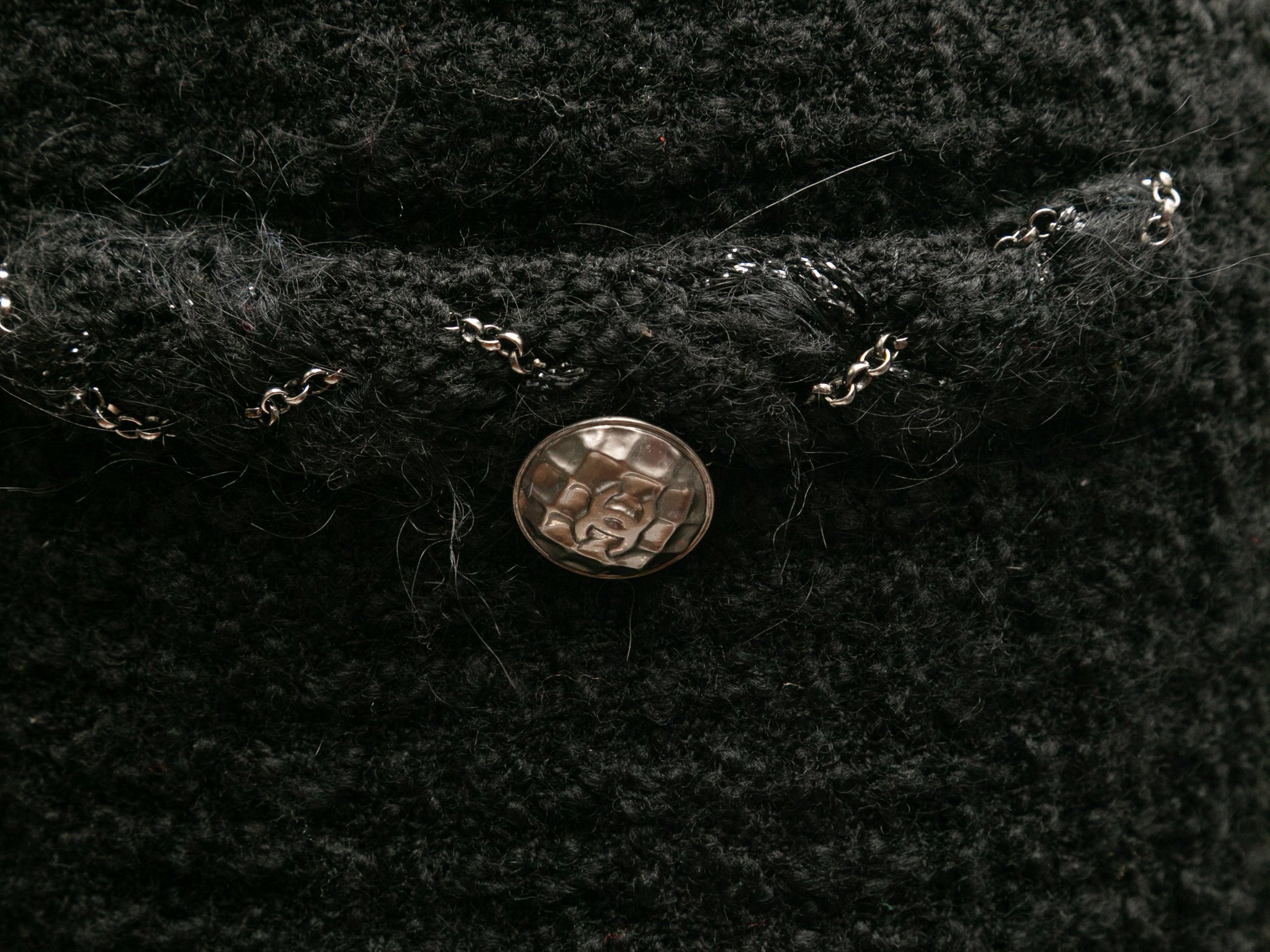 Product Details:Black wool tweed high-waisted pencil skirt by Chanel. Silver-tone hardware. Dual front pockets. Zip closure at back. 34" waist, 36" hips, 26" length.