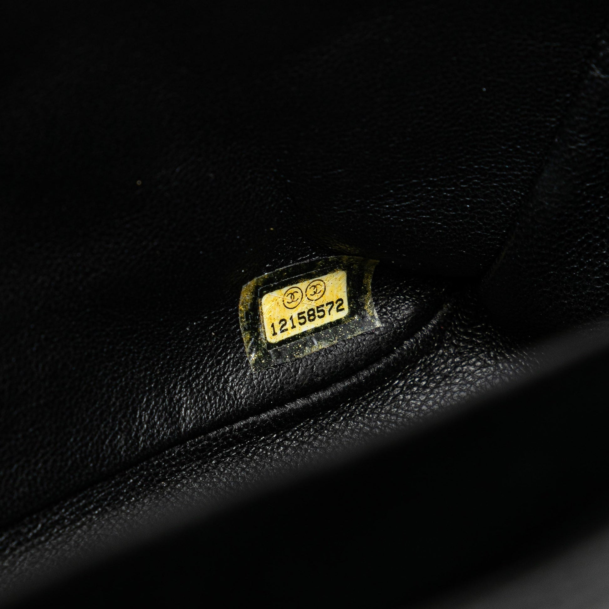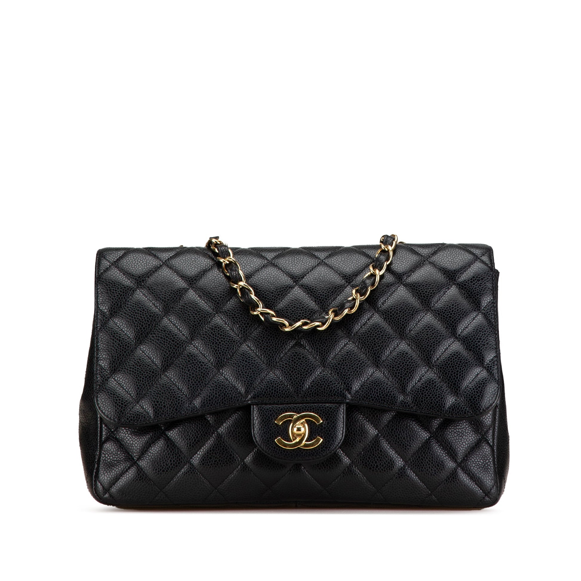 Product Details: Black Chanel Jumbo Classic Caviar Single Flap Shoulder Bag. The Classic Jumbo Single Flap features a quilted caviar leather body, leather woven chain shoulder straps, a front flap with double Cs and twist lock closure, an exterior back slip pocket, and interior zip and slip pockets. 7.3" L x 12.2" W x 3.5" D. Serial number 12158572.
