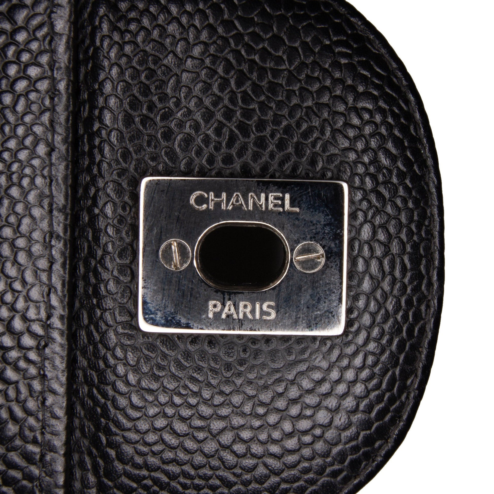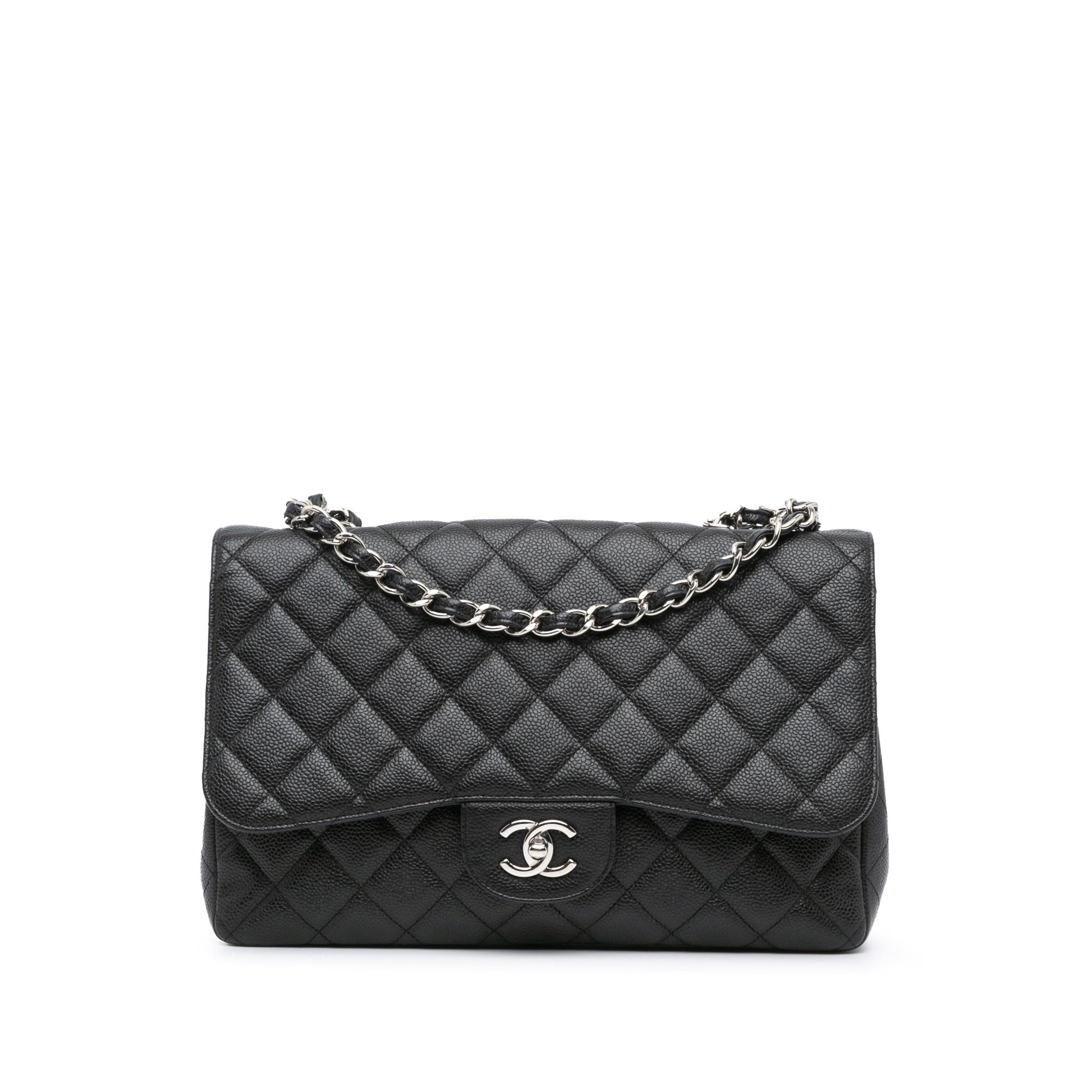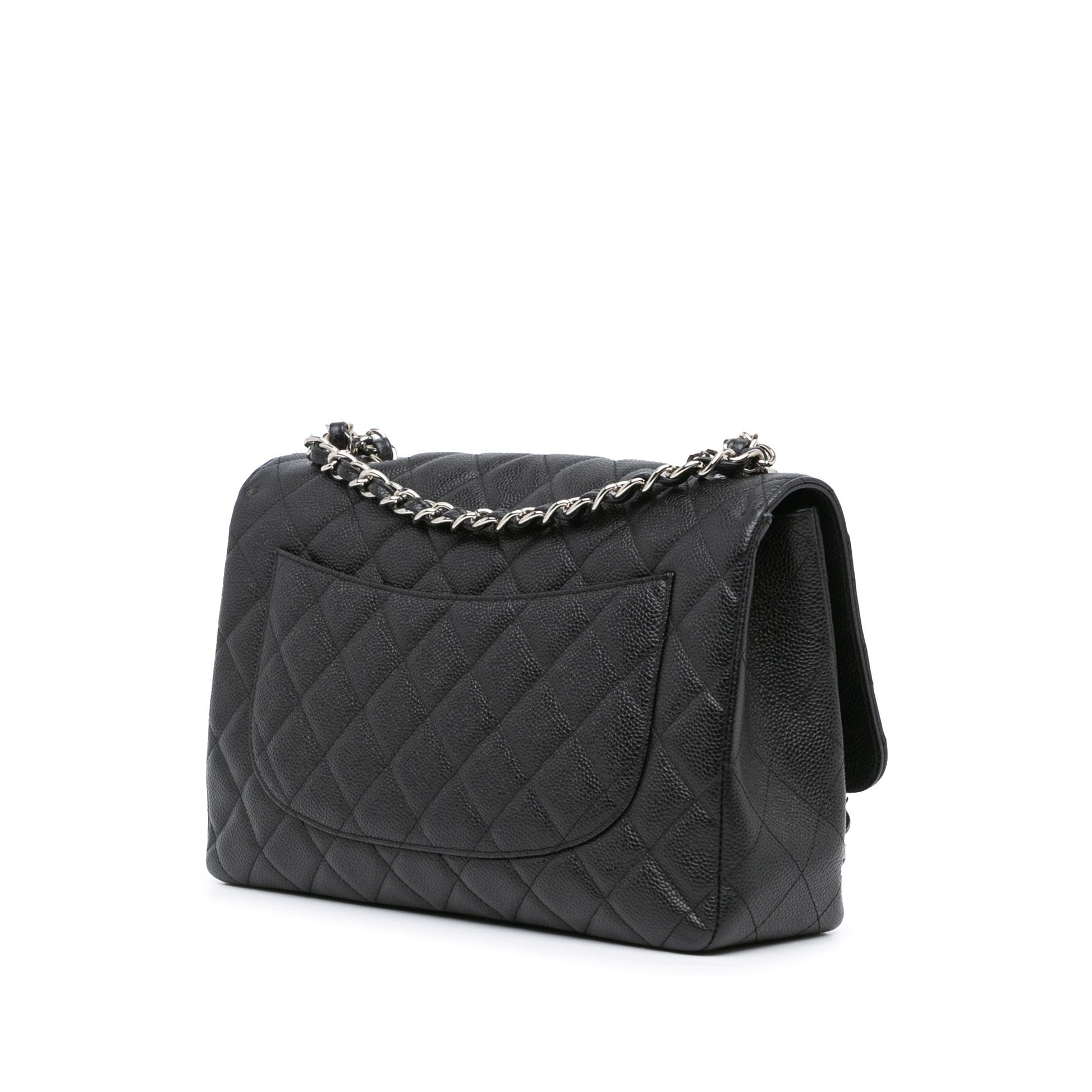 Product Details: Black Chanel Jumbo Classic Caviar Single Flap Shoulder Bag. The Classic Jumbo Single Flap features a quilted caviar leather body, leather woven chain shoulder straps, a front flap with double Cs and twist lock closure, an exterior back slip pocket, and interior zip and slip pockets. Interior lining is repainted. 8.3" L x 12.2" W x 3.5" D, 13.4" drop. Serial number 13180187.