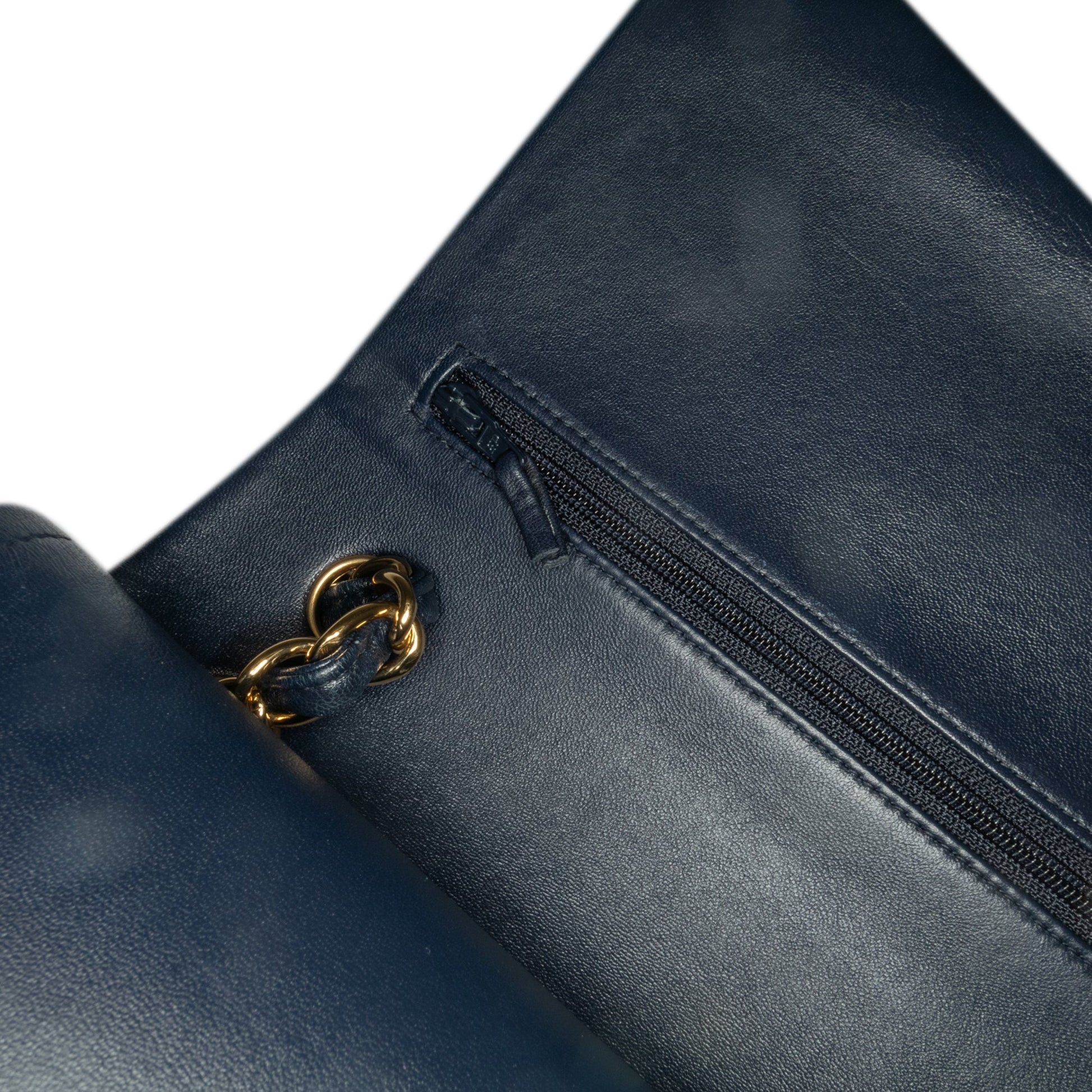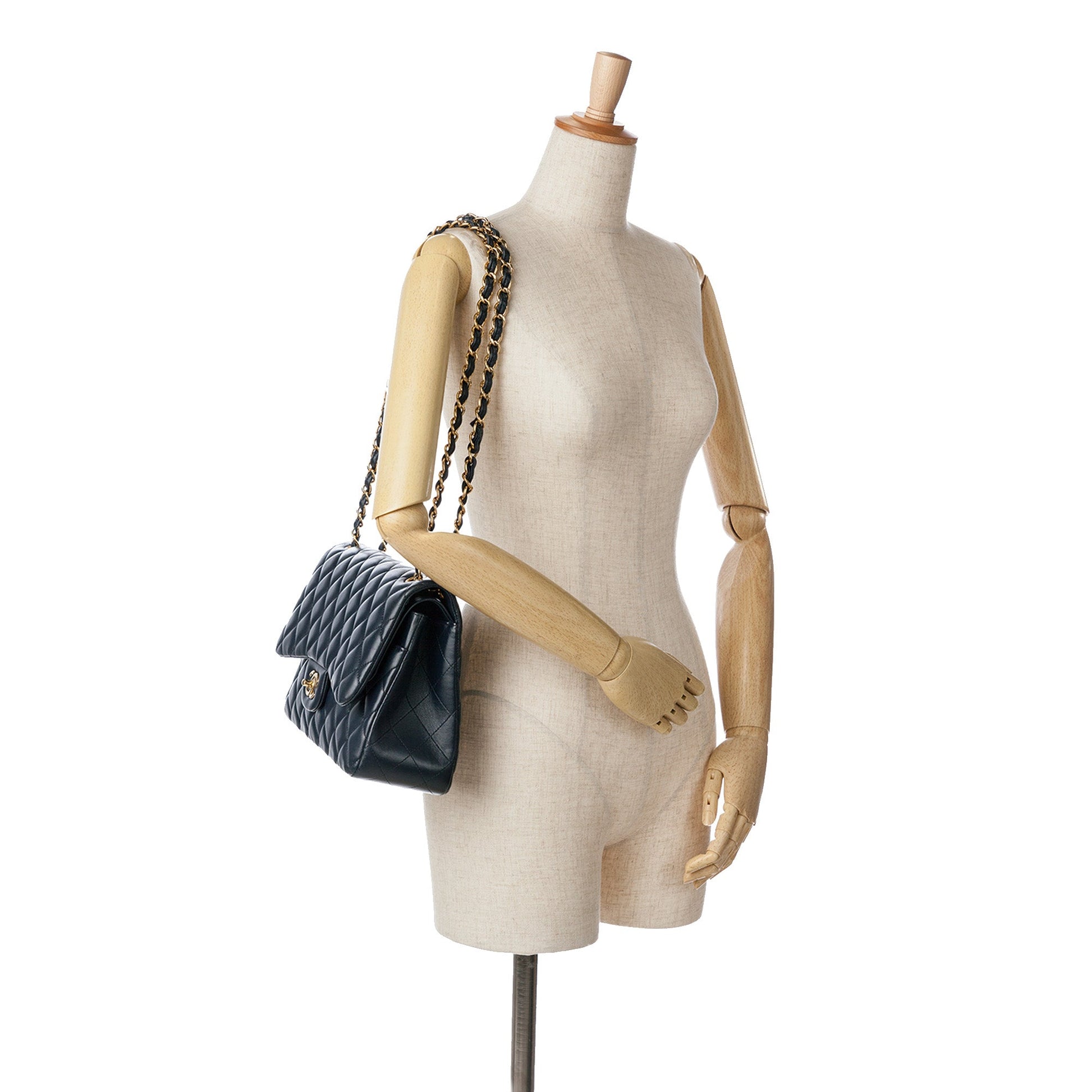 Product Details: Black Chanel Jumbo Classic Lambskin Double Flap Shoulder Bag. This shoulder bag features a quilted lambskin leather body, leather woven chain link straps, double front flaps with CC turn-lock closure, an exterior back slip pocket, and interior zip and slip pockets. This shoulder bag was repainted. 7.5" L x 11.8" W x 3.9" D, 13.4" drop. Serial number 21482279.