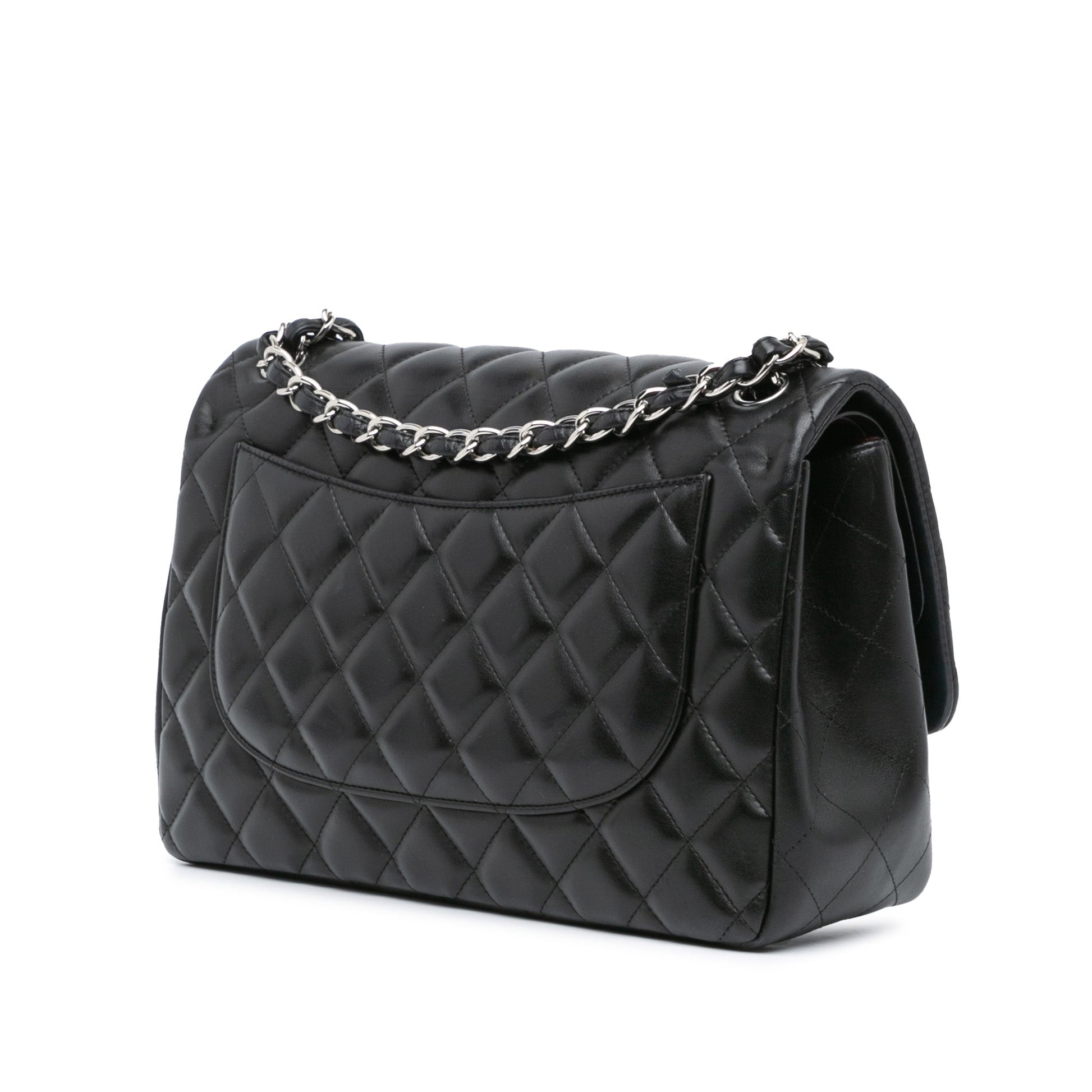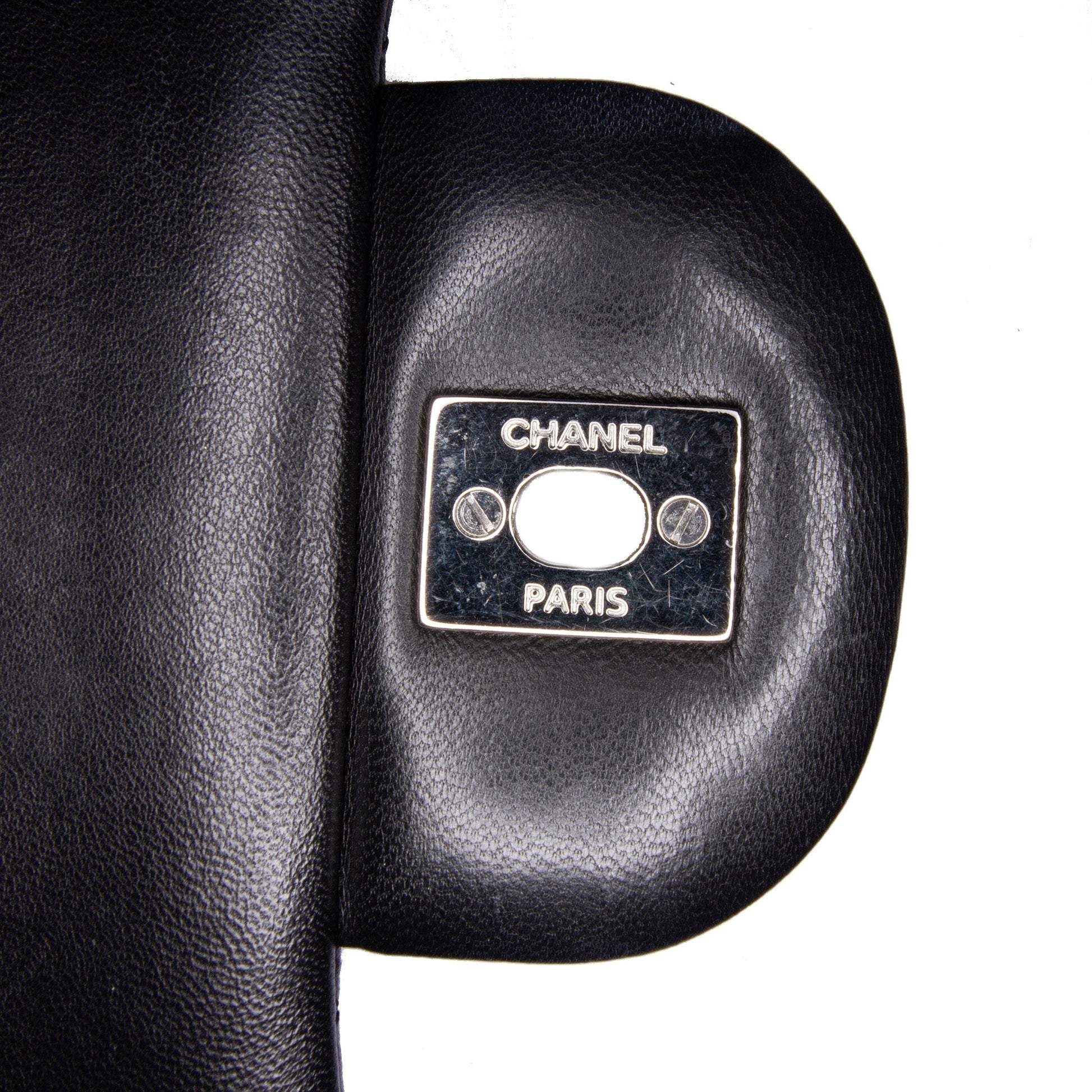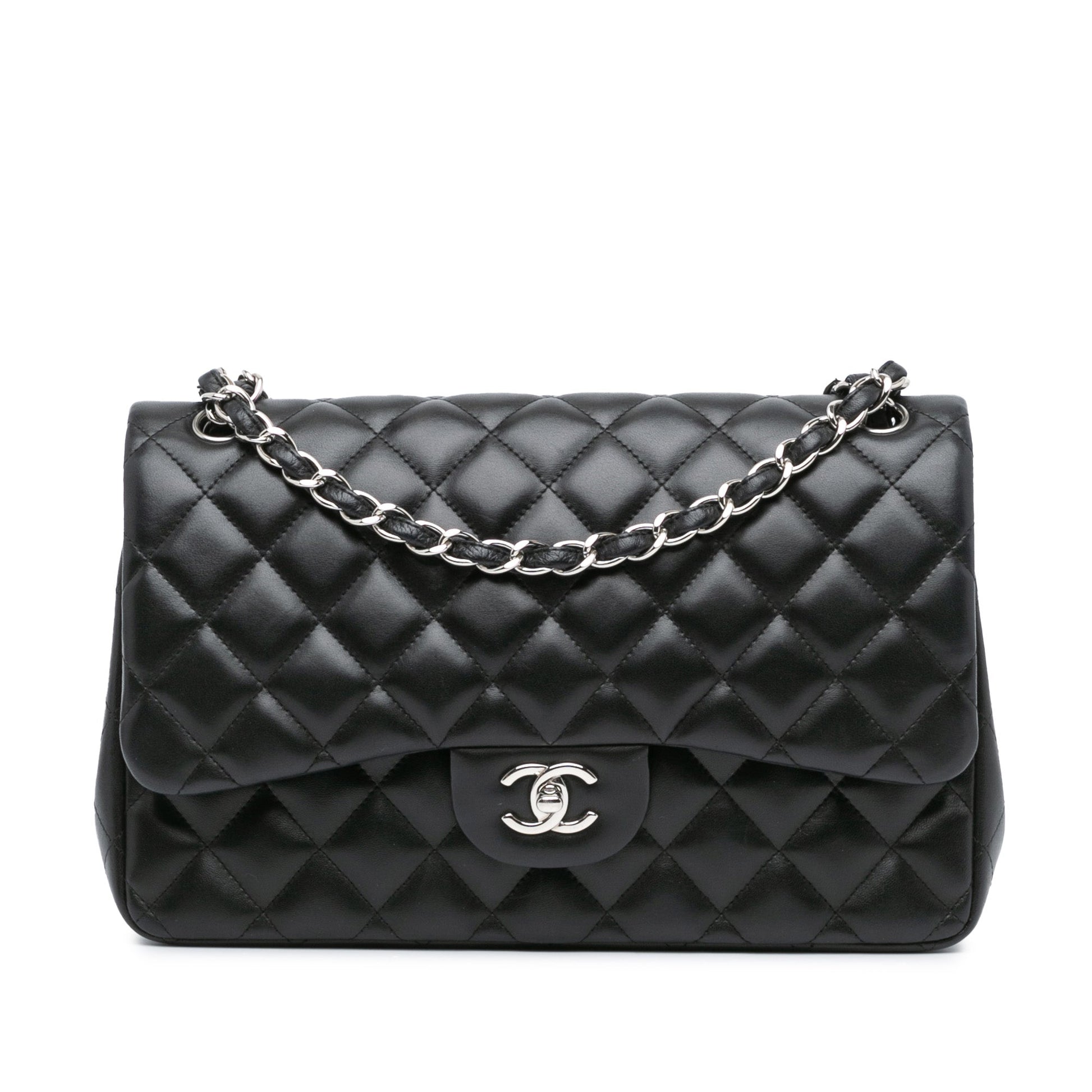 Product Details: Black Chanel Jumbo Classic Lambskin Double Flap Shoulder Bag. This shoulder bag features a quilted lambskin leather body, leather-woven chain link straps, double front flaps with CC turnlock closure, an exterior back slip pocket, and interior zip and slip pockets. 7.9" L x 11.8" W x 3.5" D, 13.4" drop. Serial number 16269025.