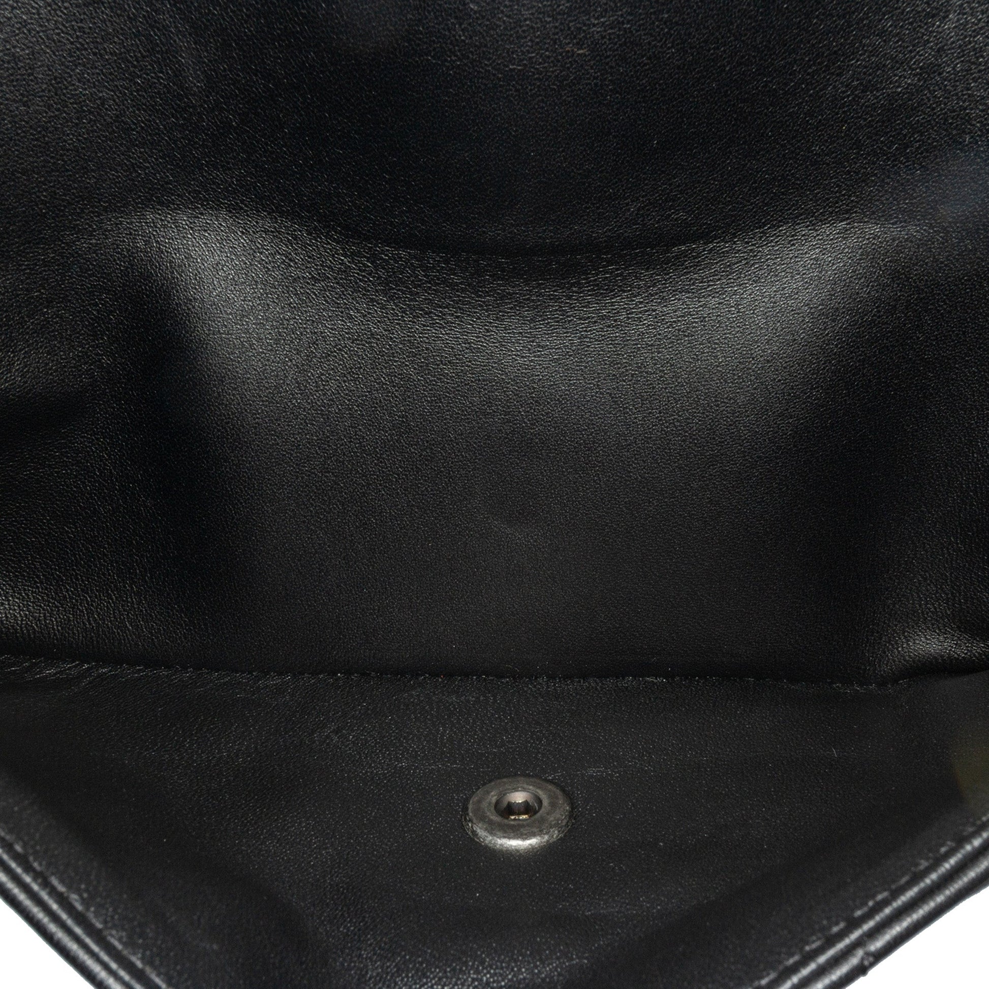 Product Details: Black Chanel Jumbo Classic Lambskin Double Flap Shoulder Bag. This shoulder bag features a quilted lambskin leather body, leather-woven chain link straps, double front flaps with CC turnlock closure, an exterior back slip pocket, and interior zip and slip pockets. 7.9" L x 11.8" W x 3.5" D, 13.8" drop. Serial number 20034559.