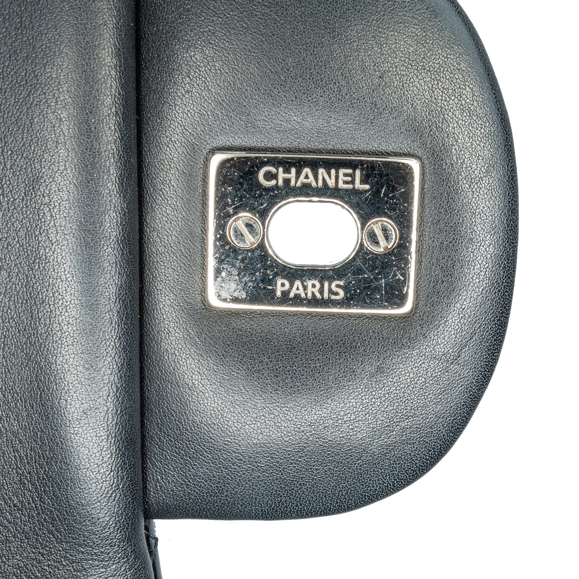Product Details: Black Chanel Jumbo Classic Patent Double Flap Shoulder Bag. This shoulder bag features a quilted patent leather body, leather woven chain link straps, double flaps with CC turn-lock closure, an exterior back slip pocket, and interior zip and slip pockets. 7.5" L x 11.8" W x 3.5" D, 13" drop. Serial number 18476341.