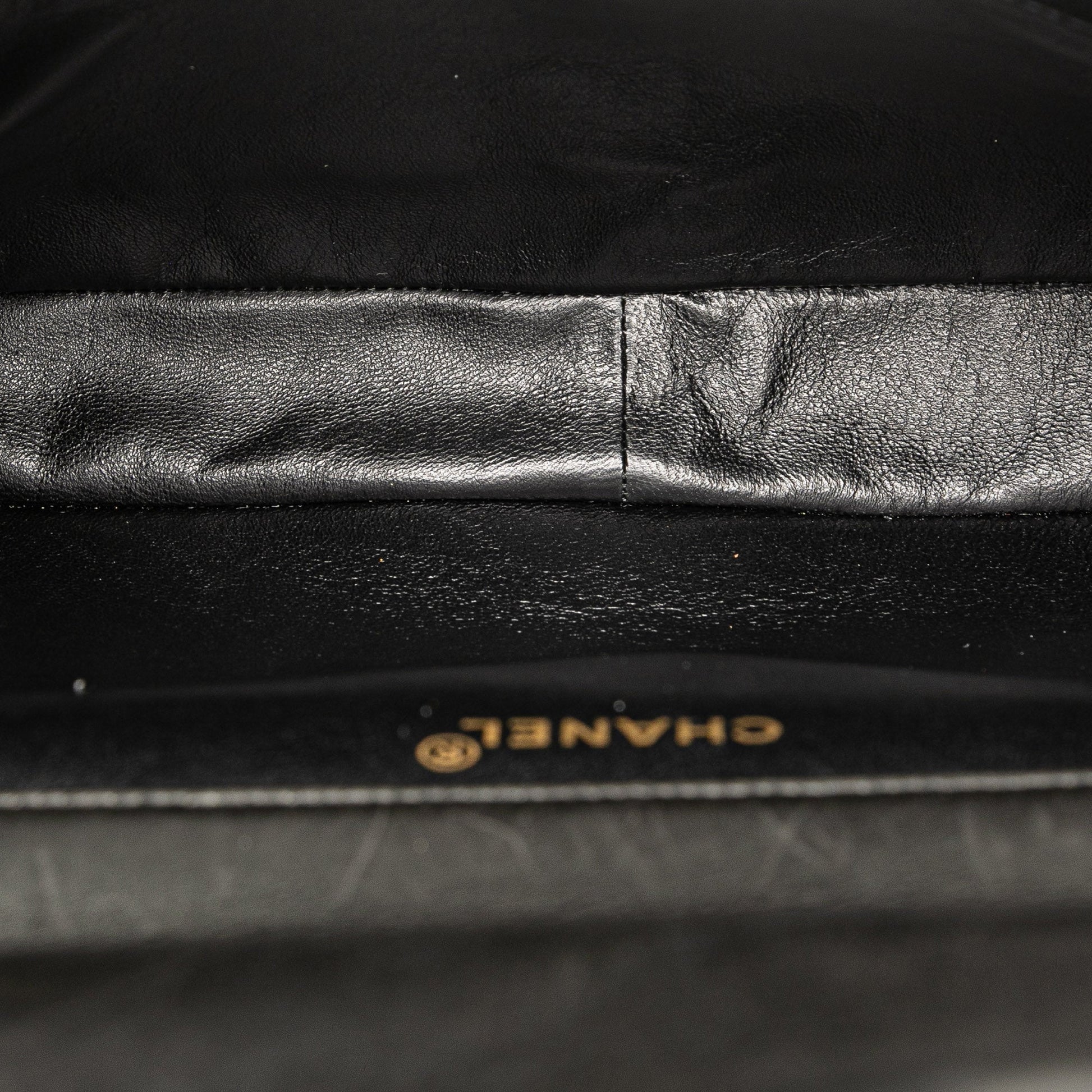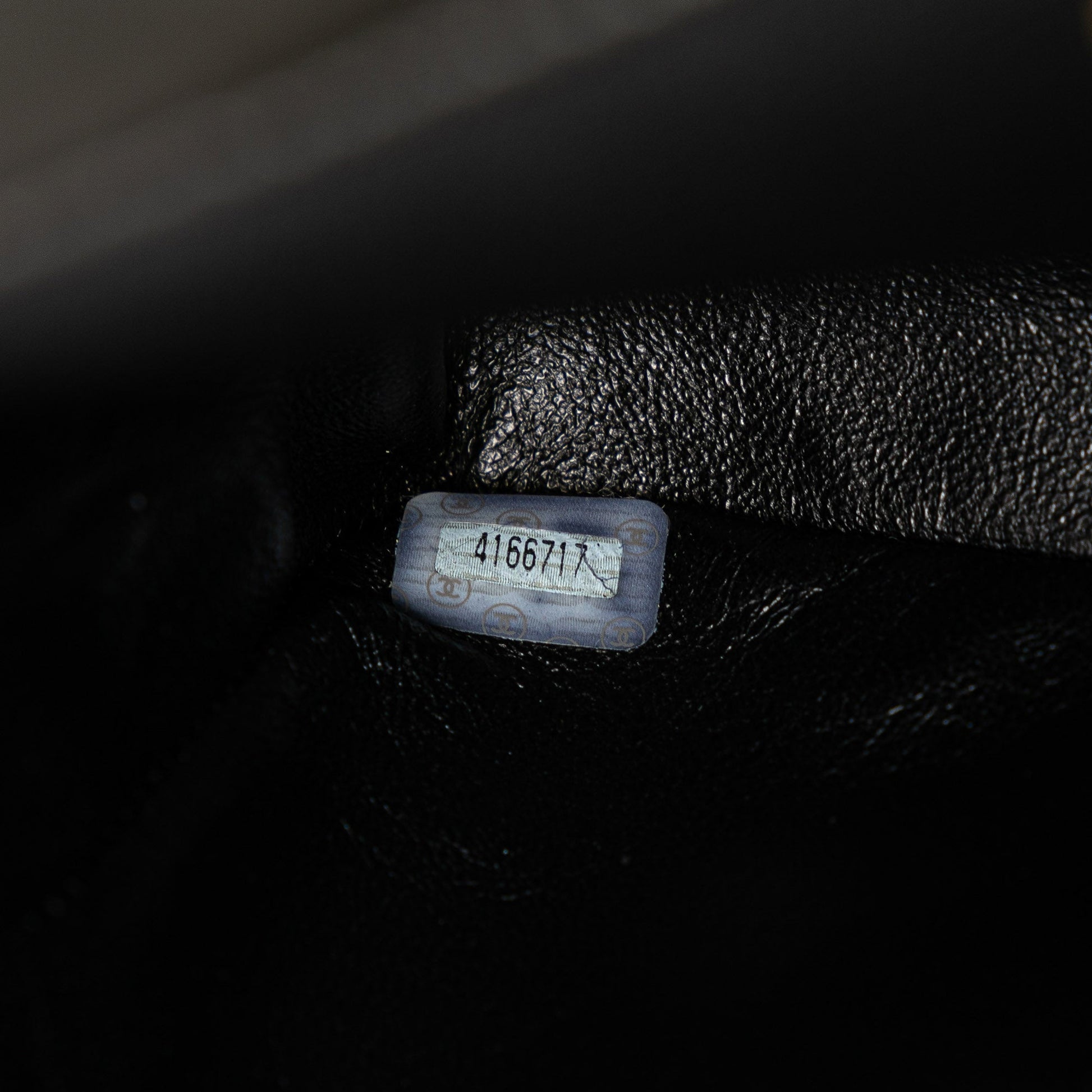 Product Details: Black Chanel Jumbo Lambskin Double Sided Flap Shoulder Bag. This shoulder bag features a quilted lambskin leather body, an exterior back slip pocket, leather-woven chain straps, double front flaps with CC turnlock closure, and interior slip pockets. 7.9" L x 11.4" W x 3.5" D. Serial number 4166717.