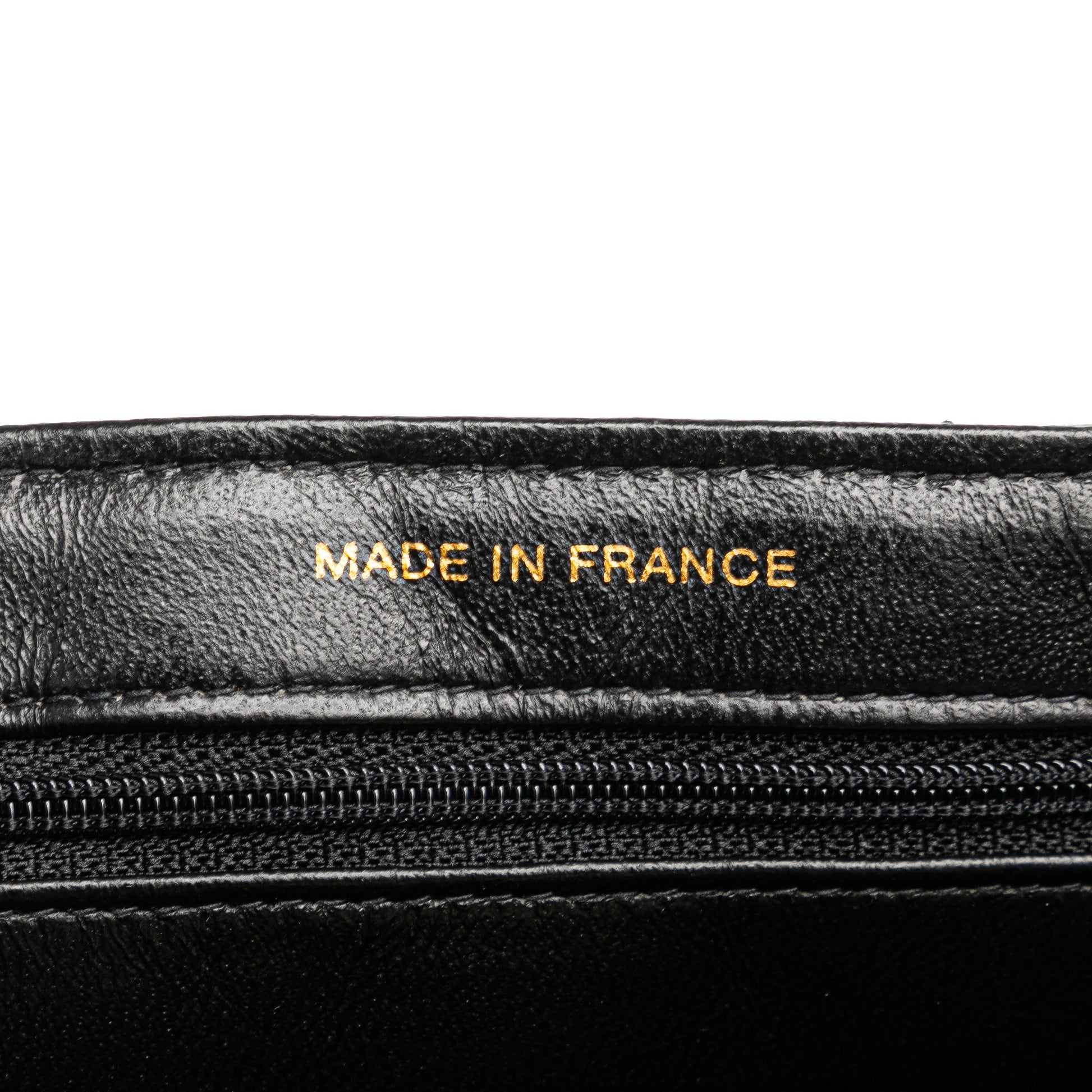 Product Details: Black Chanel Jumbo Lambskin Double Sided Flap Shoulder Bag. This shoulder bag features a quilted lambskin body, leather woven chain straps, double sided flaps with interlocking Cs and a twist lock closure, and interior zip and slip pockets. 7.5" L x 11.8" W x 3.5" D. Serial number 4166727.