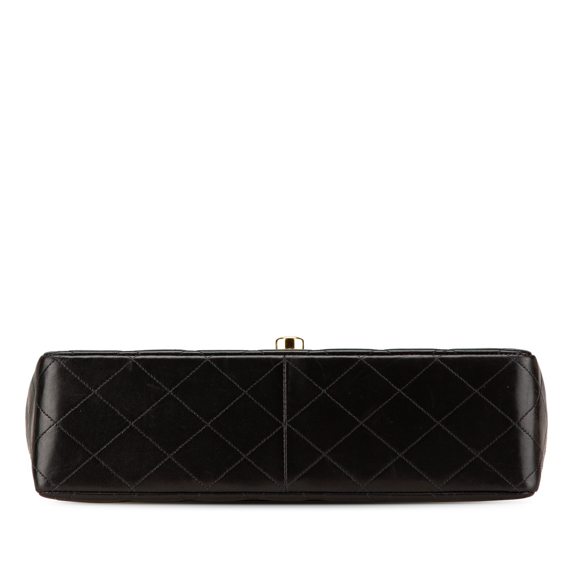 Product Details: Black Chanel Jumbo XL Classic Lambskin Single Flap Shoulder Bag. This flap bag features a quilted lambskin leather body, woven leather chain straps, a front flap with interlocking Cs and a twist lock closure, an exterior back slip pocket, and interior zip and slip pockets. 7.9" L x 11.8" W x 3.1" D, 13.8" drop. Serial number 4465356.