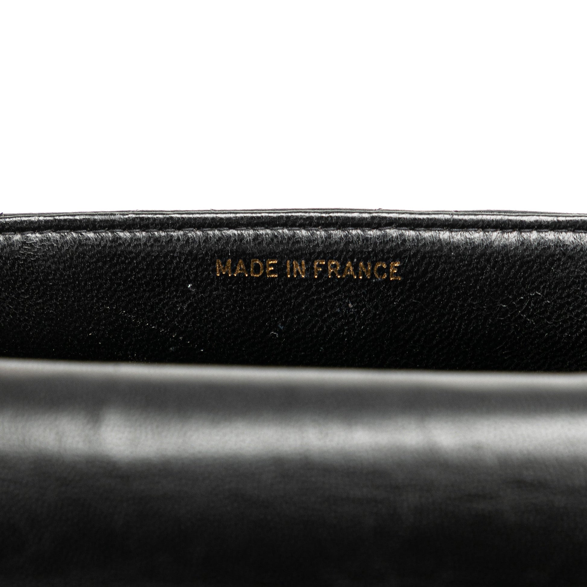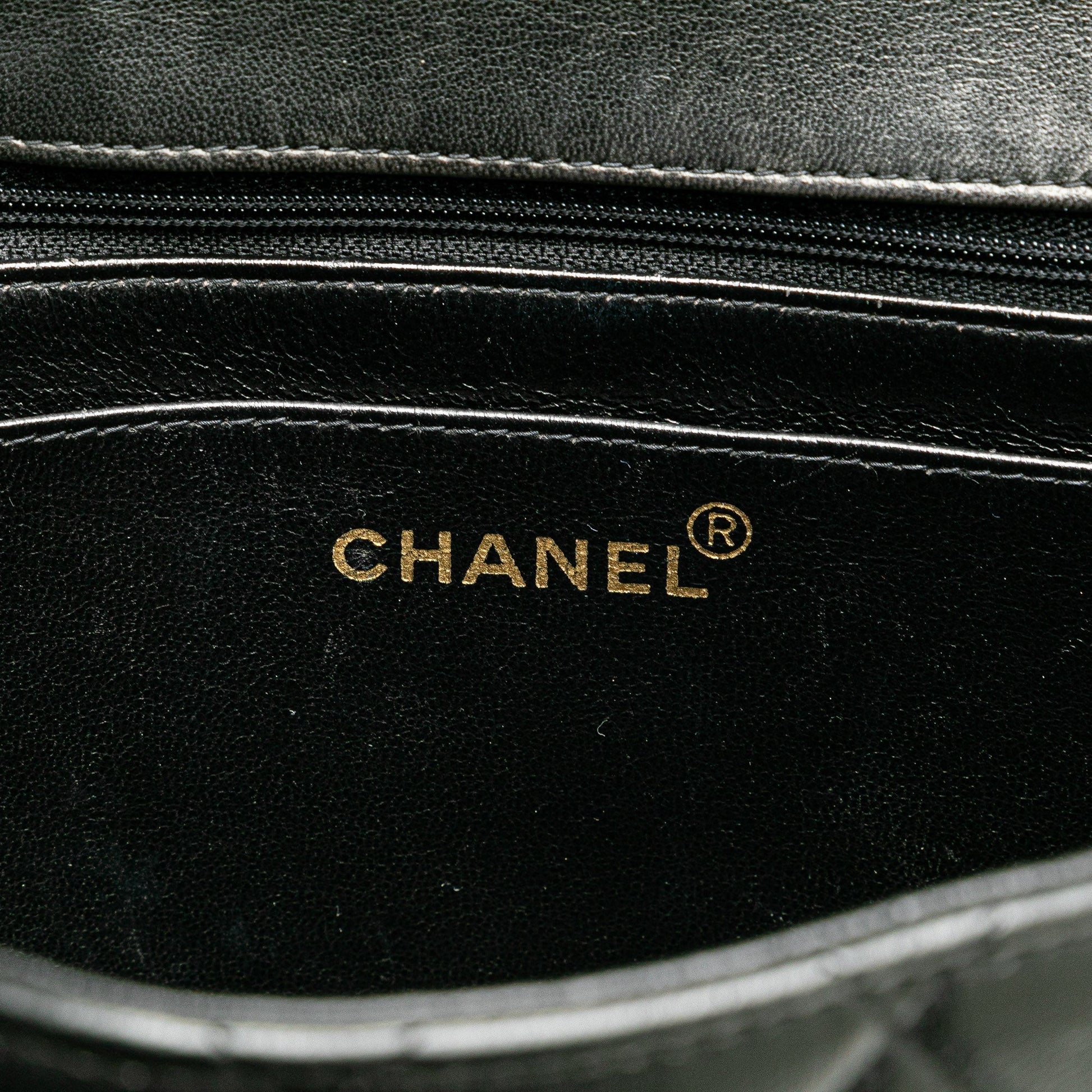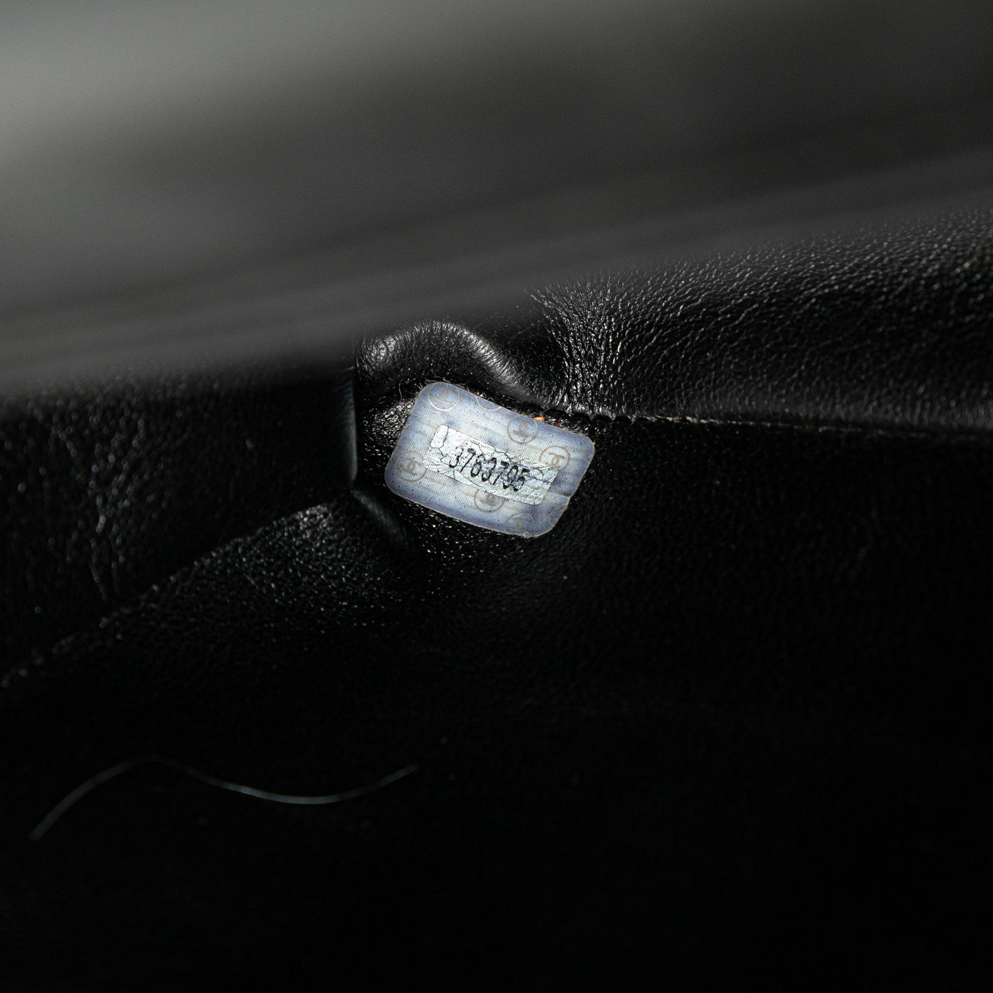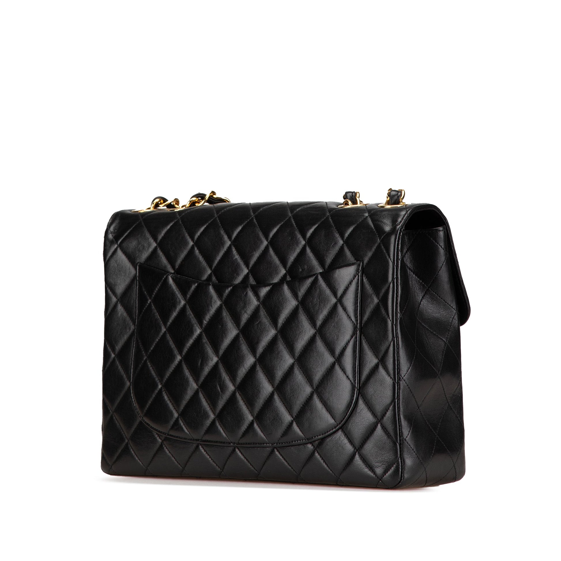 Product Details: Black Chanel Jumbo XL Classic Lambskin Single Flap Shoulder Bag. This flap bag features a quilted lambskin leather body, woven leather chain straps, a front flap with interlocking Cs and a twist lock closure, an exterior back slip pocket, and interior zip and slip pockets. 7.9" L x 11.8" W x 3.3" D, 11.8" drop. Serial number 3763795.