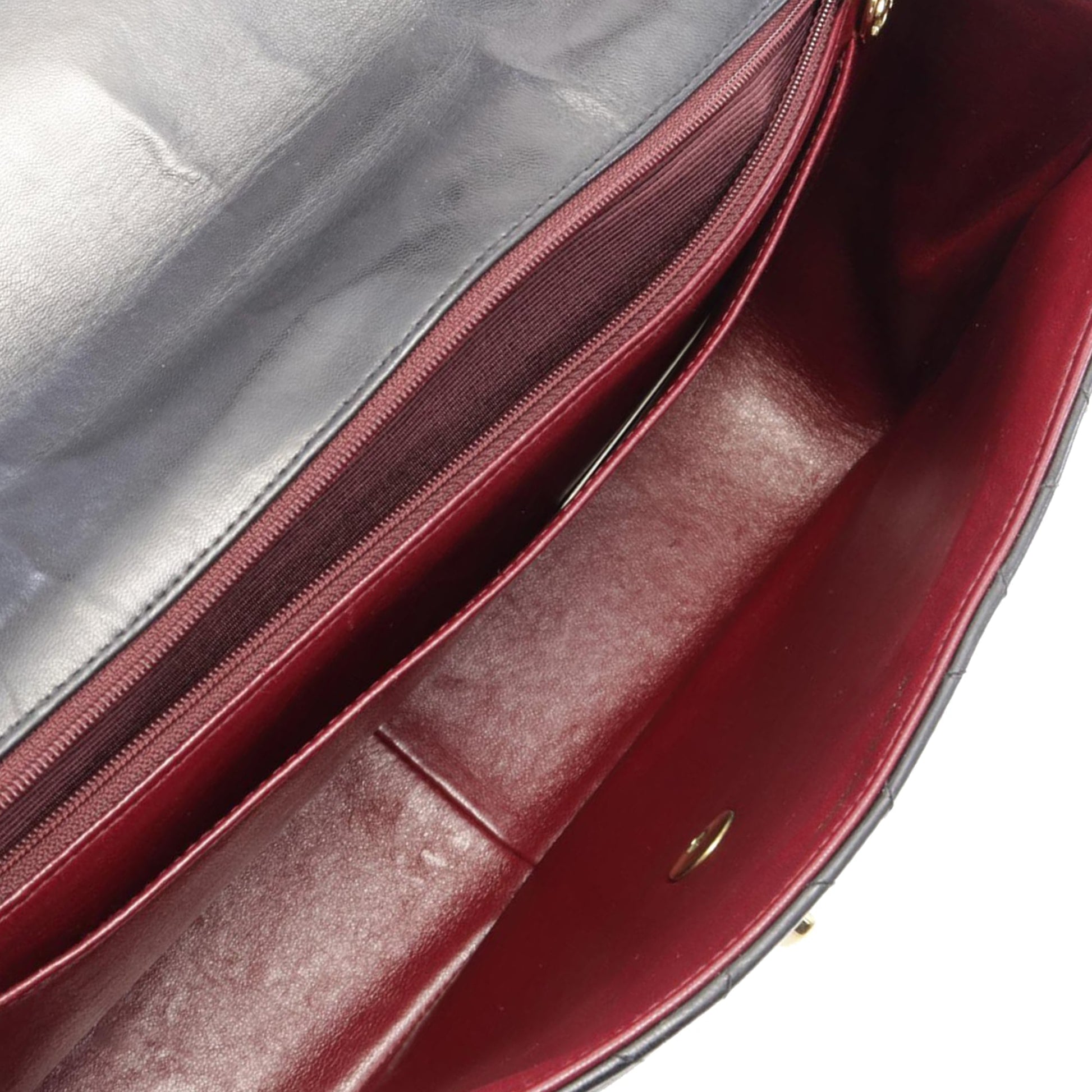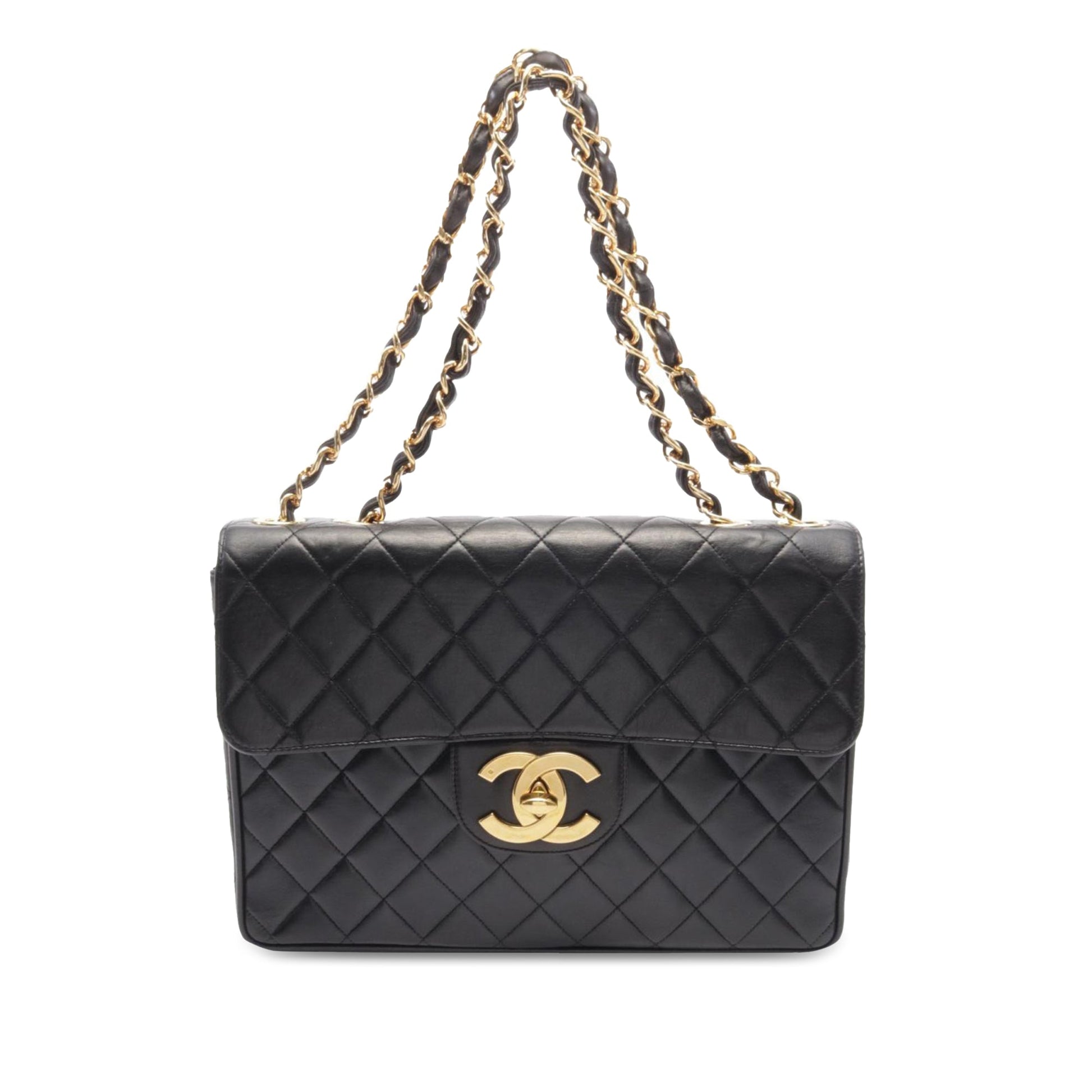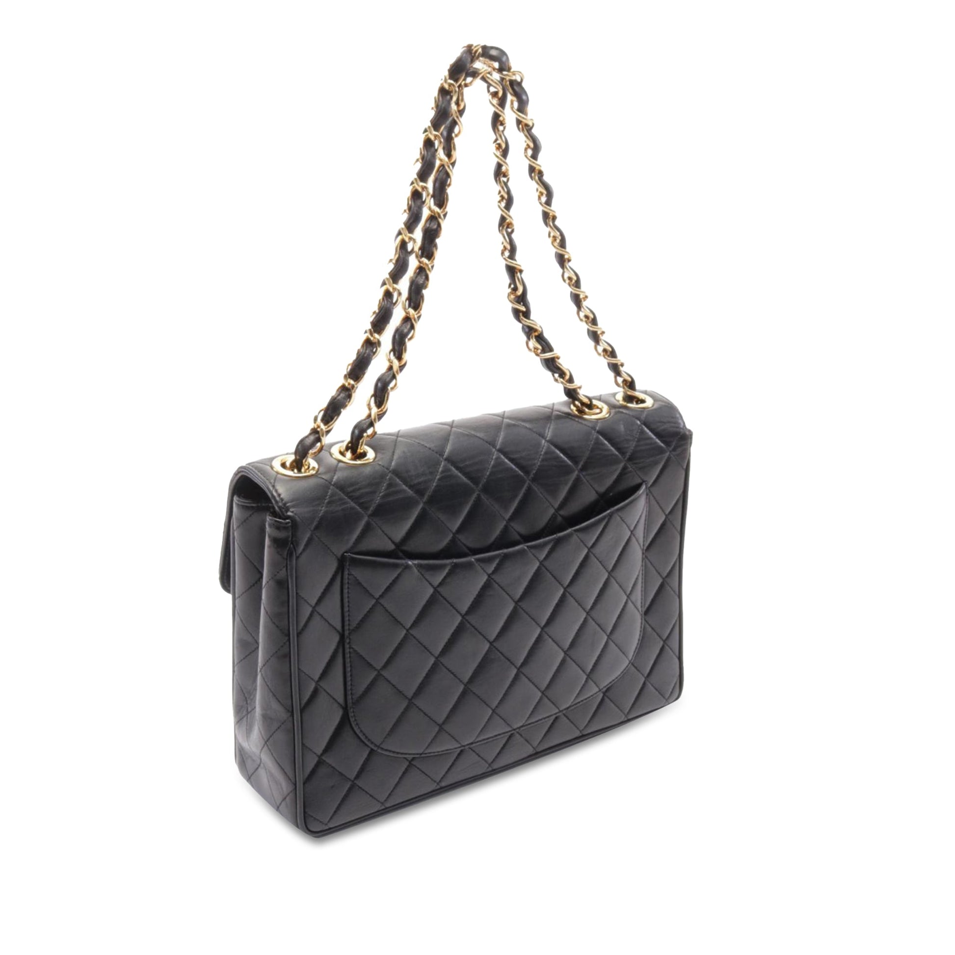 Product Details: Black Chanel Jumbo XL Classic Lambskin Single Flap Shoulder Bag. This flap bag features a quilted lambskin leather body, woven leather chain straps, a front flap with interlocking Cs and a twist lock closure, an exterior back slip pocket, and interior zip and slip pockets. 8.3" L x 11.8" W x 3.5" D. Serial number 3299570.