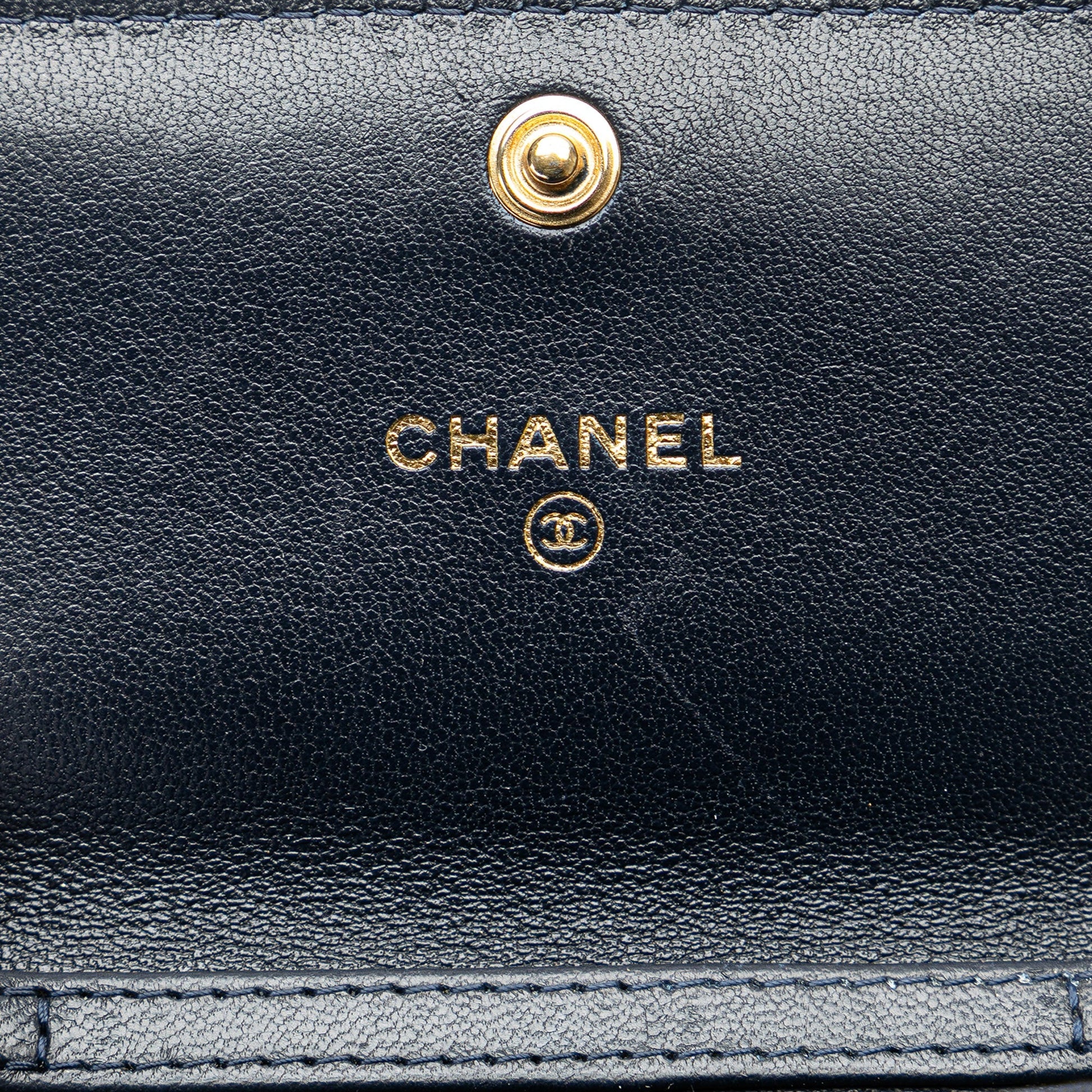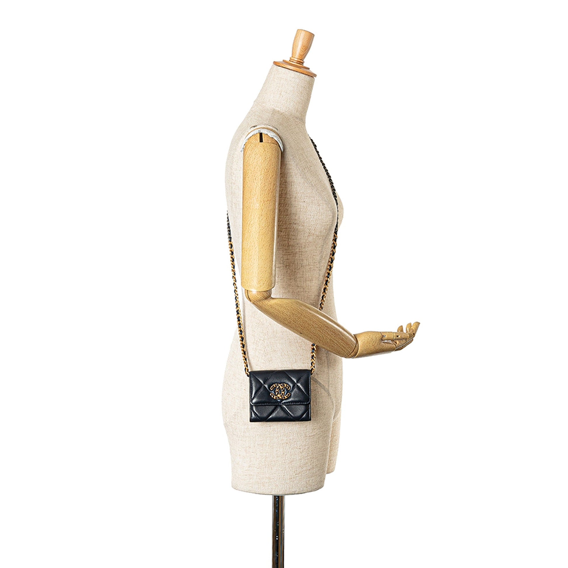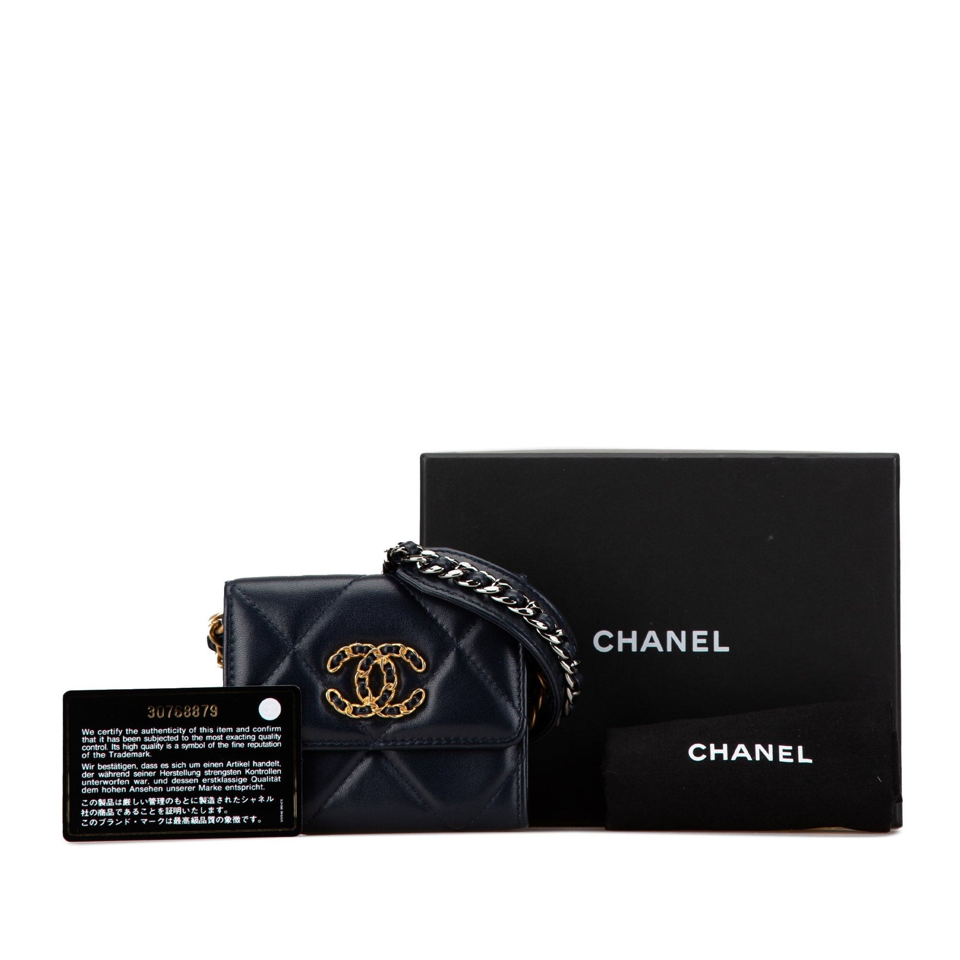 Product Details: Black Chanel Lambskin 19 Flap Coin Purse With Chain Crossbody Bag. This crossbody bag features a quilted lambskin leather body, a leather-woven chain link strap with leather shoulder guard, and a flap with snap button closure. 3.5" L x 4.3" W x 0.6" D. Serial number 30768819.