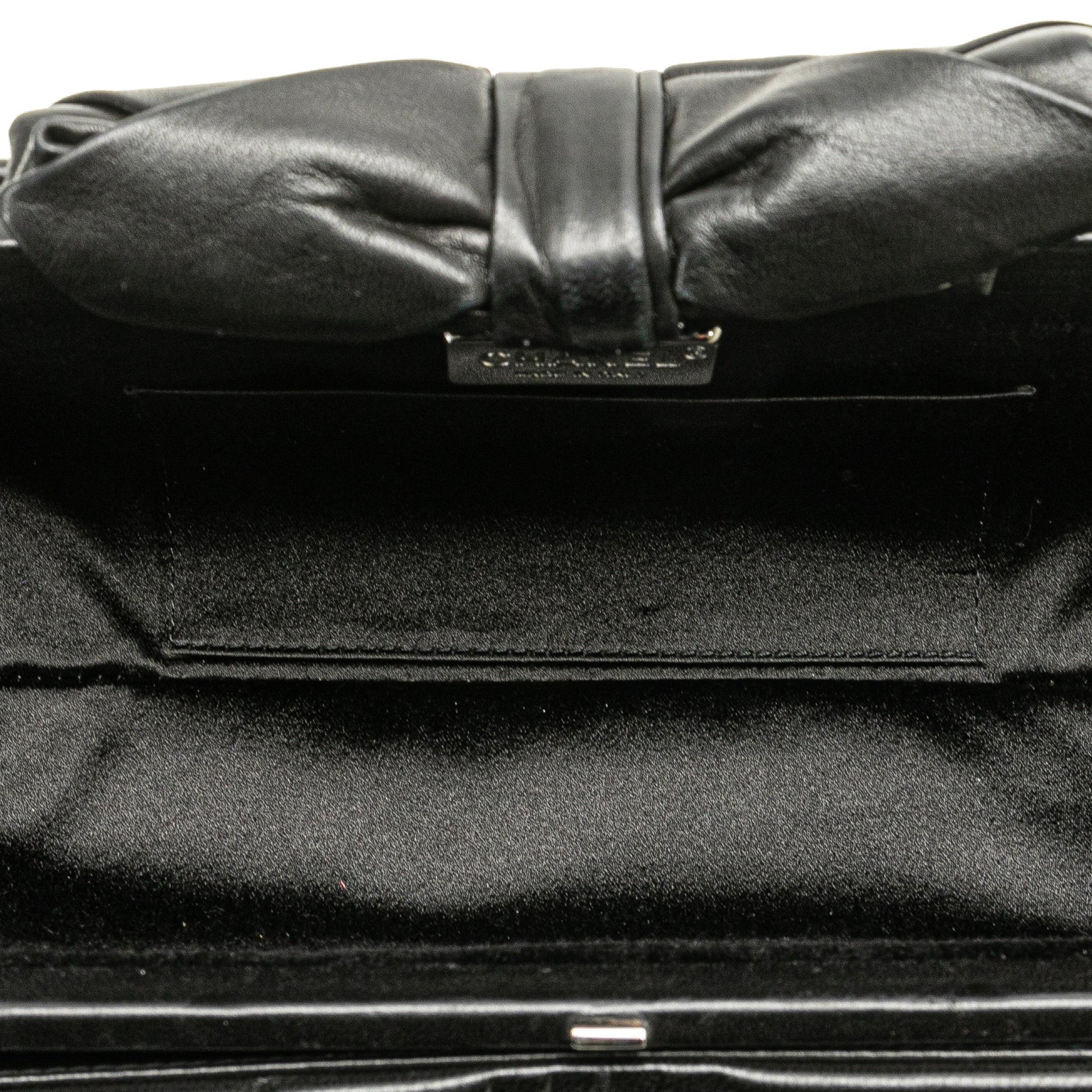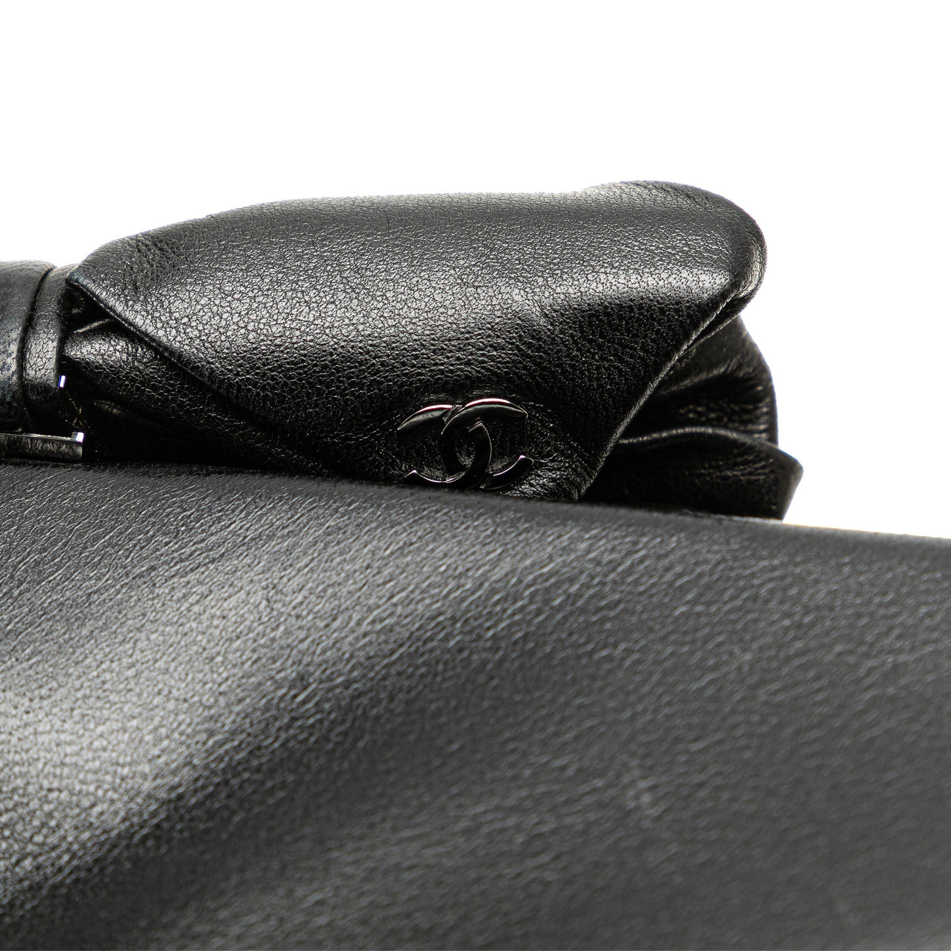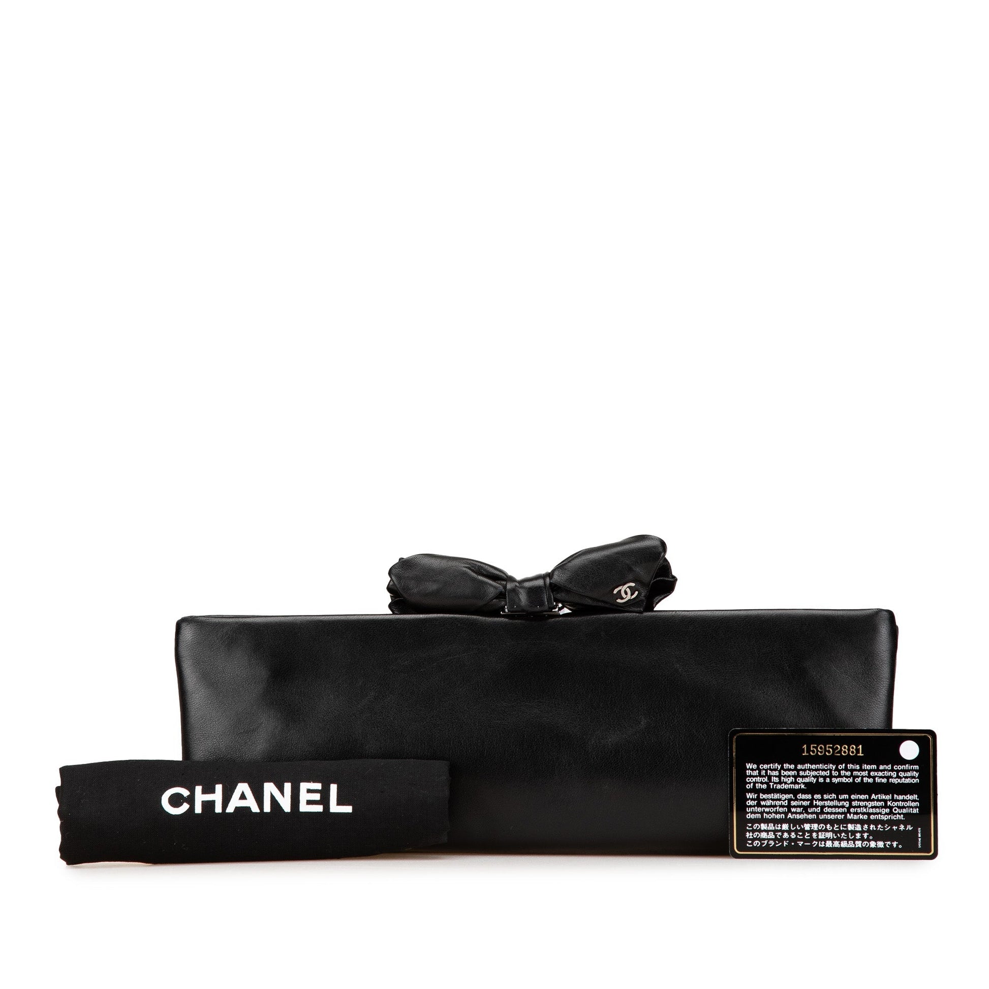 Product Details: Black Chanel Lambskin Bow Long Clutch. This clutch features a lambskin body with bow detail, a top frame with kiss lock closure, and an interior slip pocket. 3.9" L x 11.8" W x 0.8" D. Serial number 15952881.