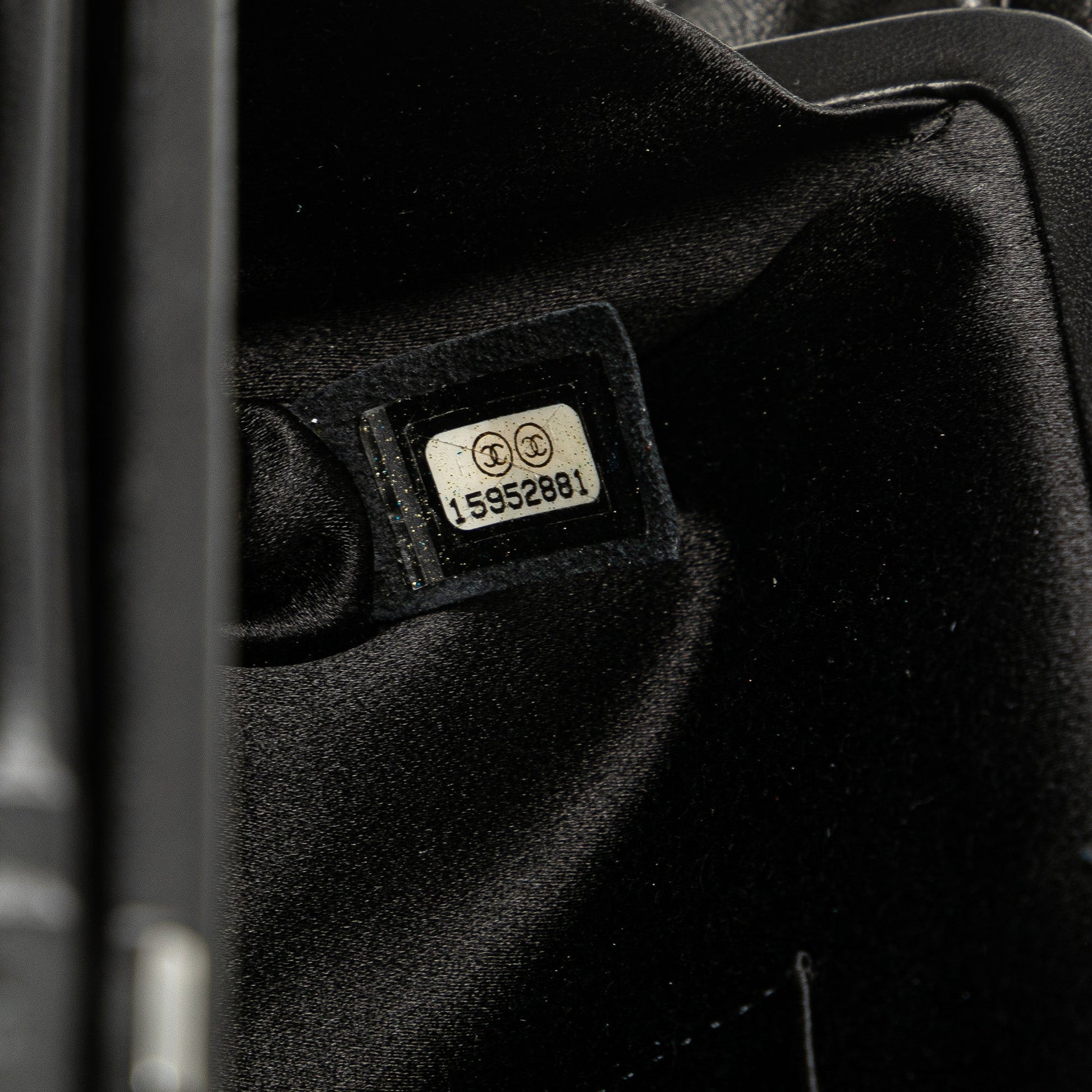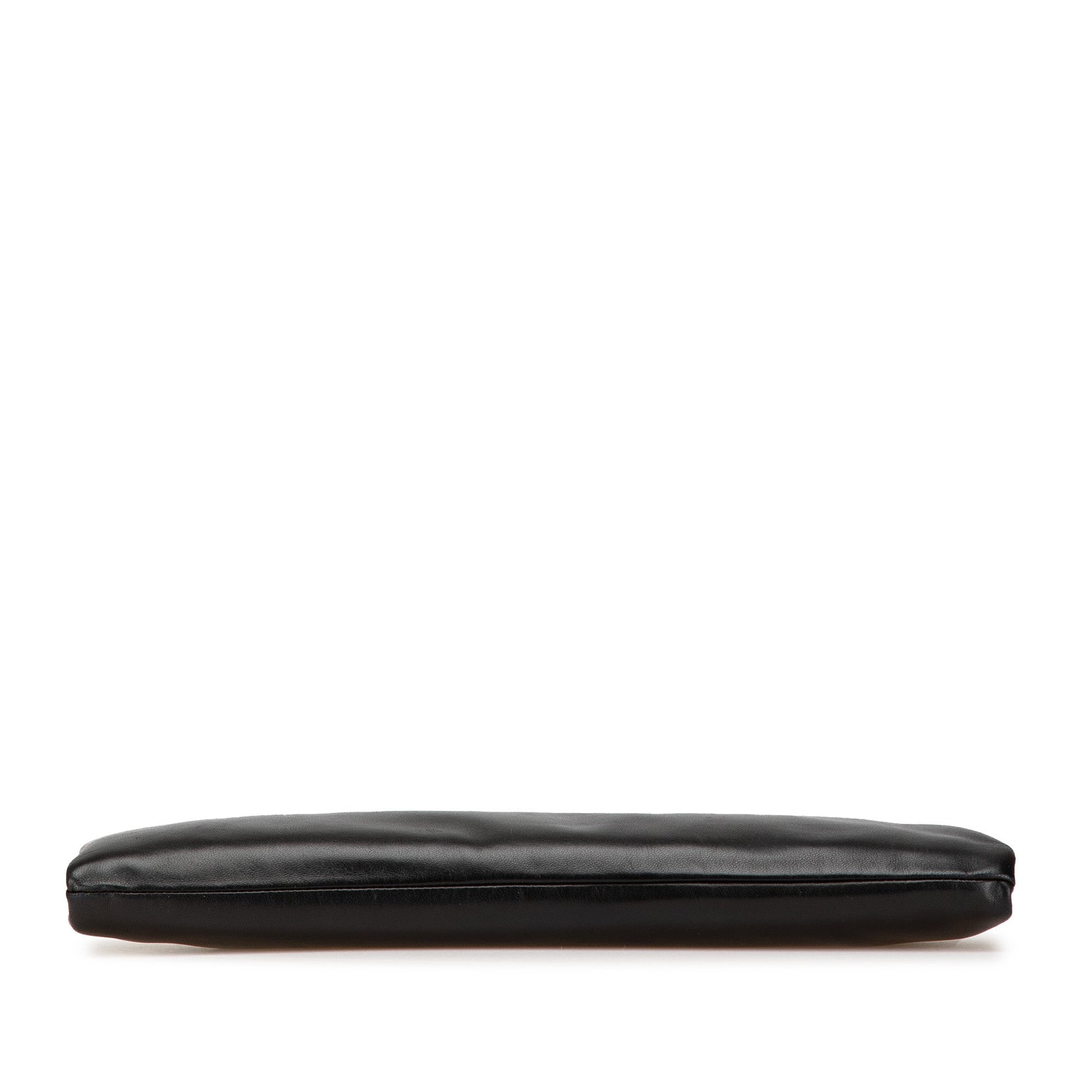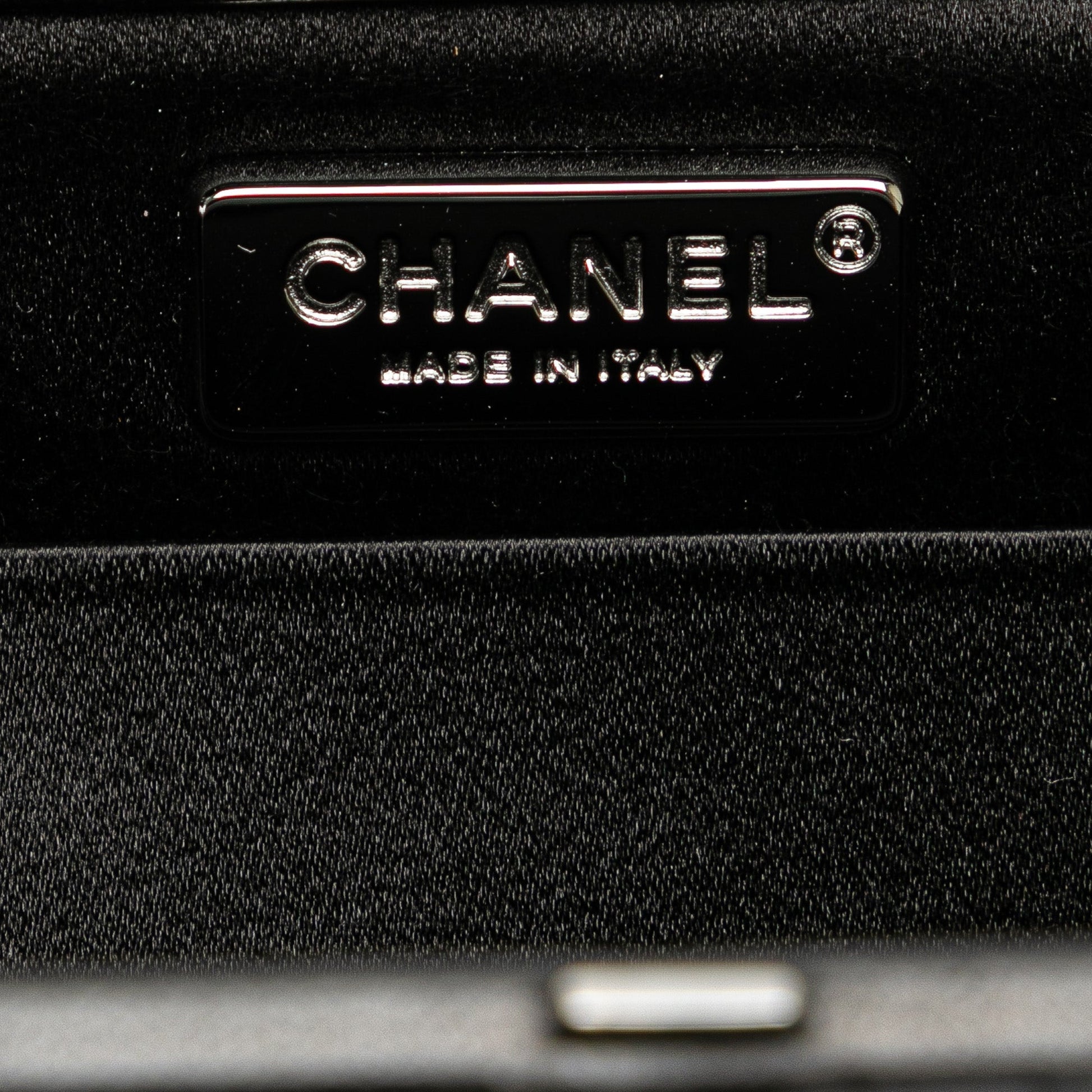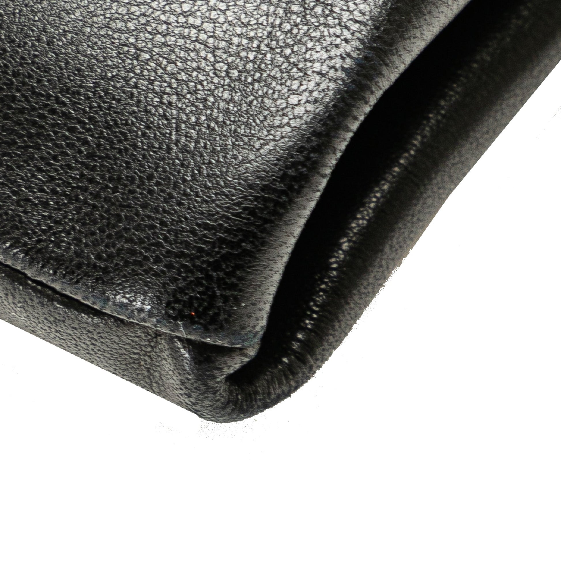 Product Details: Black Chanel Lambskin Bow Long Clutch. This clutch features a lambskin body with bow detail, a top frame with kiss lock closure, and an interior slip pocket. 3.9" L x 11.8" W x 0.8" D. Serial number 15952881.