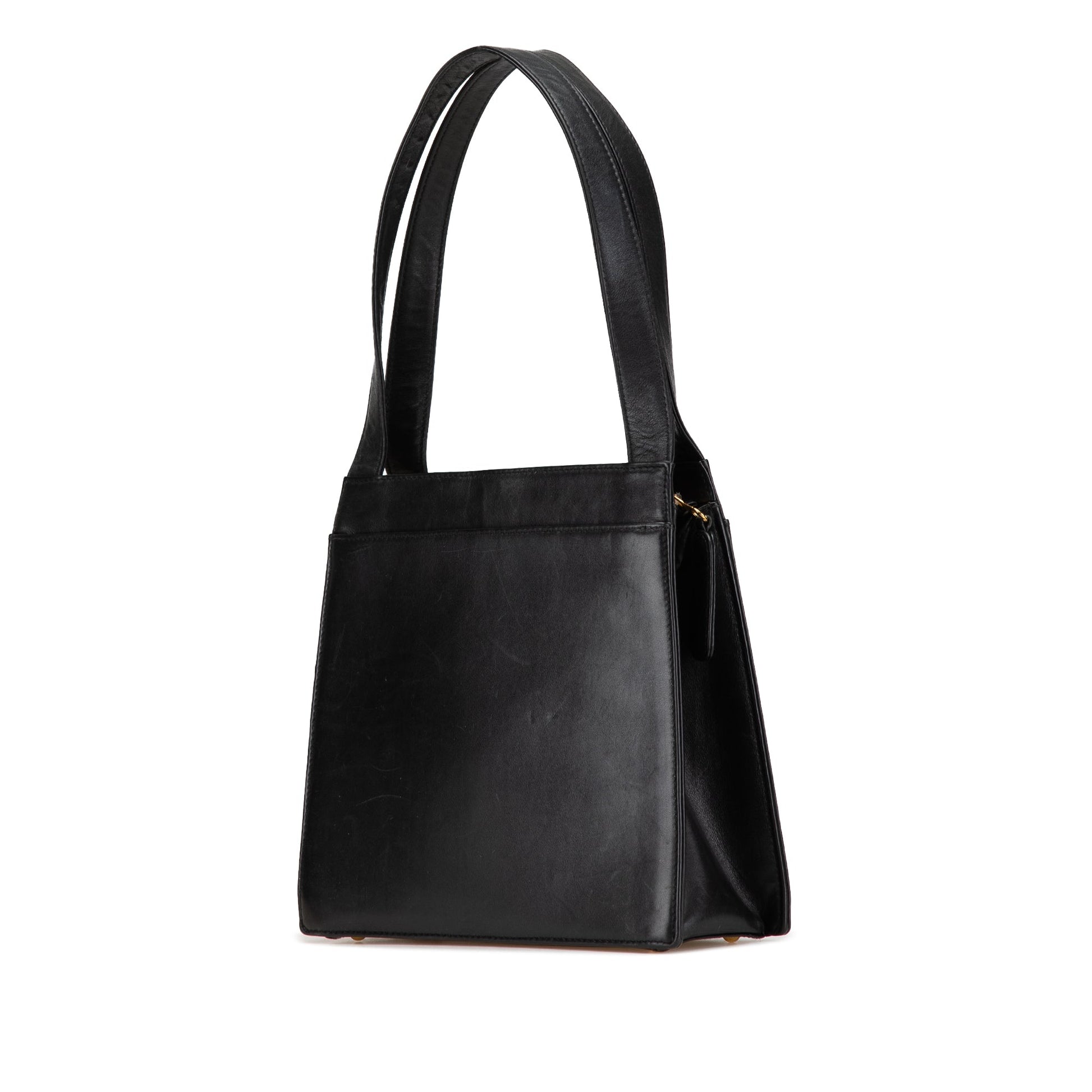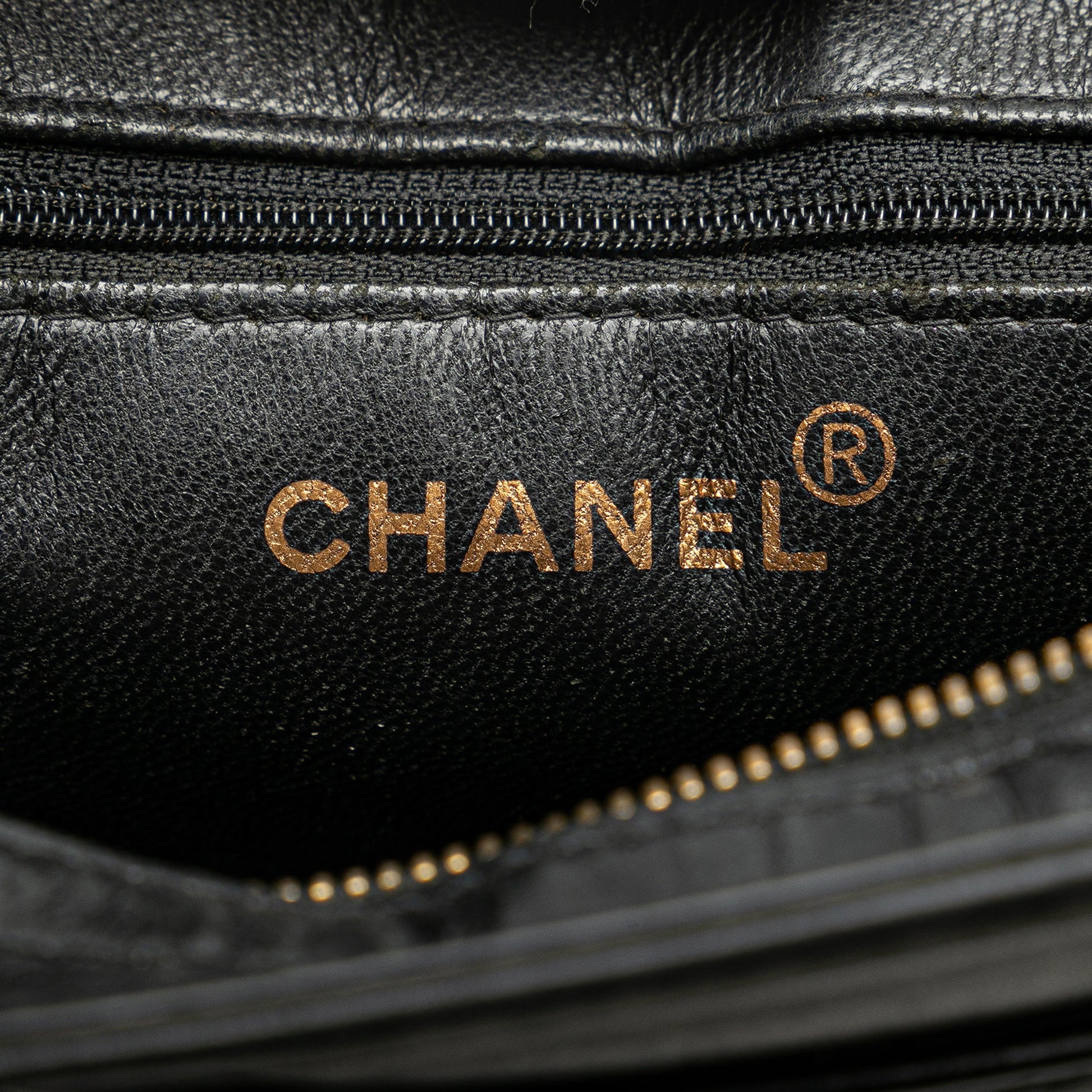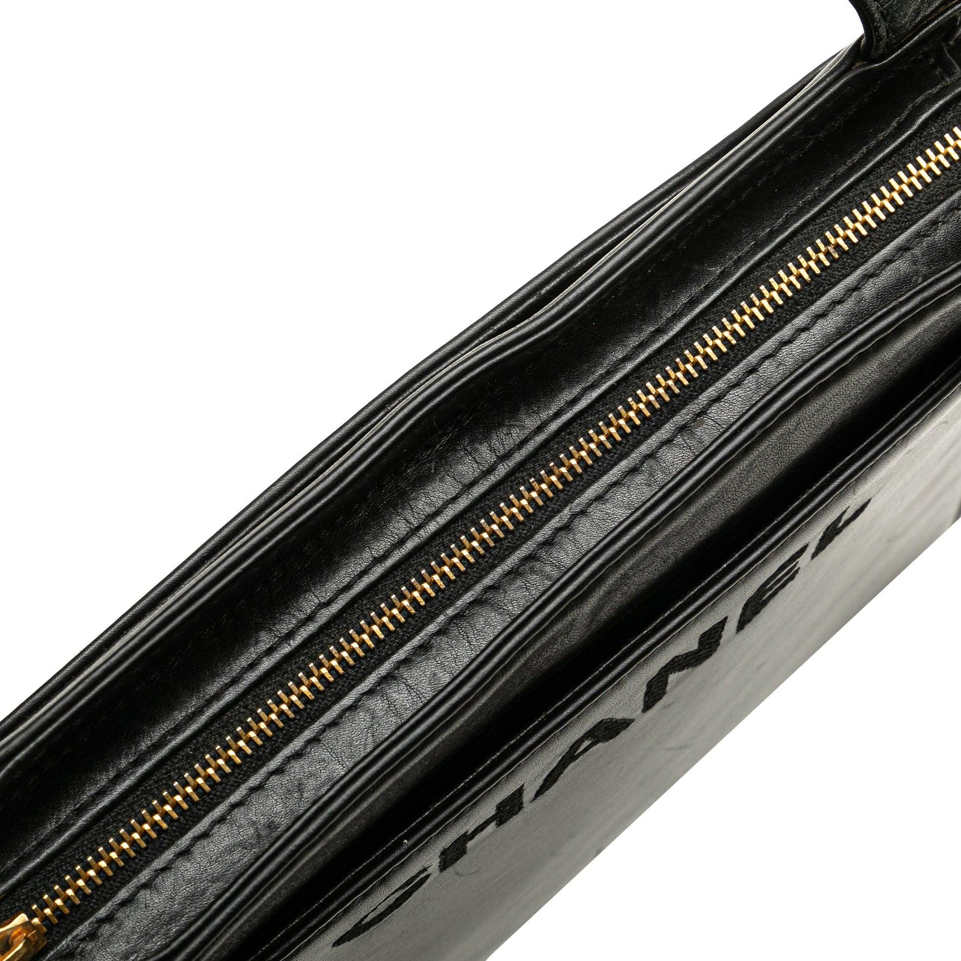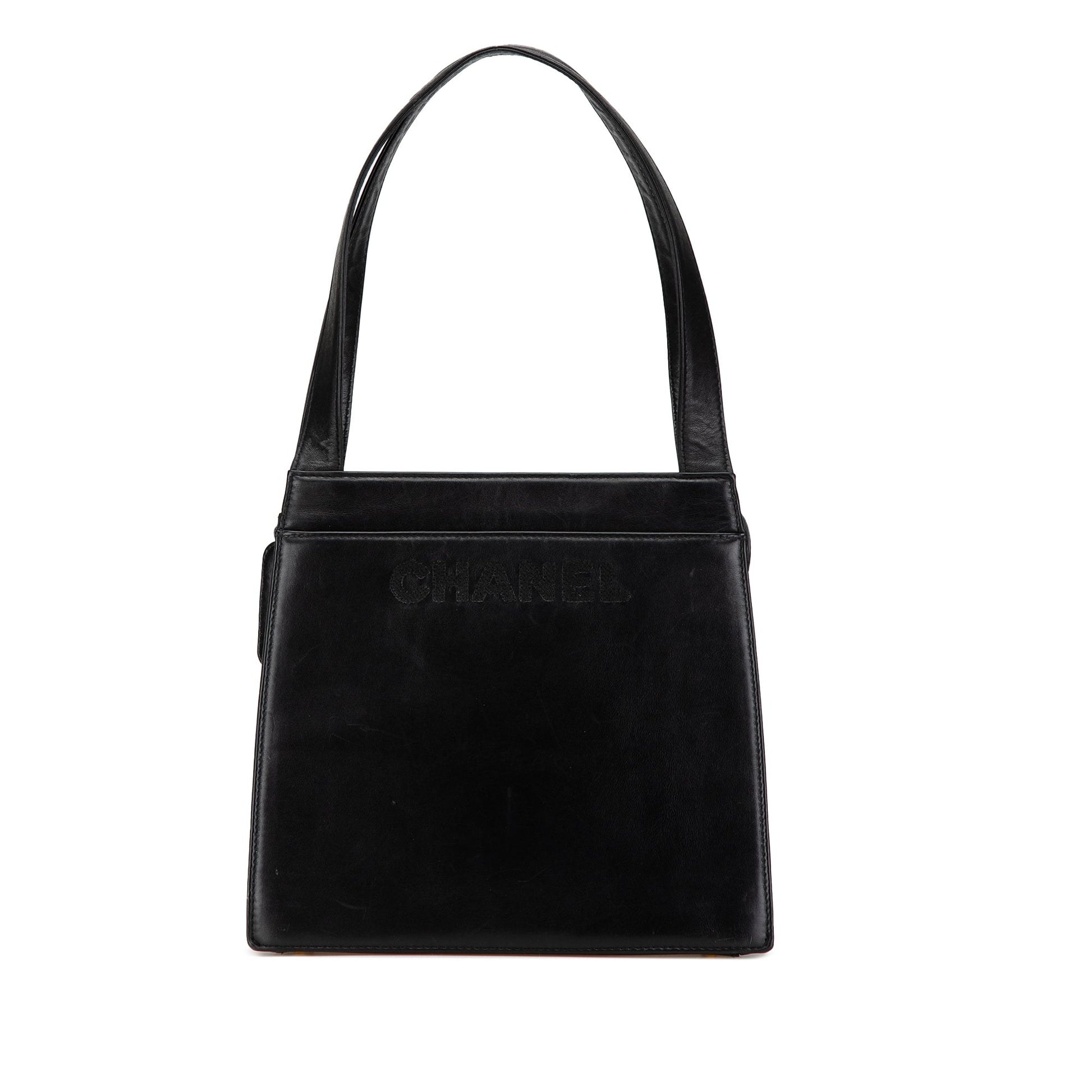 Product Details: Black Chanel Lambskin Logo Tote. This tote bag features a lambskin leather body, flat leather shoulder straps, a top zip closure, exterior slip pockets, and interior zip and slip pockets. 9.1" L x 10" W x 3.3" D, 8.7" drop. Serial number 5360844.