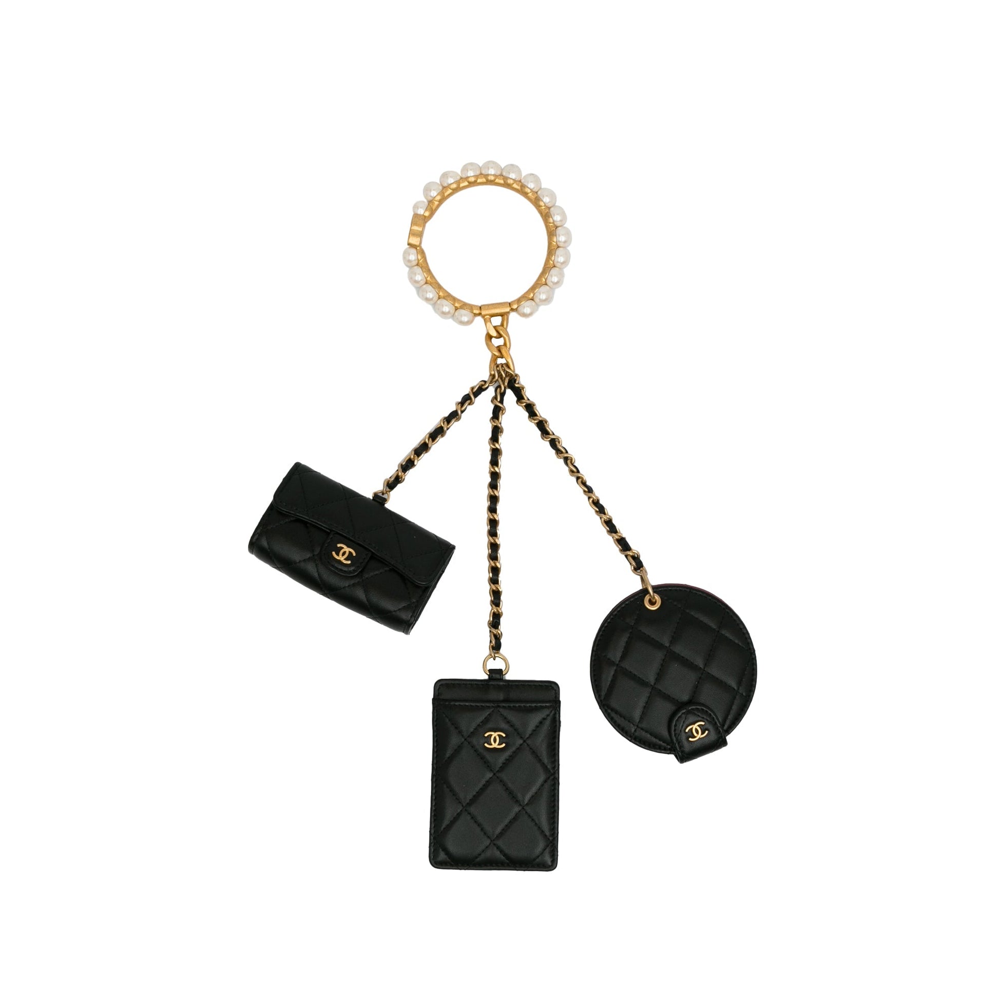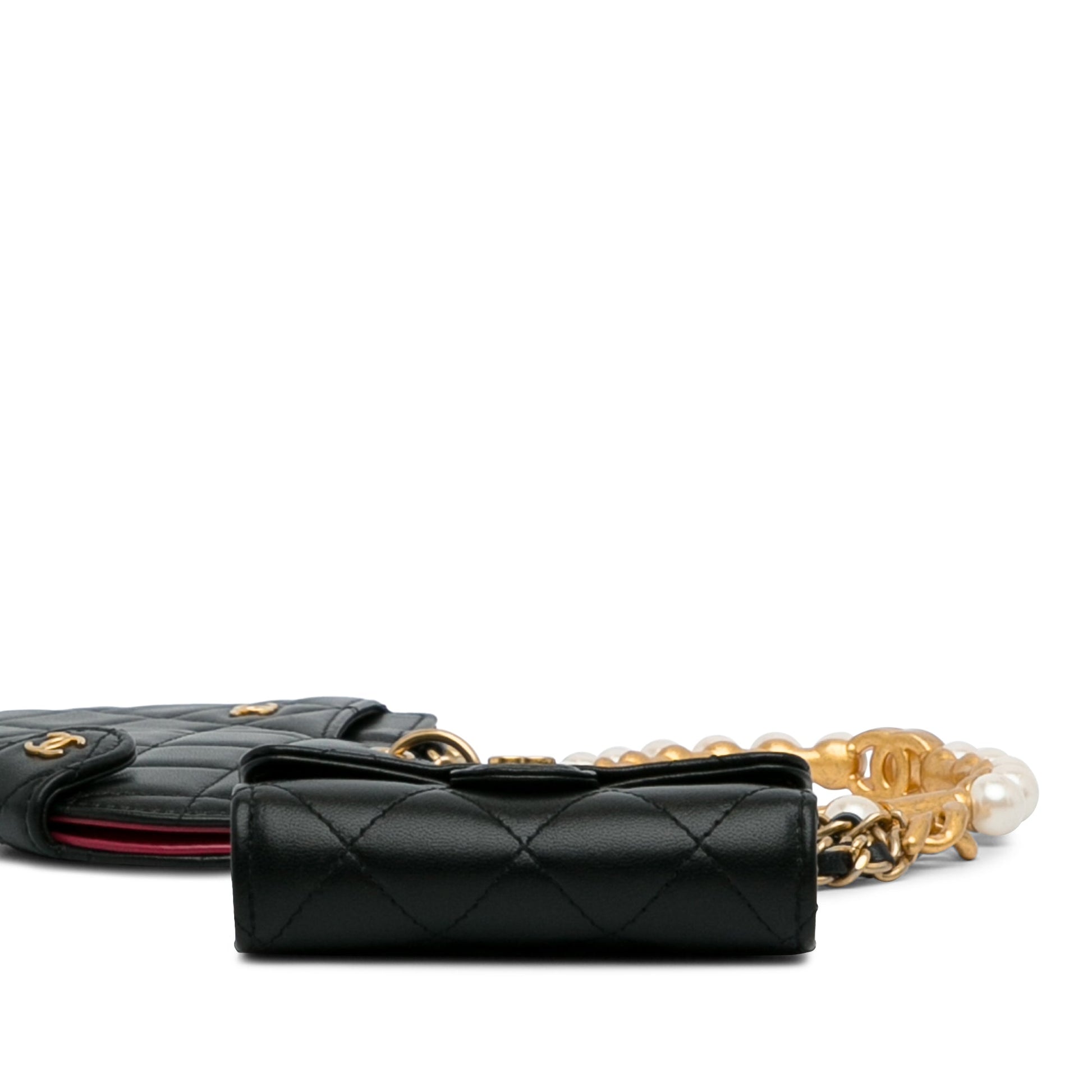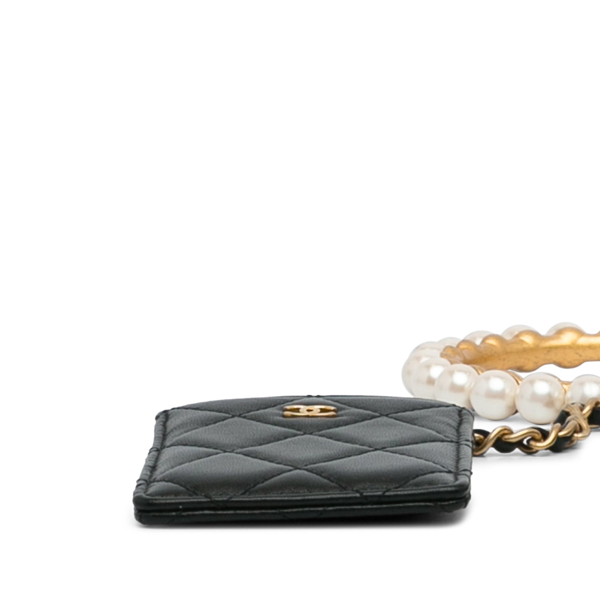 Product Details: Black Chanel Lambskin Pearl Crown CC Wristlet Multi Pouches Clutch Bag. These clutch bags features a quilted lambskin leather body, metal handle with faux pearl details, flap and zip closure. 4.1" L x 2.8" W x 1" D. Serial number 31495185.