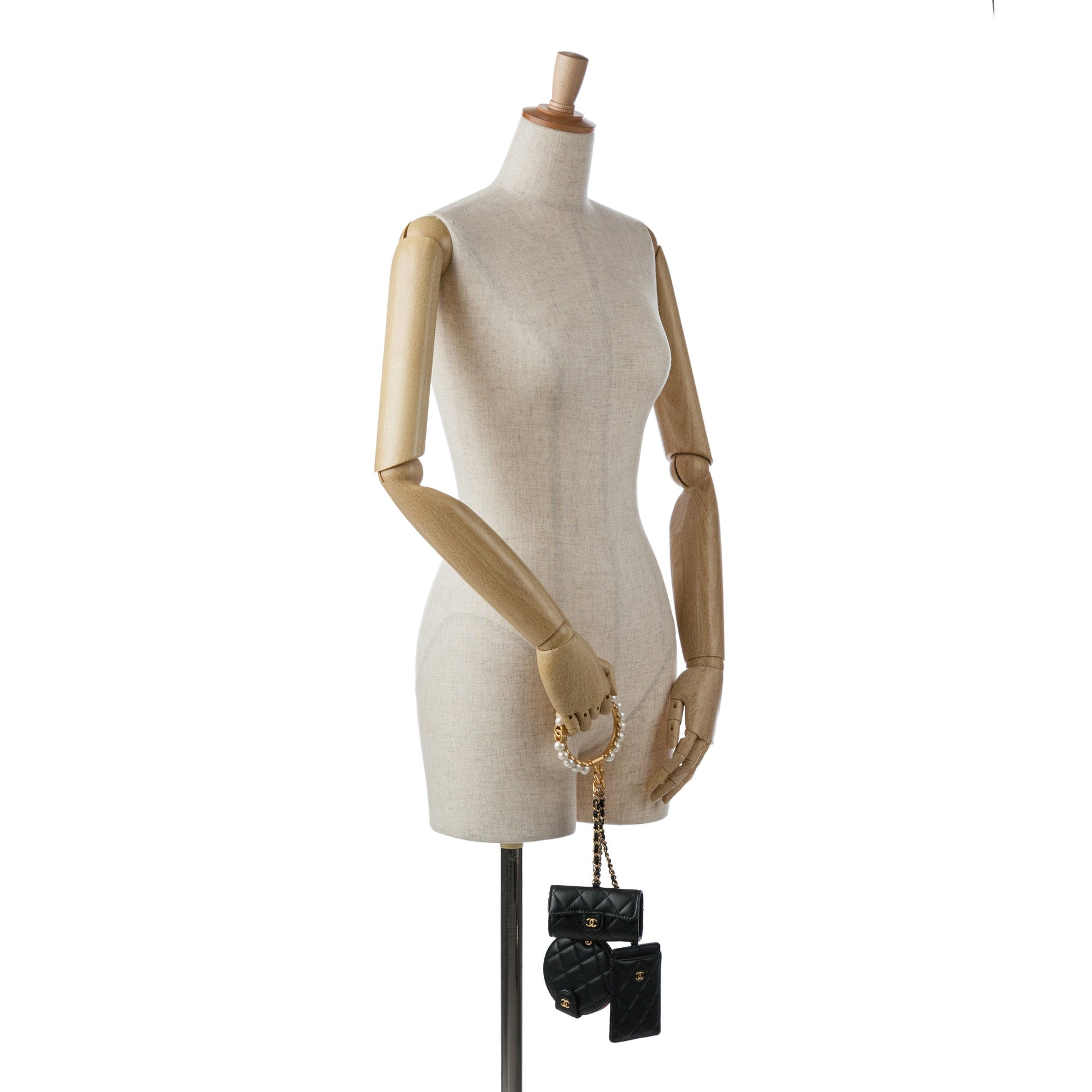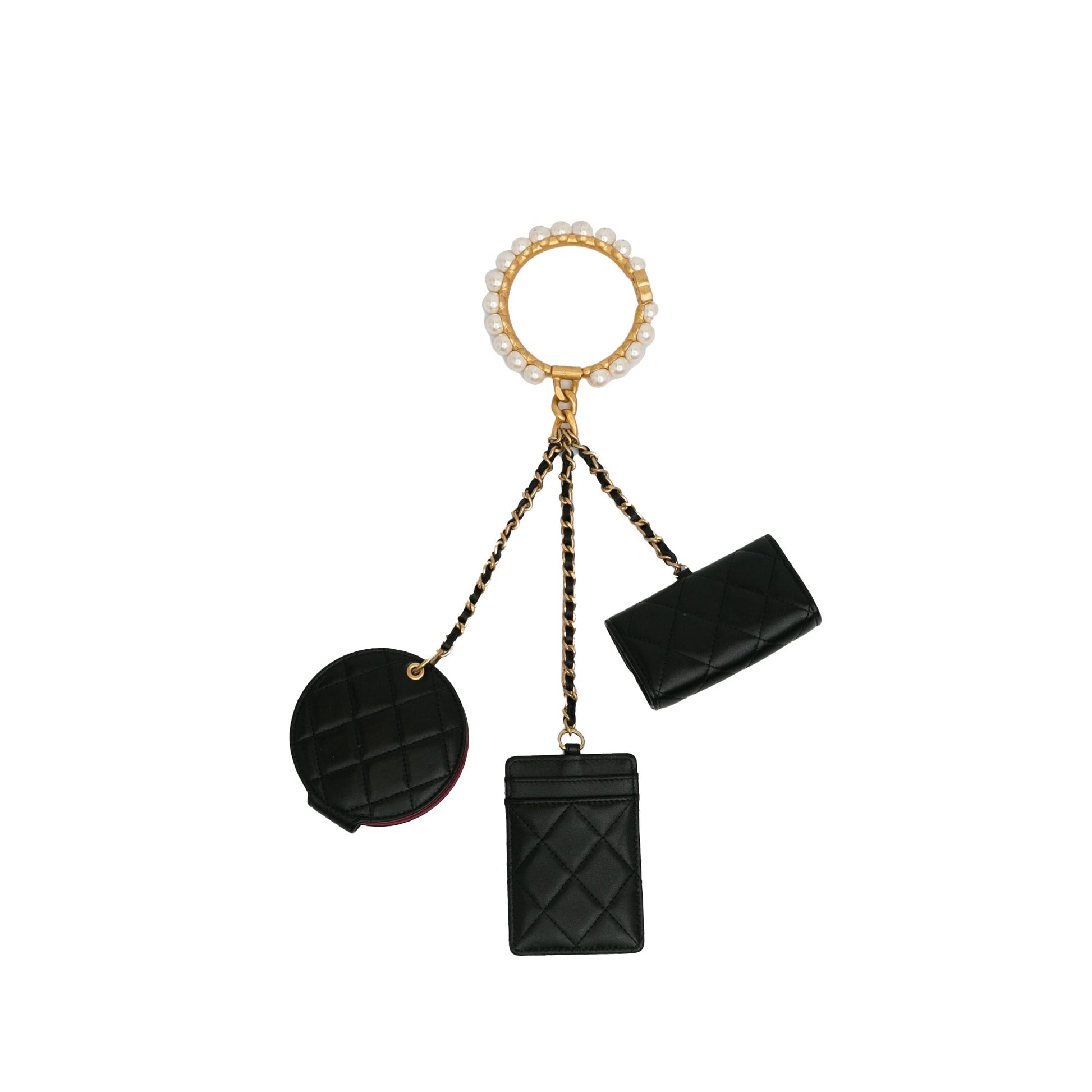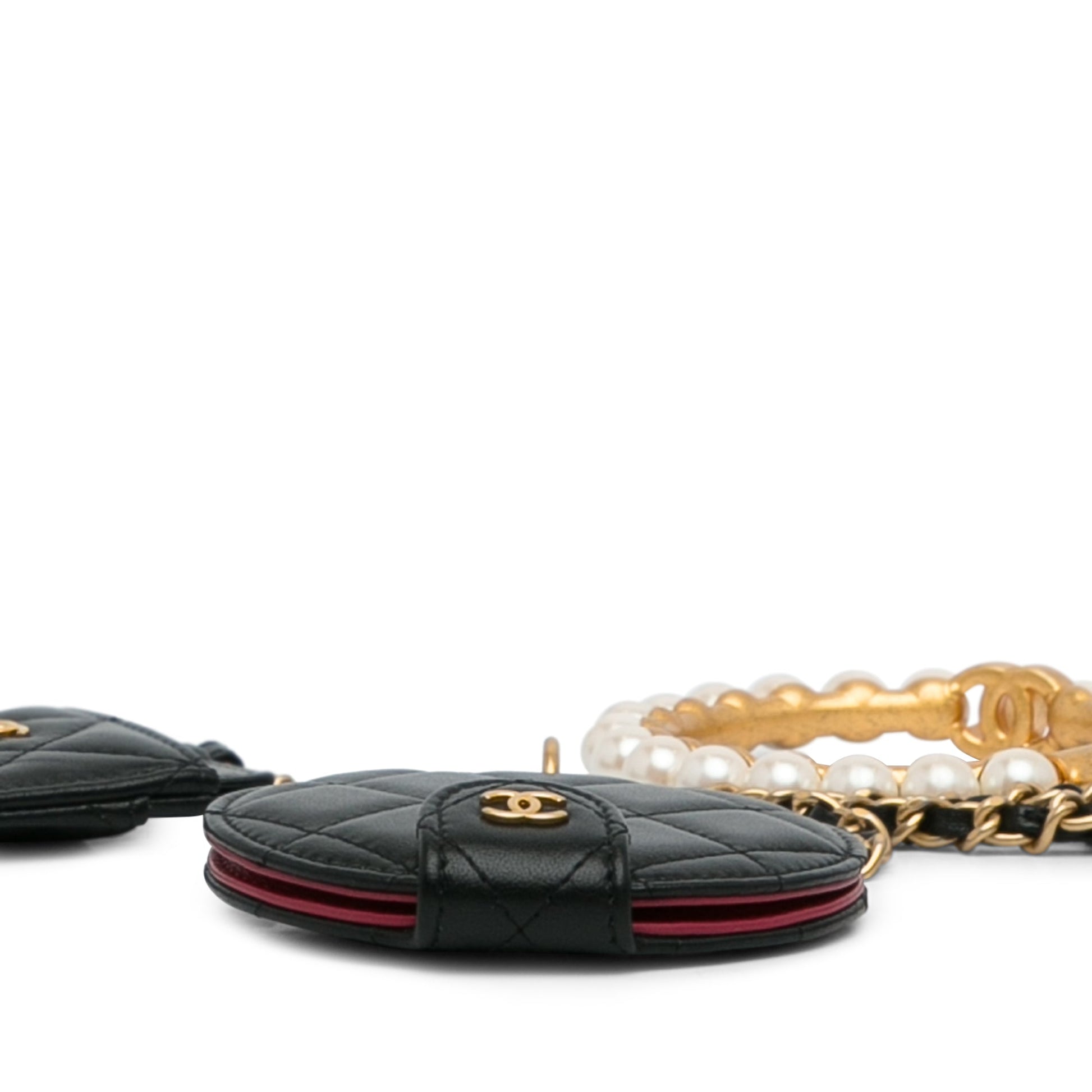 Product Details: Black Chanel Lambskin Pearl Crown CC Wristlet Multi Pouches Clutch Bag. These clutch bags features a quilted lambskin leather body, metal handle with faux pearl details, flap and zip closure. 4.1" L x 2.8" W x 1" D. Serial number 31495185.