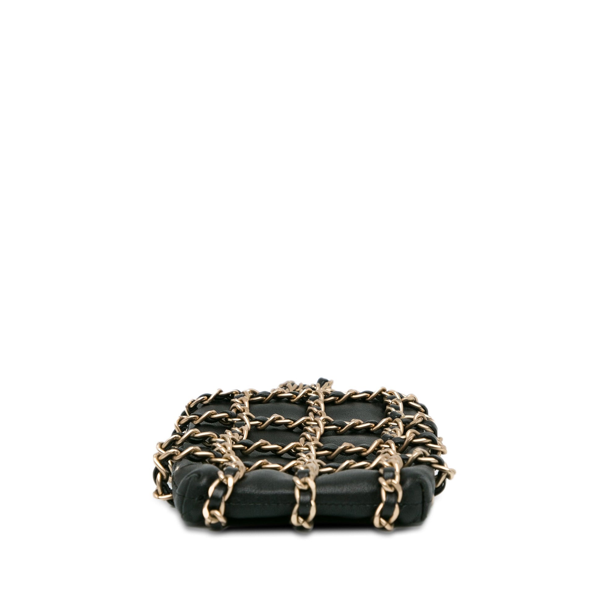 Product Details: Black Chanel Lambskin Tech Me Out Clutch With Chain Crossbody Bag. This crossbody bag features a lambskin leather body with chain-link details, a leather woven gold tone chain strap, and an open top. 6.7" L x 3.1" W x 0.6" D. Serial number 28856945.