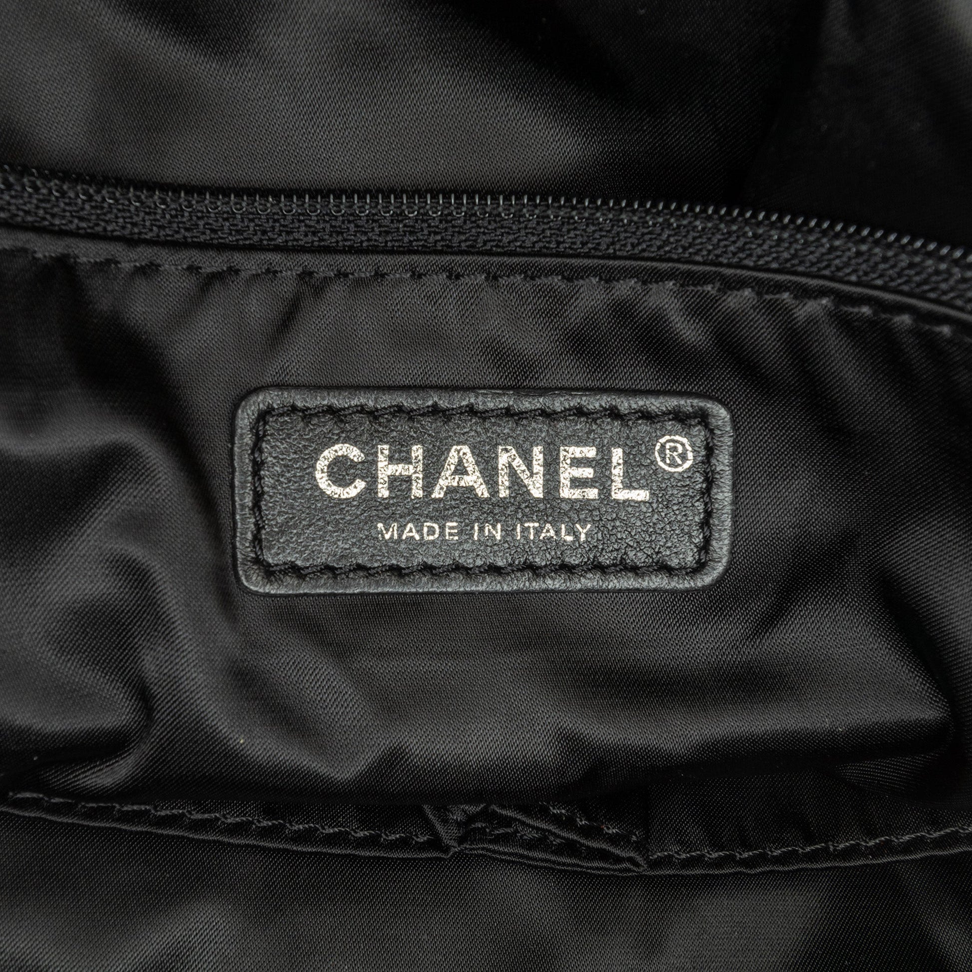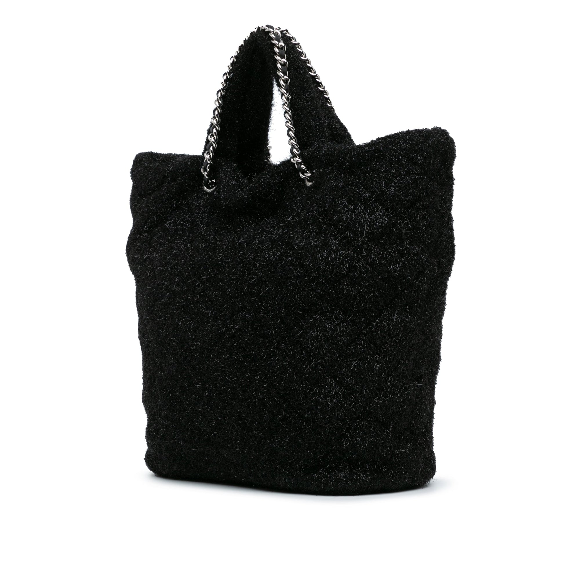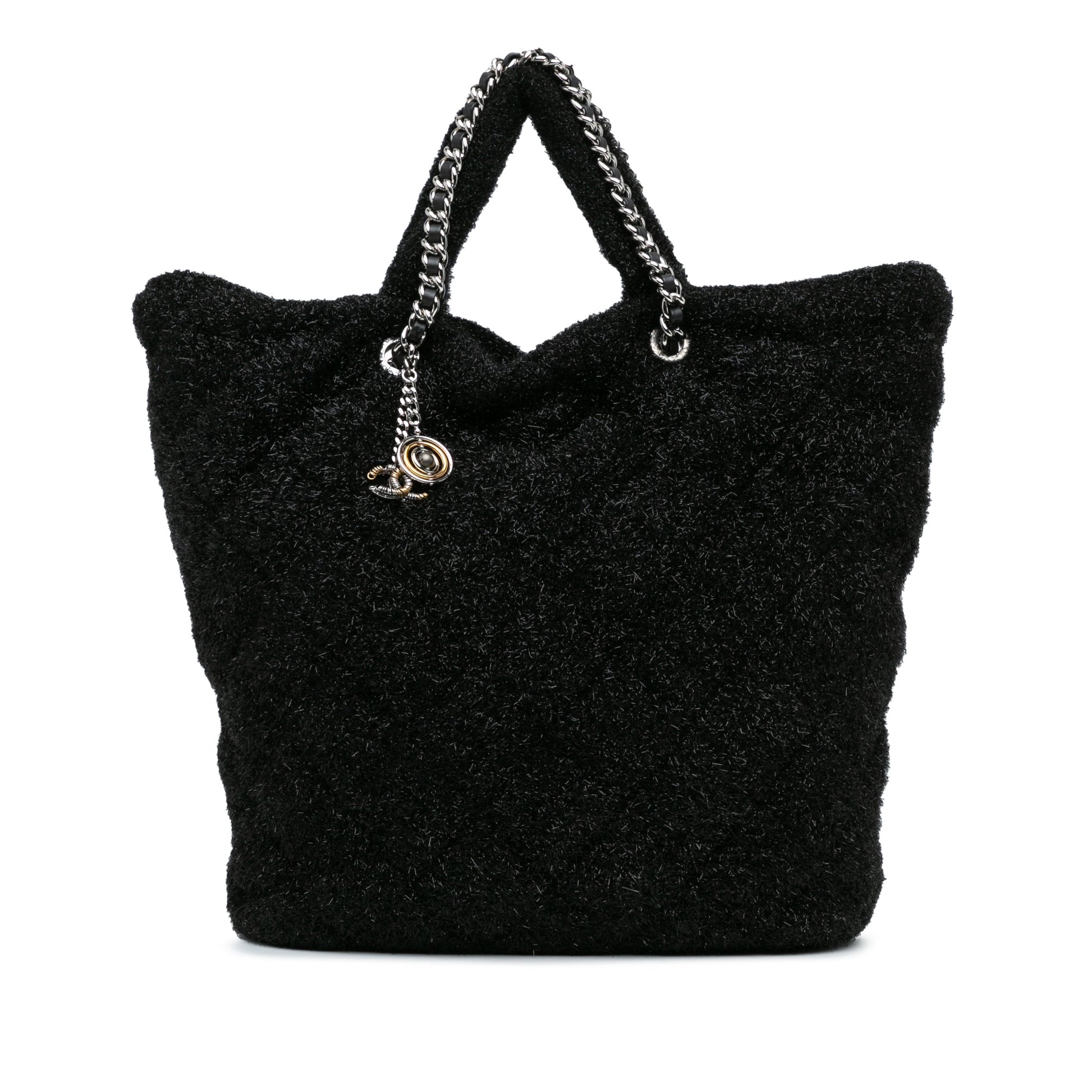 Product Details: Black Chanel Large Quilted Knit Pluto Glitter Satchel. This tote features a quilted knit pluto glitter body, rolled handles, leather-woven chain link straps, an open top with magnetic snap button closure, and interior zip and slip pockets. 16.5" L x 13.8" W x 7.5" D, 6.3" drop. Serial number 24886083.
