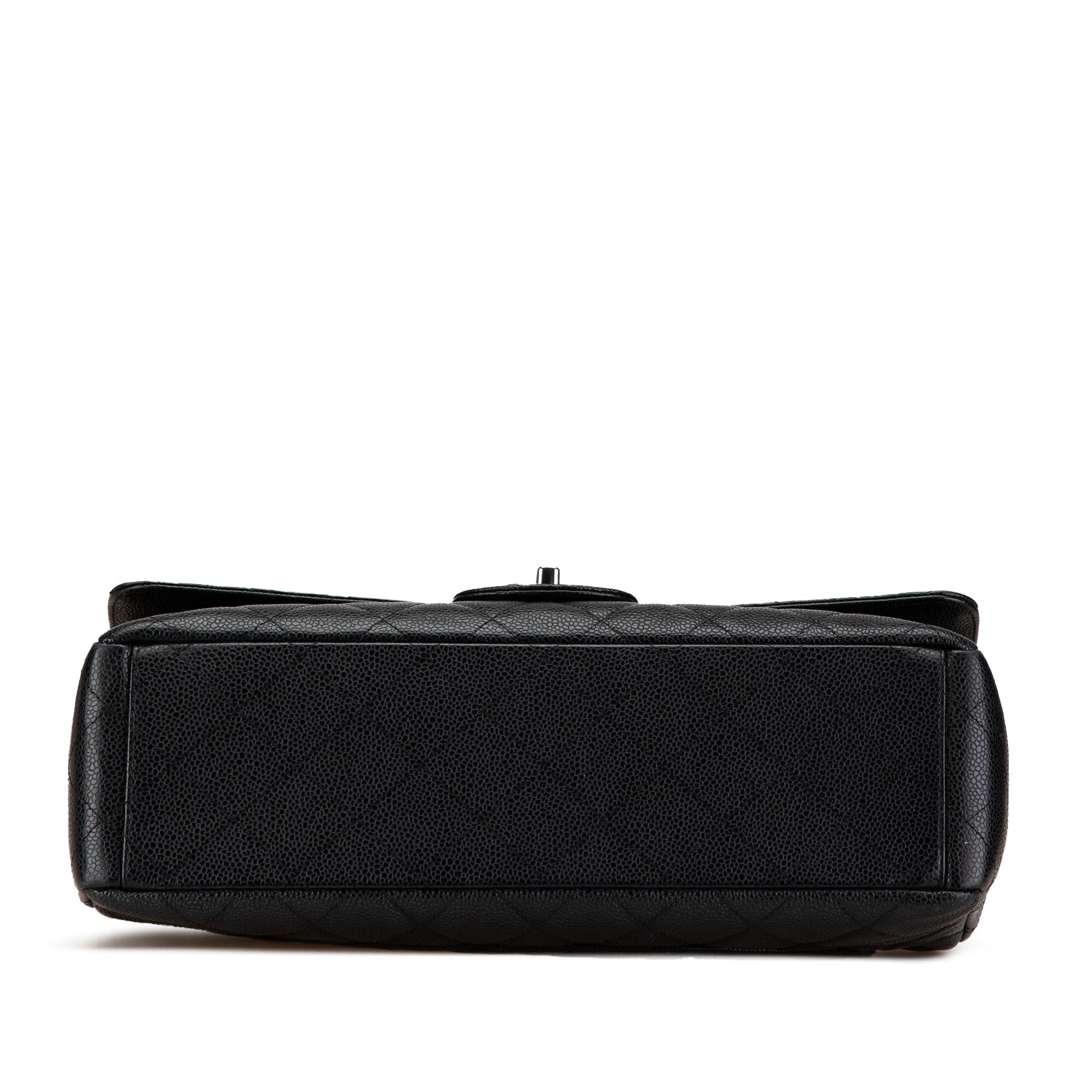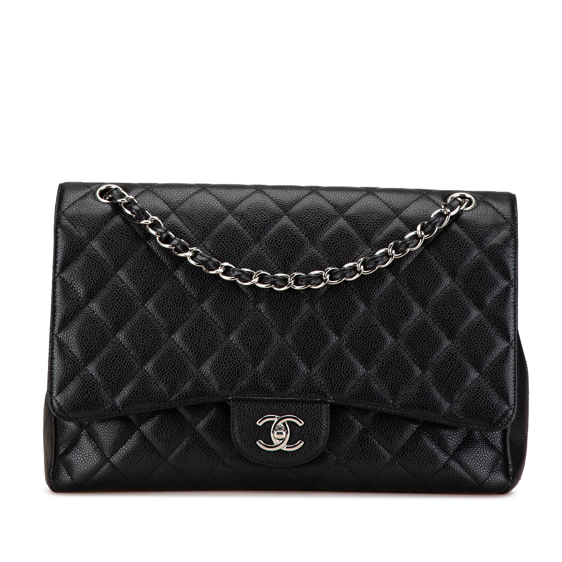 Product Details: Black Chanel Maxi Classic Caviar Single Flap Shoulder Bag. This shoulder bag features a quilted caviar leather body, leather woven chain link straps, a top flap with CC turn lock closure, an exterior back slip pocket, and interior zip and slip pockets. 8.1" L x 13" W x 3.7" D, 10.8" drop. Serial number 10446283.