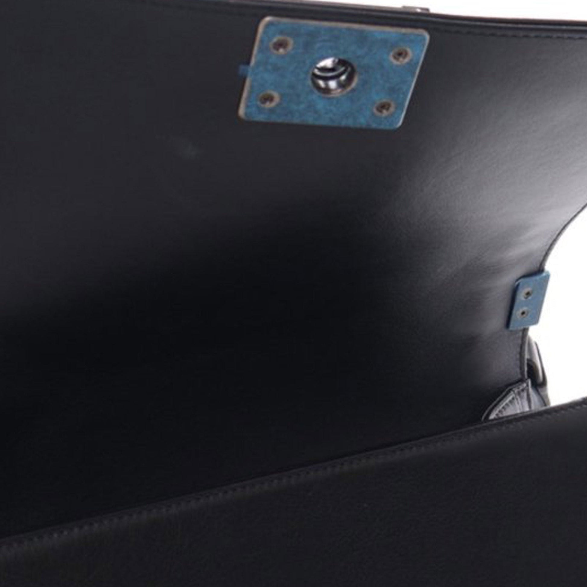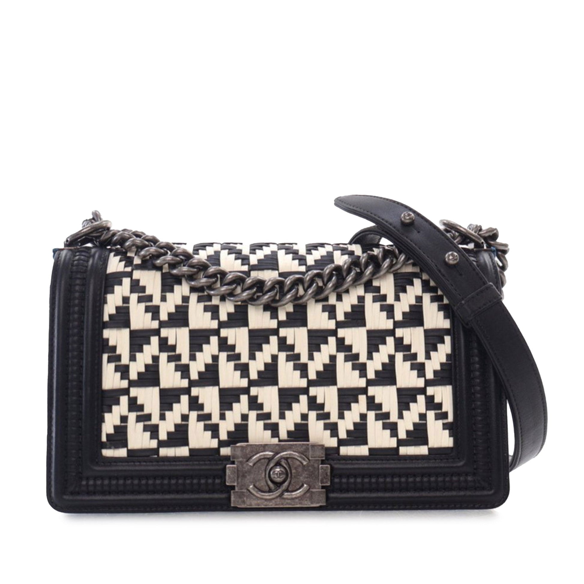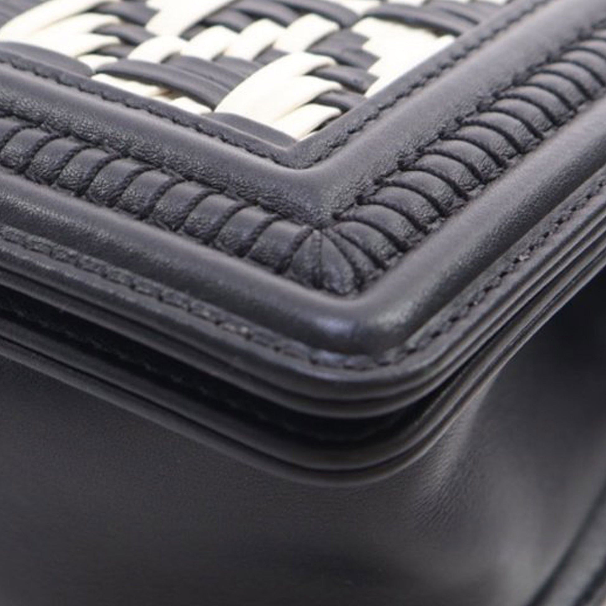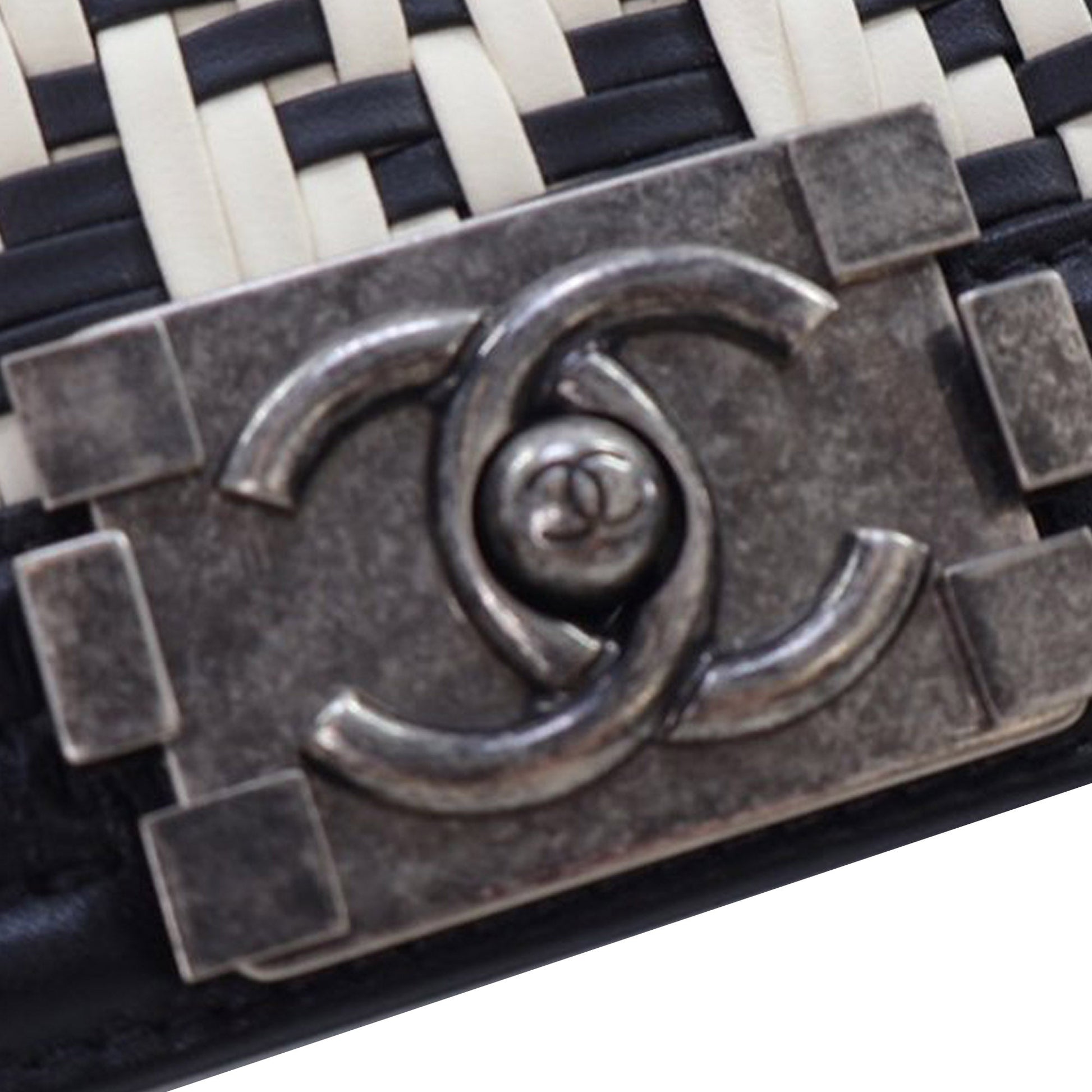 Product Details: Black Chanel Medium Bicolor Woven Calfskin Boy Flap Shoulder Bag. The Boy flap features a woven leather body, a silver-tone chain strap, and a front flap with magnetic snap closure, and an interior slip pocket. 5.9" L x 9.8" W x 3.1" D, 12.2" drop. Serial number 2152xxxx.
