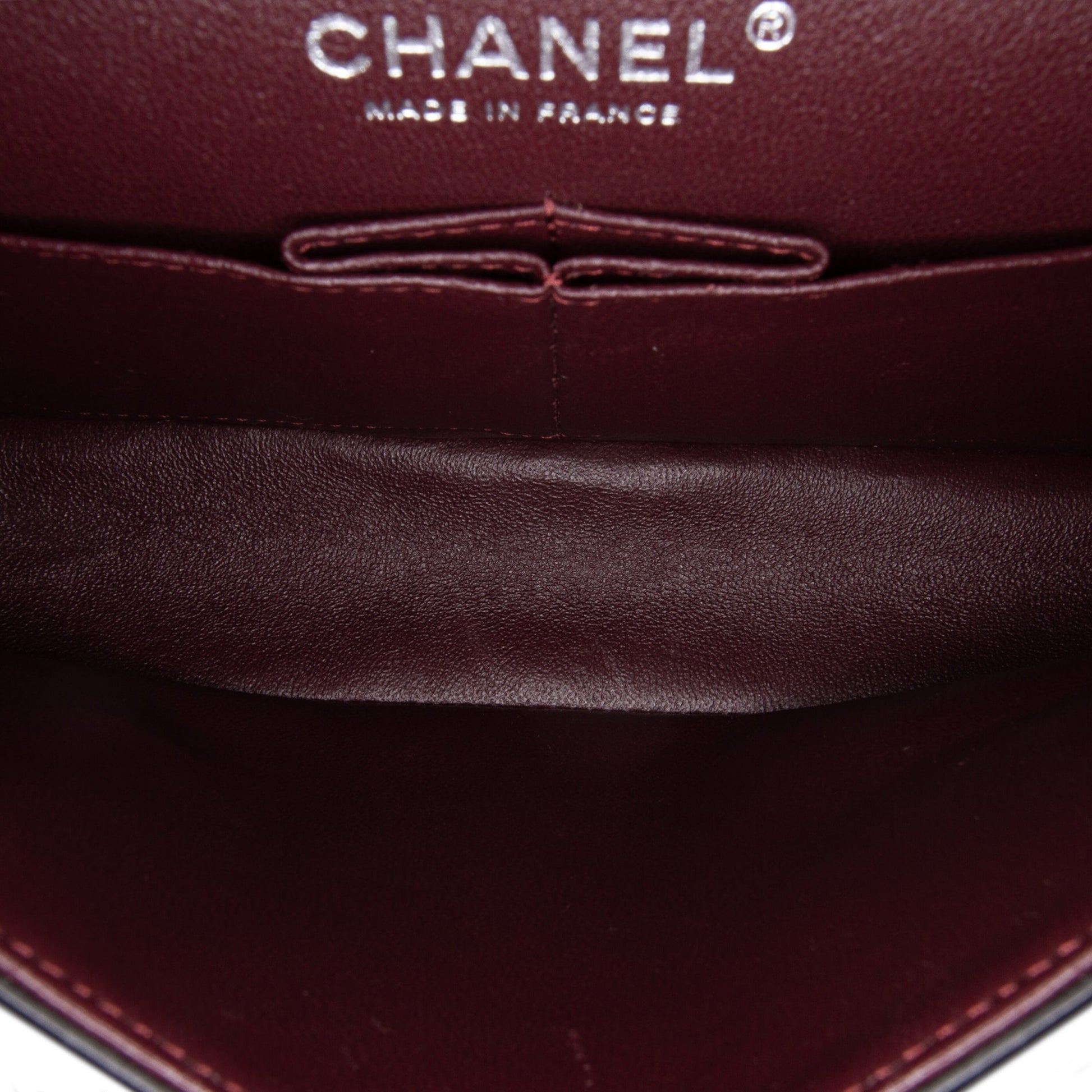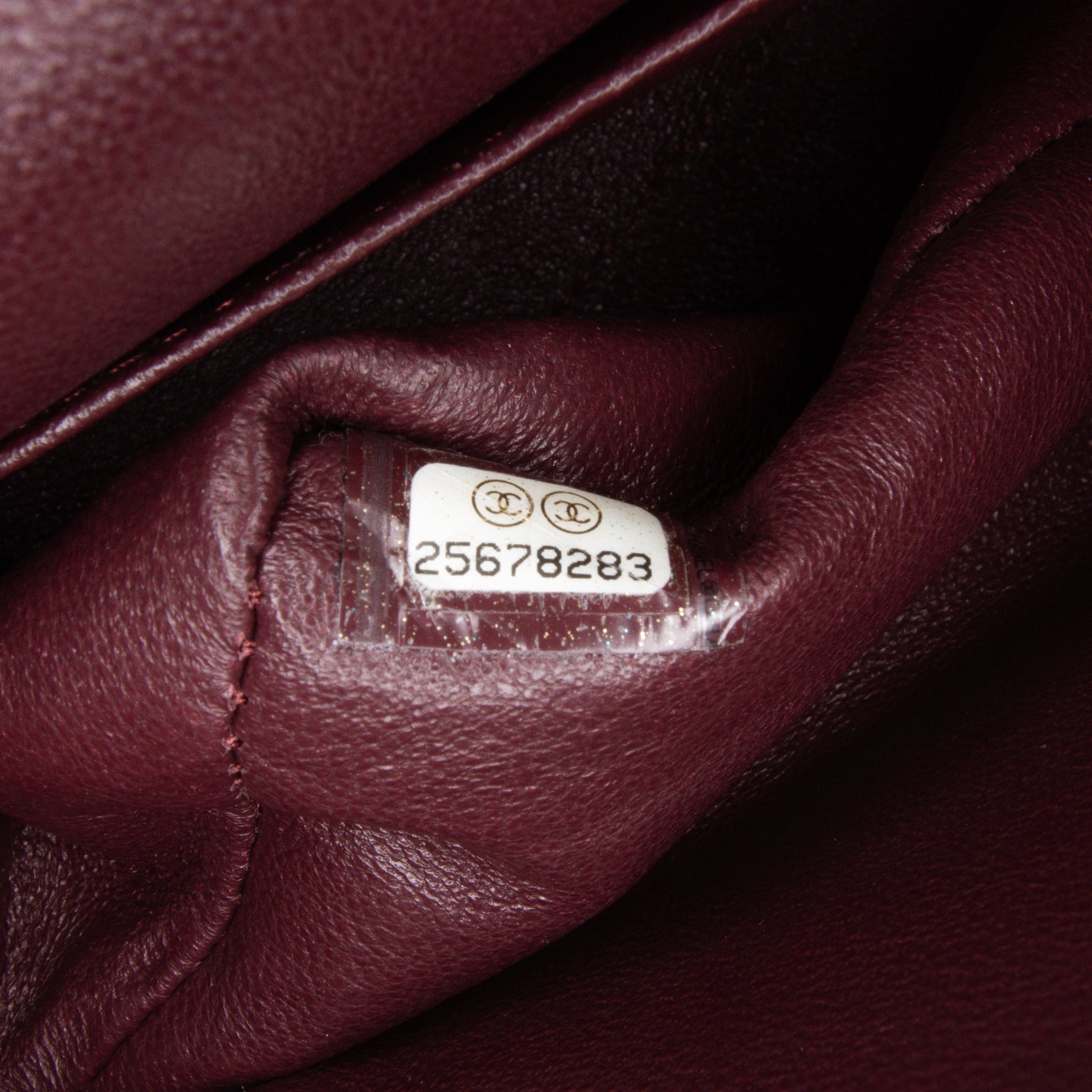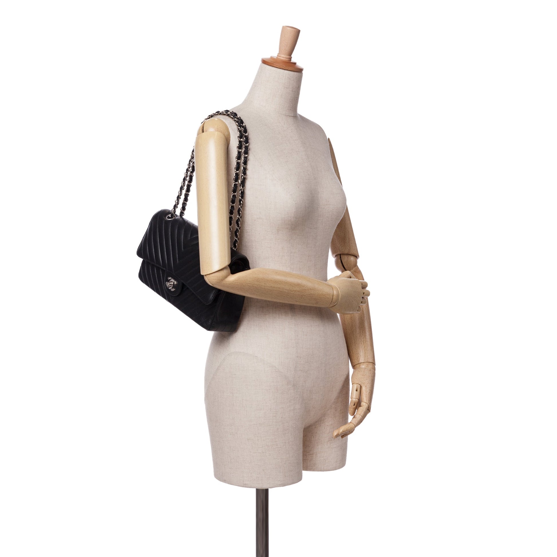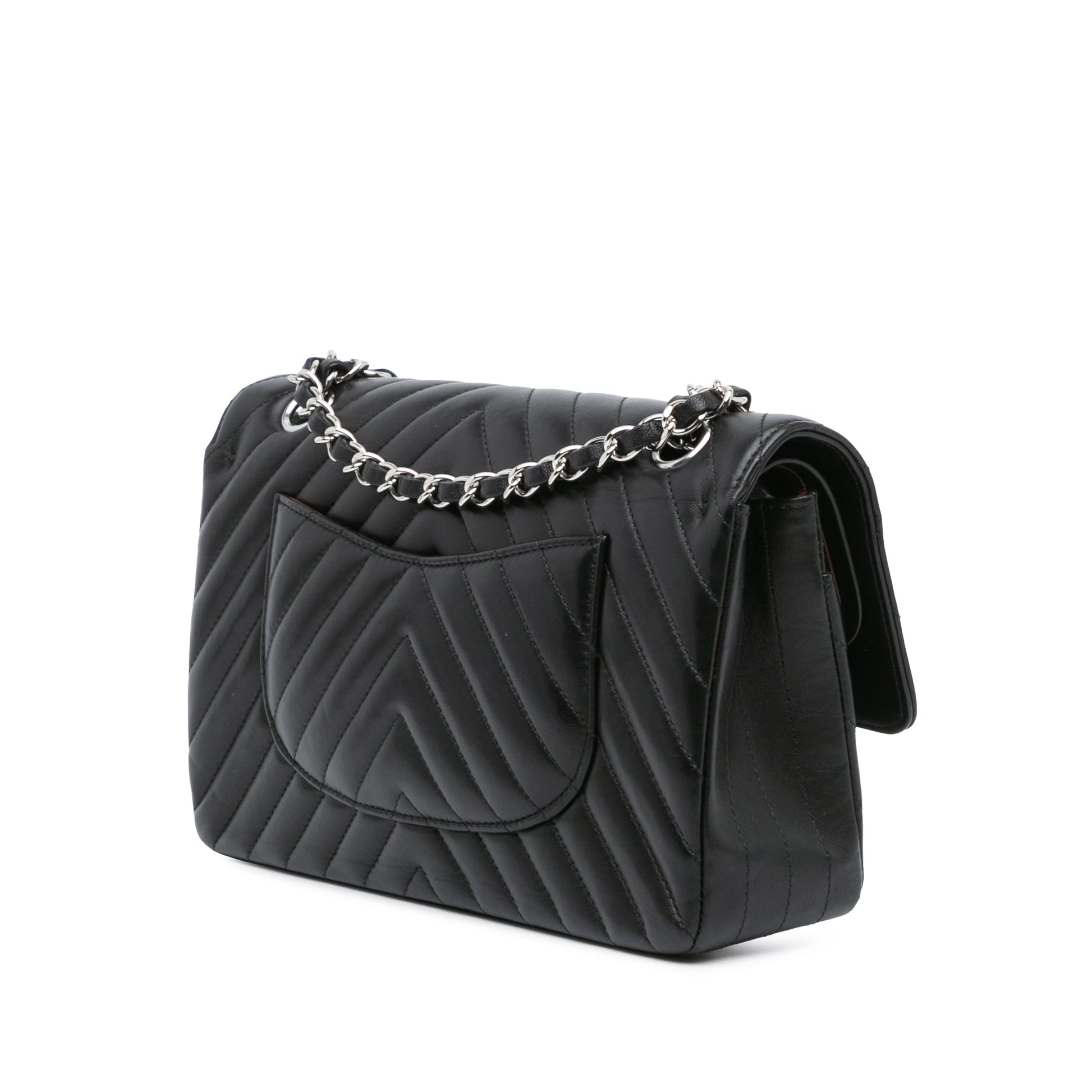 Product Details: Black Chanel Medium Classic Chevron Lambskin Double Flap Shoulder Bag. This shoulder bag features a quilted lambskin leather body, a leather woven chain link shoulder strap, front flaps with interlocking Cs and twist lock closure, an exterior back slip pocket, and interior zip and slip pockets. 6.3" L x 10" W x 2.6" D, 9.4" drop. Serial number 25678283.