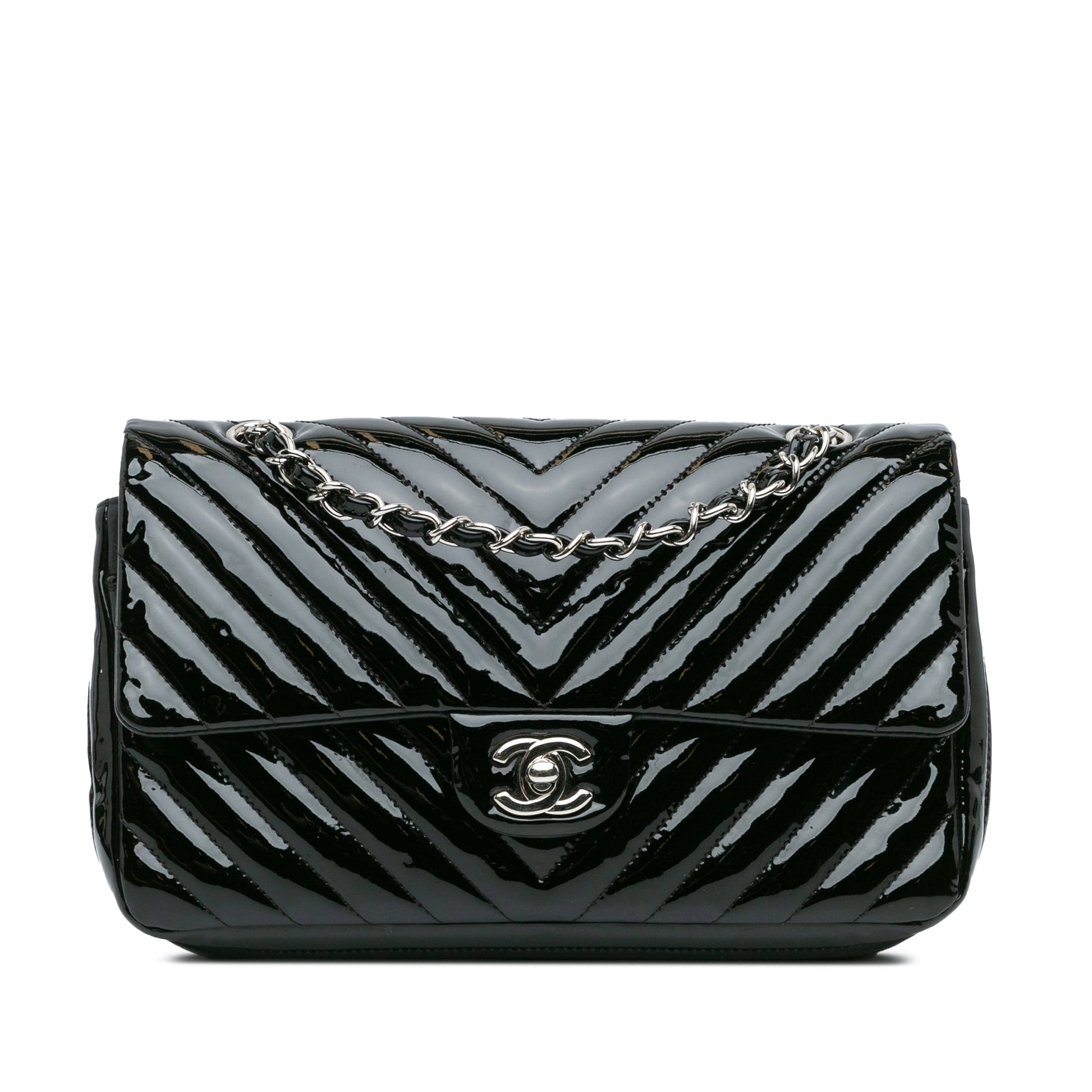 Please note this is a item that may display signs of wear consistent with the condition listed above and shown in photos. Designer Revival this is an Black Chanel Medium Classic Chevron Patent Double Flap Shoulder Bag or . .