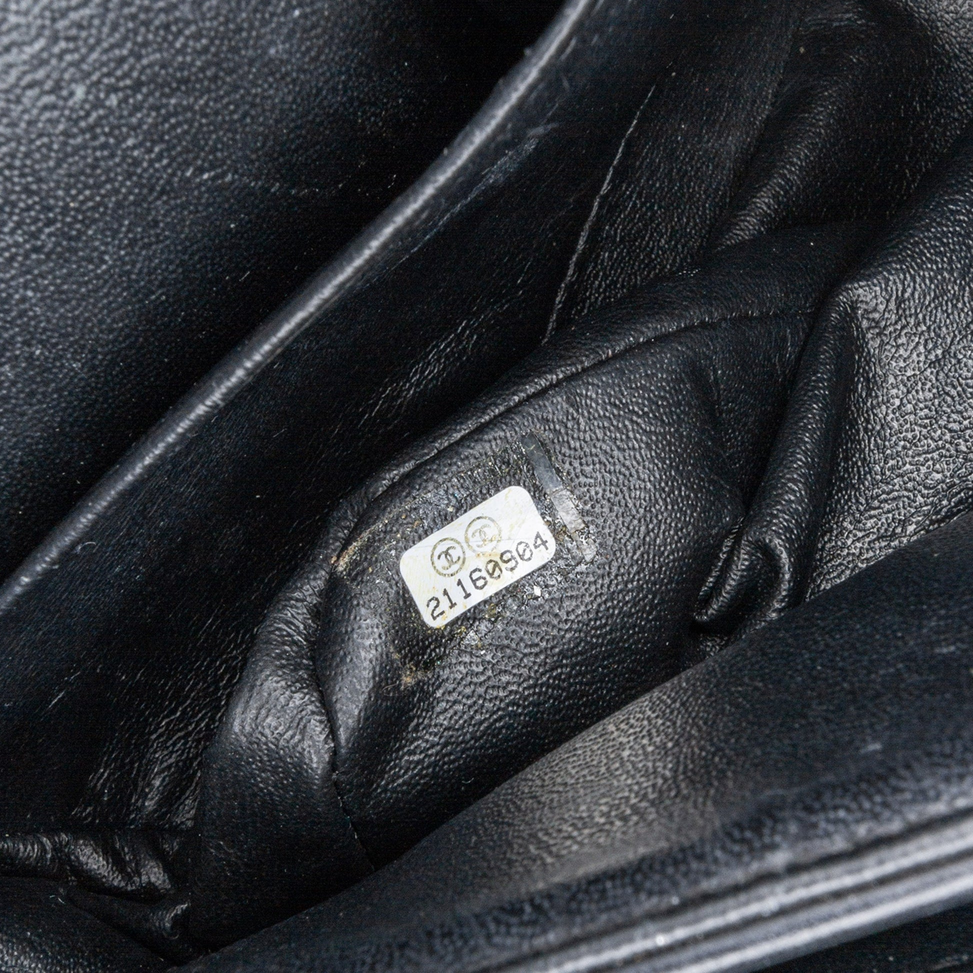 Product Details: Black Chanel Medium Classic Chevron Patent Double Flap Shoulder Bag. This shoulder bag features a quilted patent leather body, leather woven chain shoulder straps, front flaps with interlocking Cs and twist lock closure, an exterior back slip pocket, and interior zip and slip pockets. 6.3" L x 9.4" W x 2.4" D, 9.1" drop. Serial number 21160904.