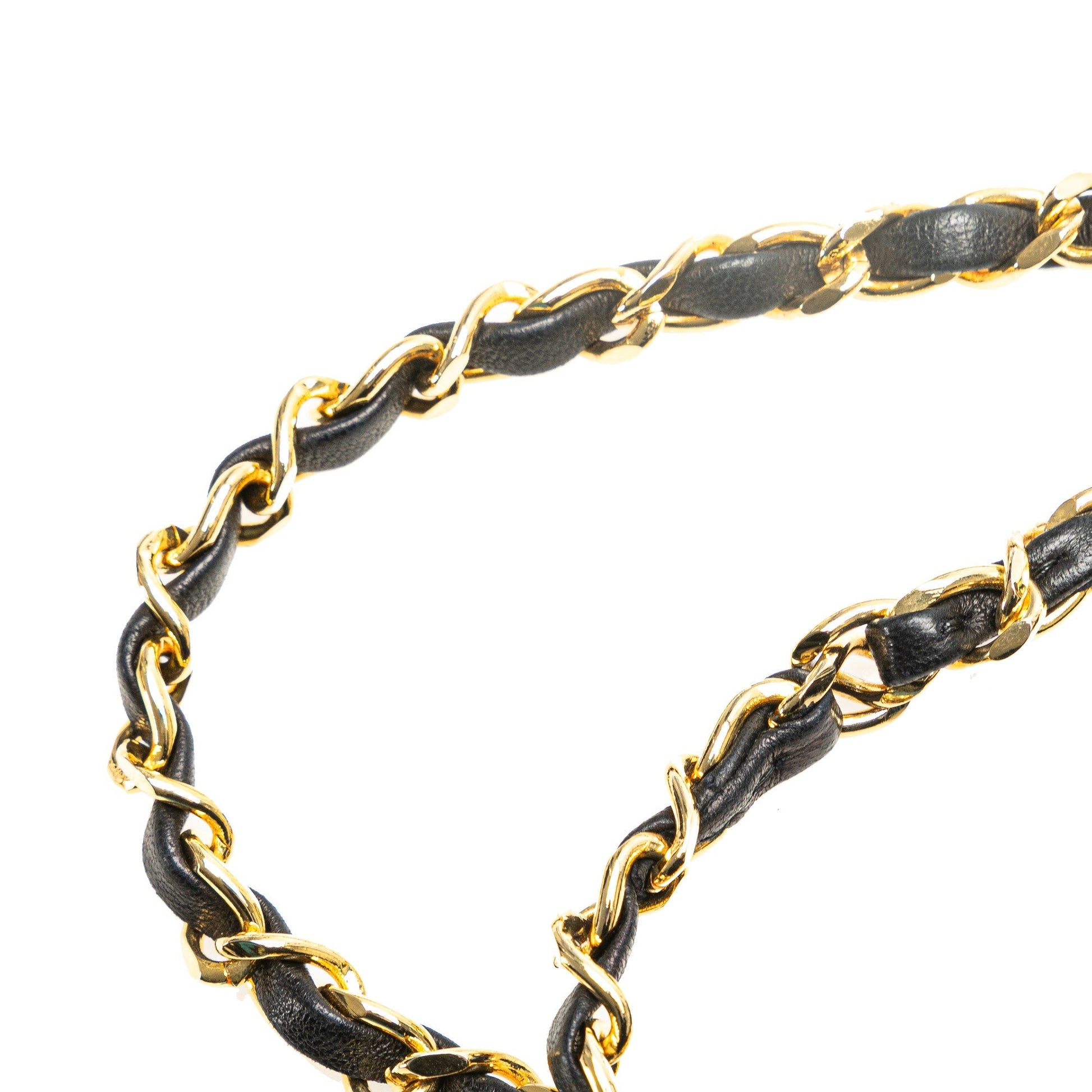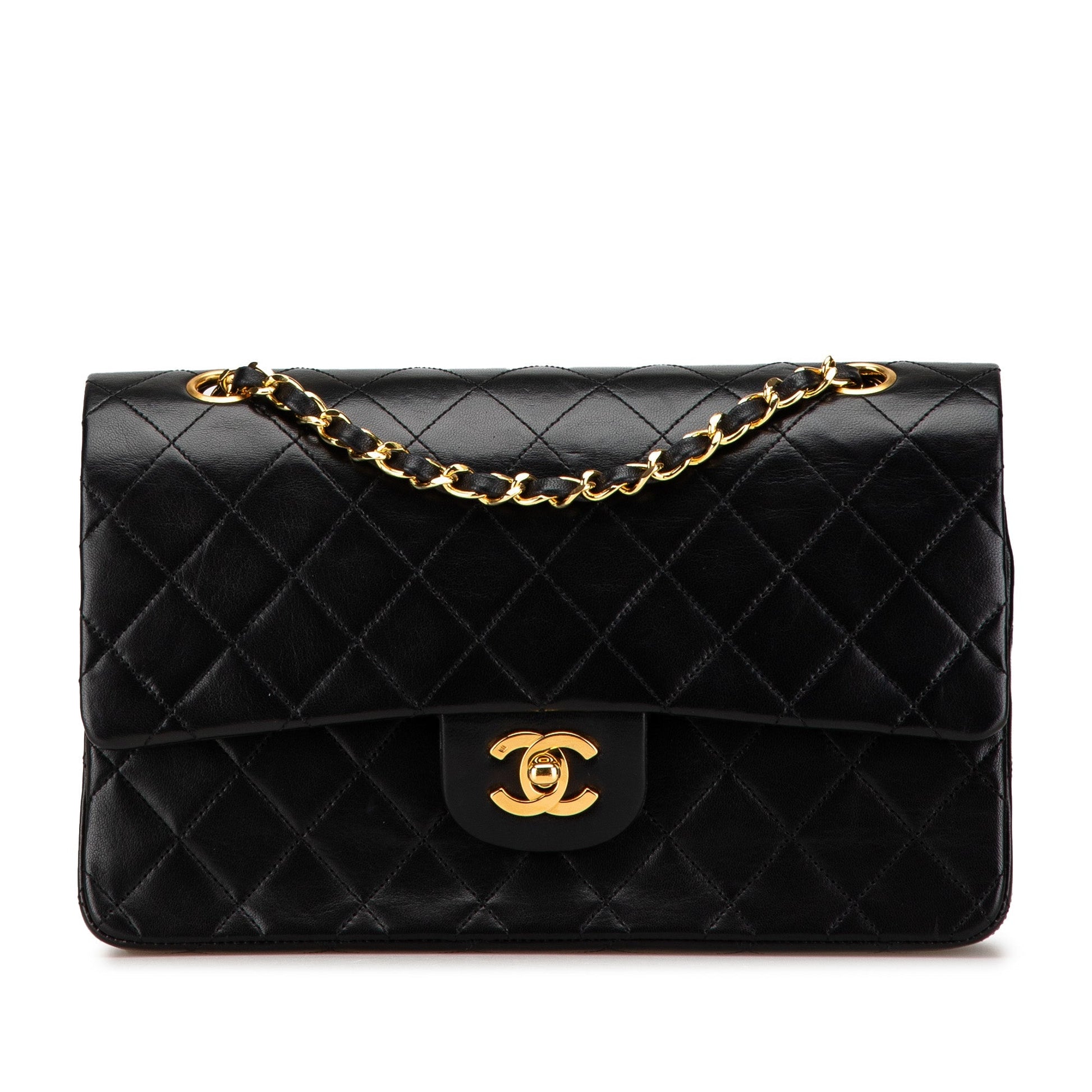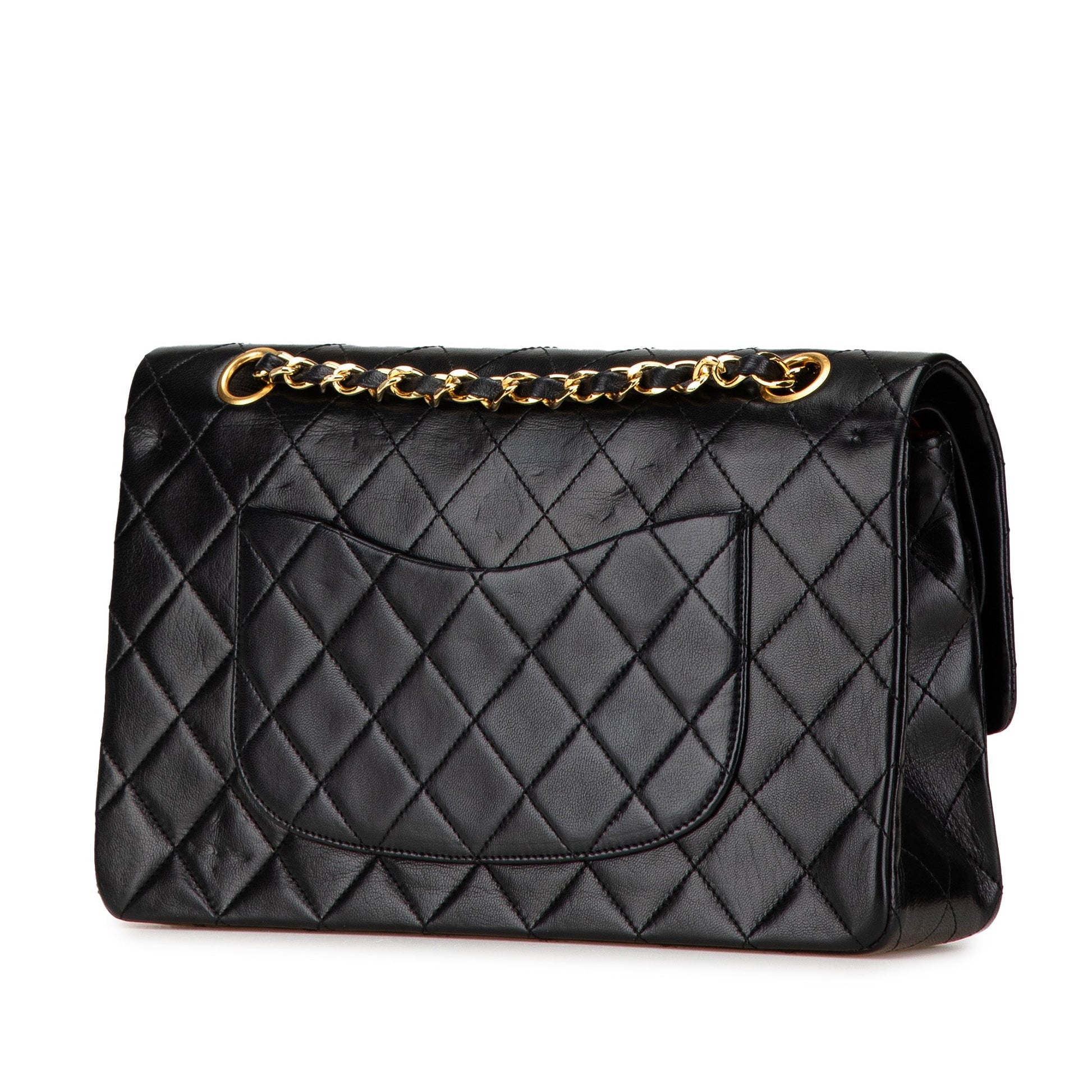 Product Details: Black Chanel Medium Classic Lambskin Double Flap Shoulder Bag. This shoulder bag features a quilted lambskin body, leather woven chain straps, double front flaps with interlocking Cs and a twist lock closure, an exterior back slip pocket, and interior zip and slip pockets. The leather strap is repaired. 6.3" L x 9.8" W x 2.6" D. Serial number 1205533.