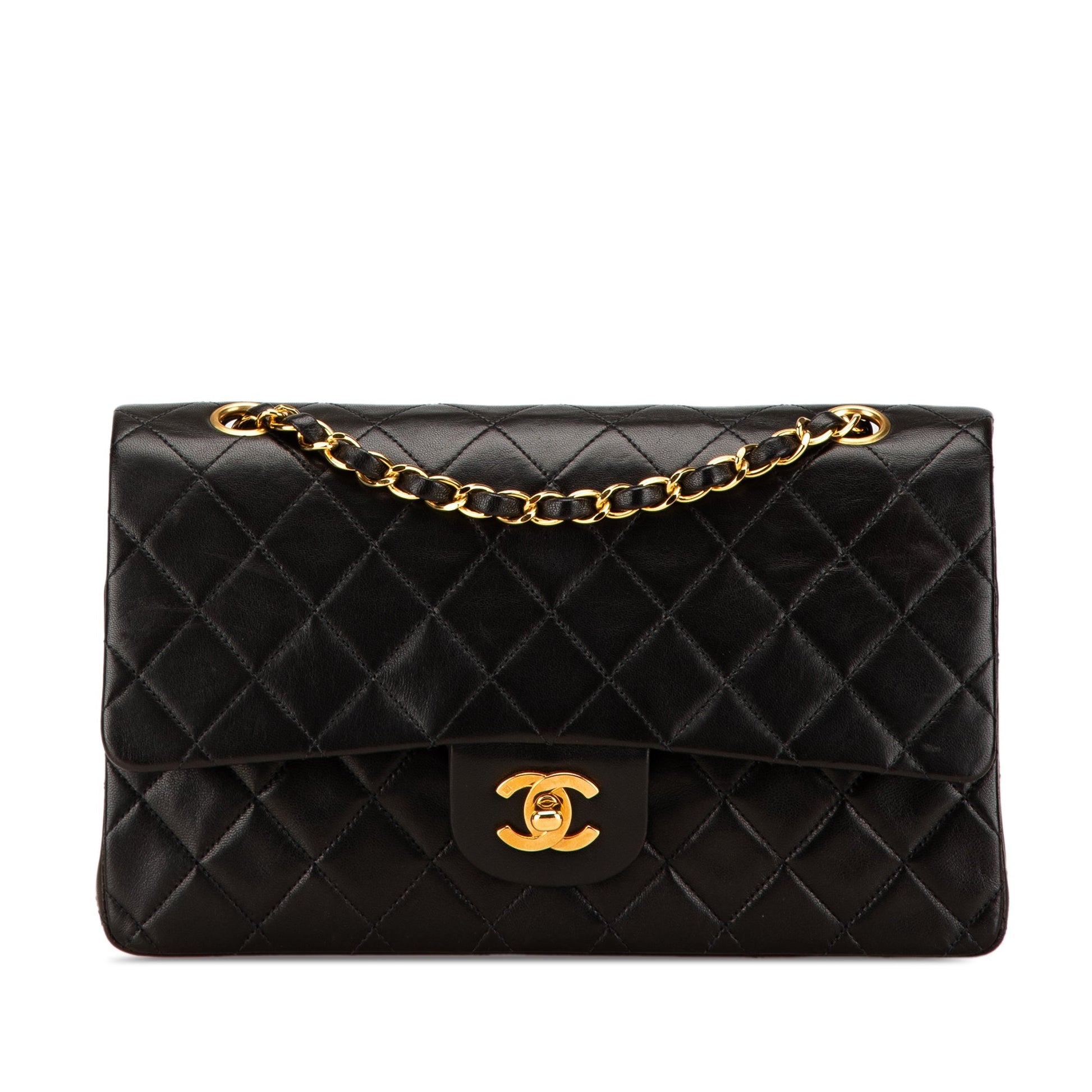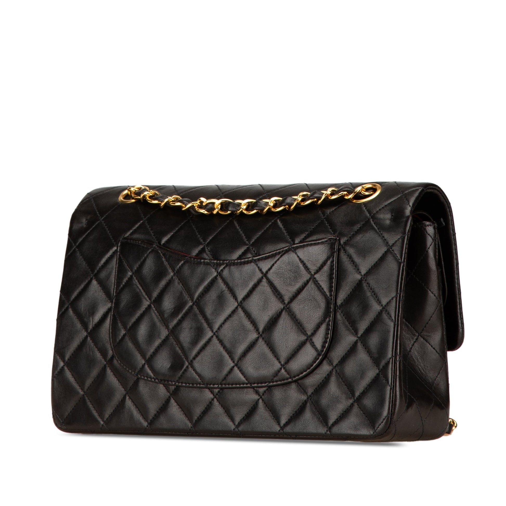 Product Details: Black Chanel Medium Classic Lambskin Double Flap Shoulder Bag. This shoulder bag features a quilted lambskin body, leather woven chain straps, double front flaps with interlocking Cs and a twist lock closure, an exterior back slip pocket, and interior zip and slip pockets. 6.1" L x 10" W x 2.6" D. Serial number 4531682.