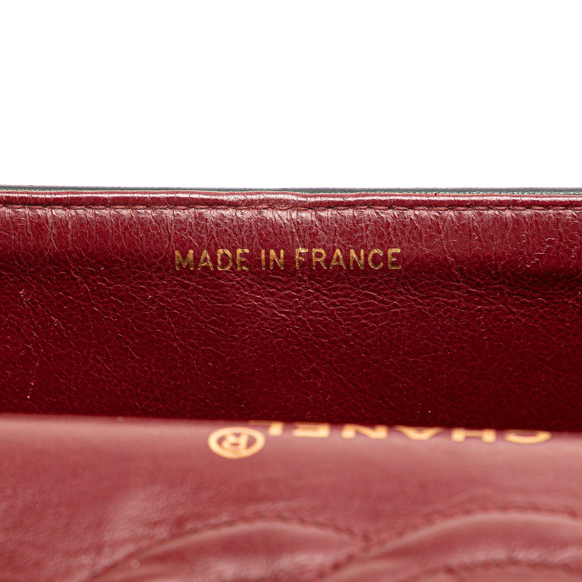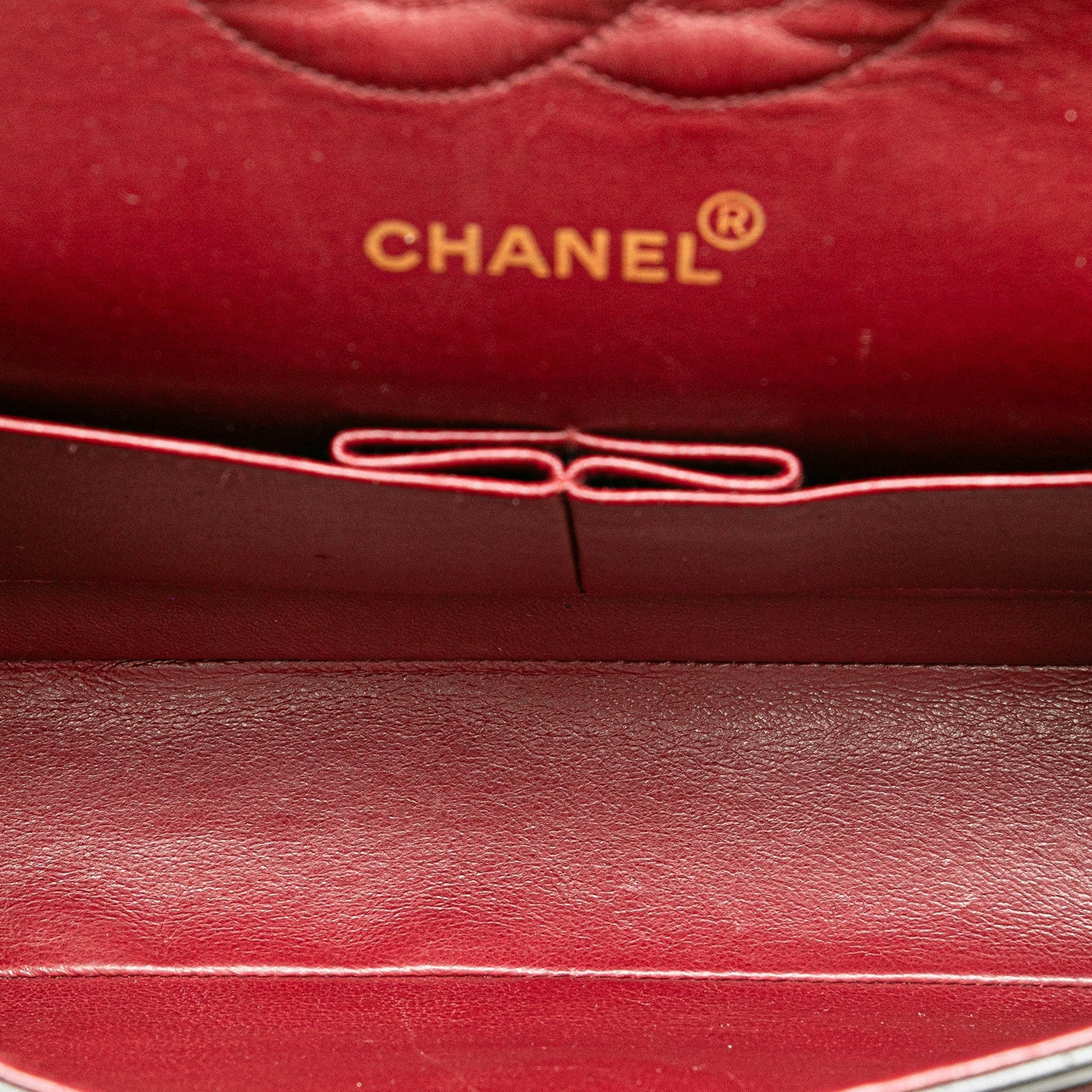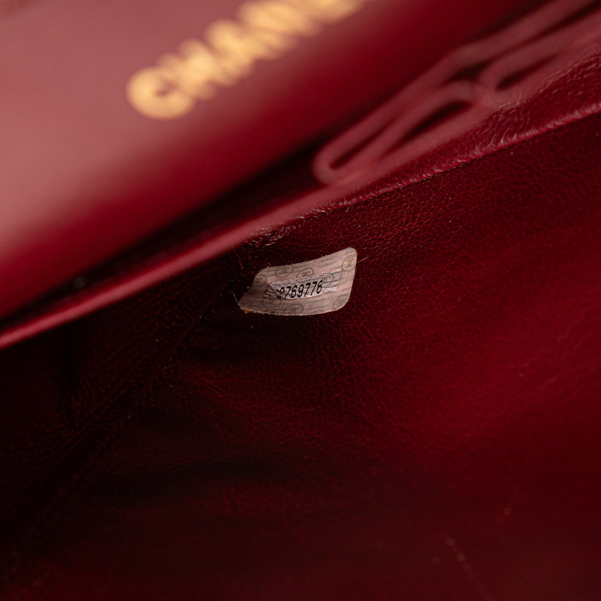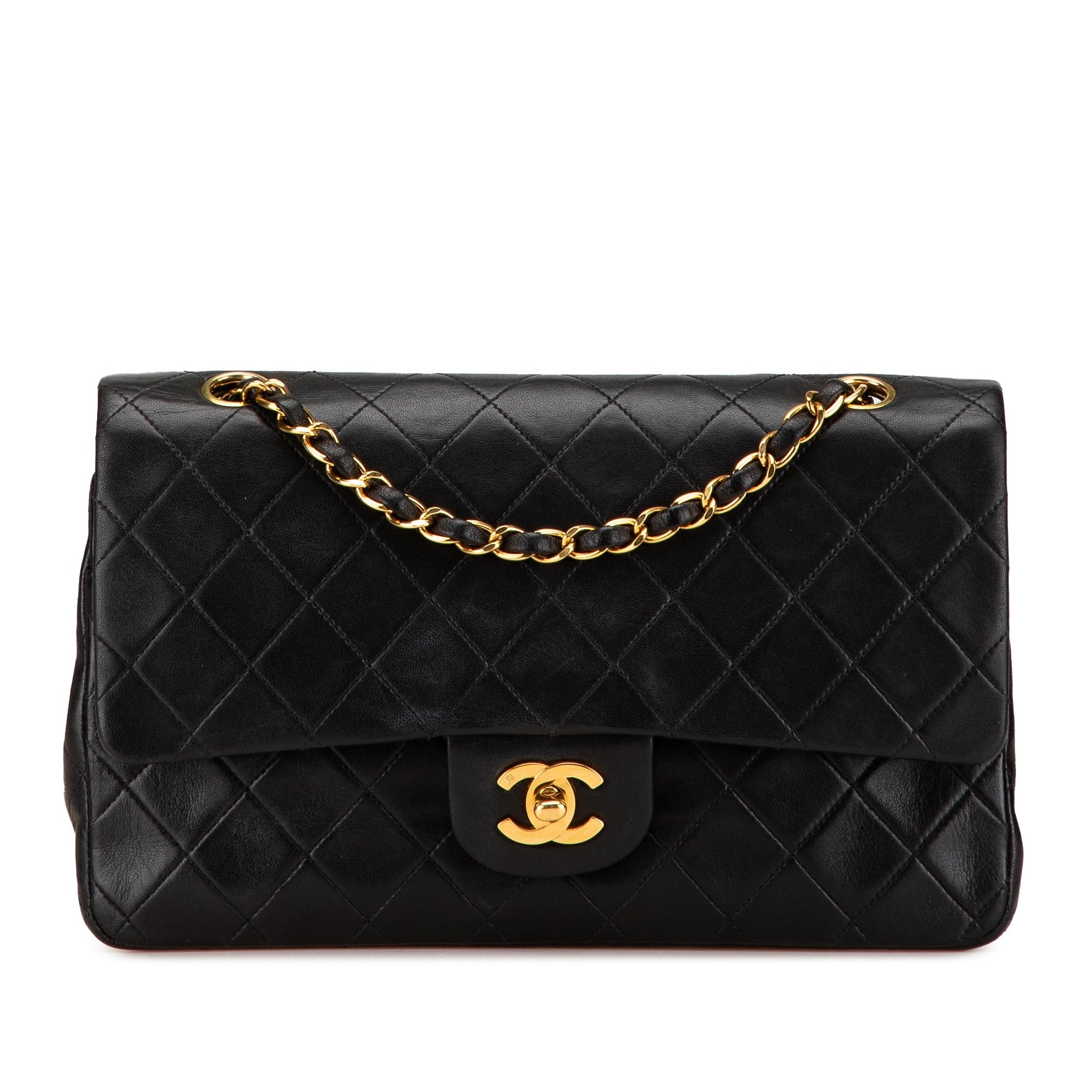 Product Details: Black Chanel Medium Classic Lambskin Double Flap Shoulder Bag. This shoulder bag features a quilted lambskin body, leather woven chain link straps, double front flaps with interlocking Cs and a twist lock closure, an exterior back slip pocket, and interior zip and slip pockets. 6.3" L x 9.8" W x 2.8" D. Serial number 2769776.