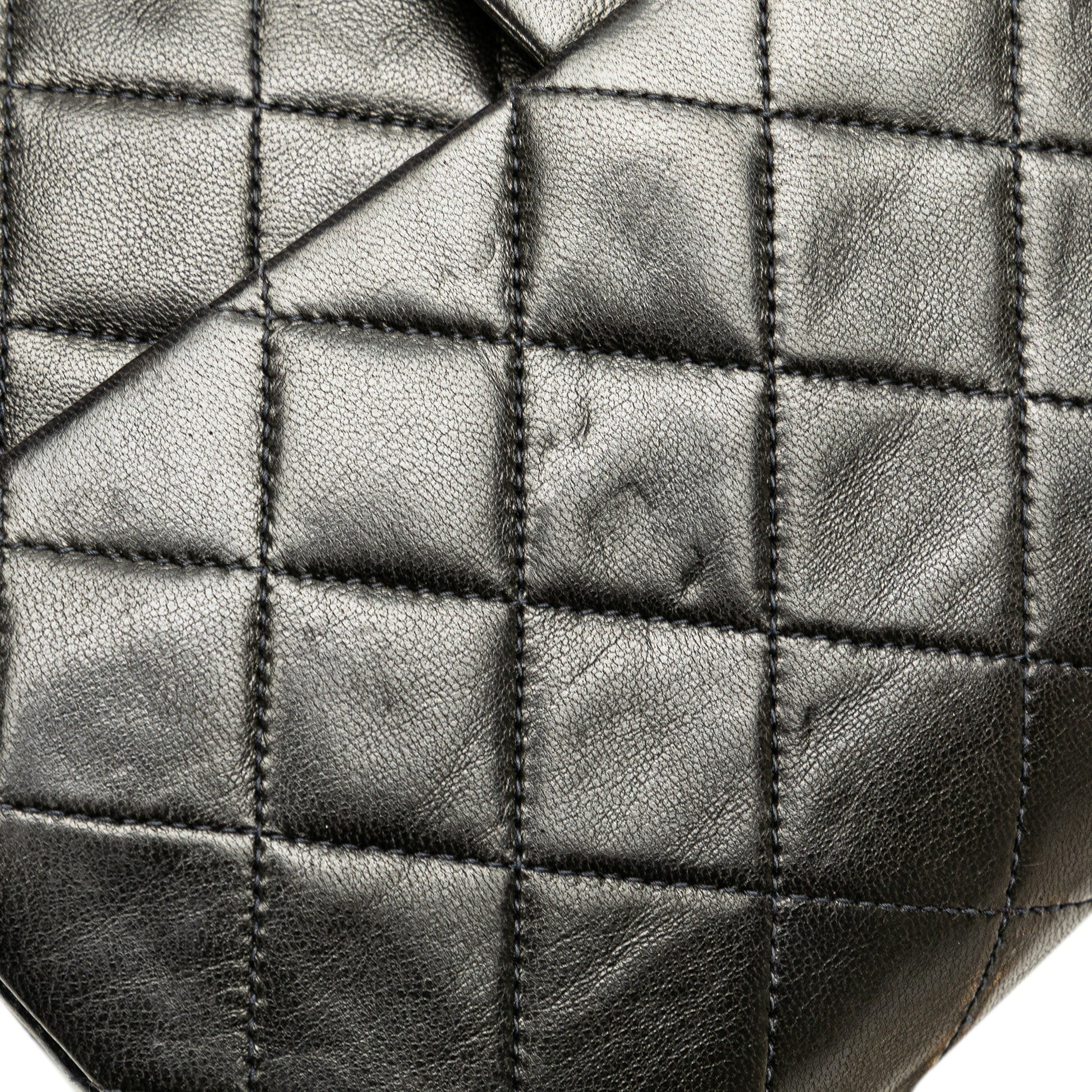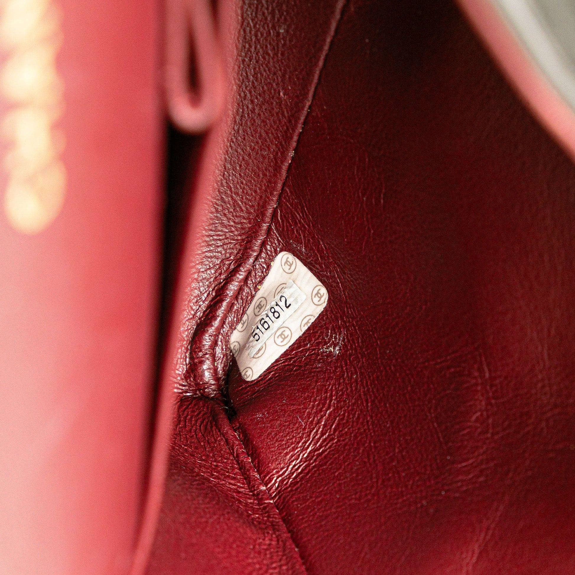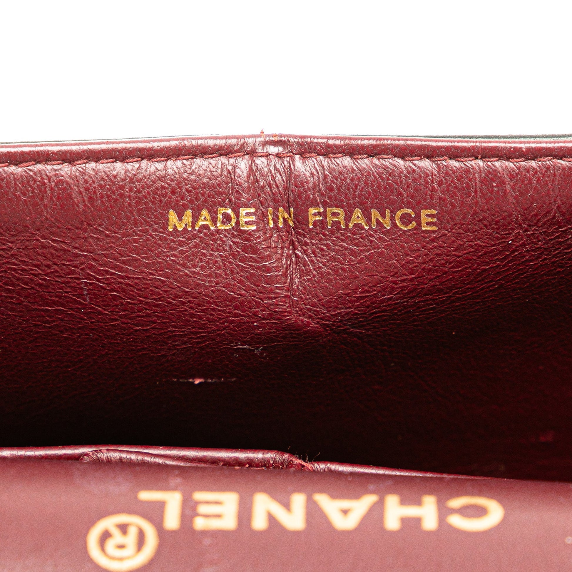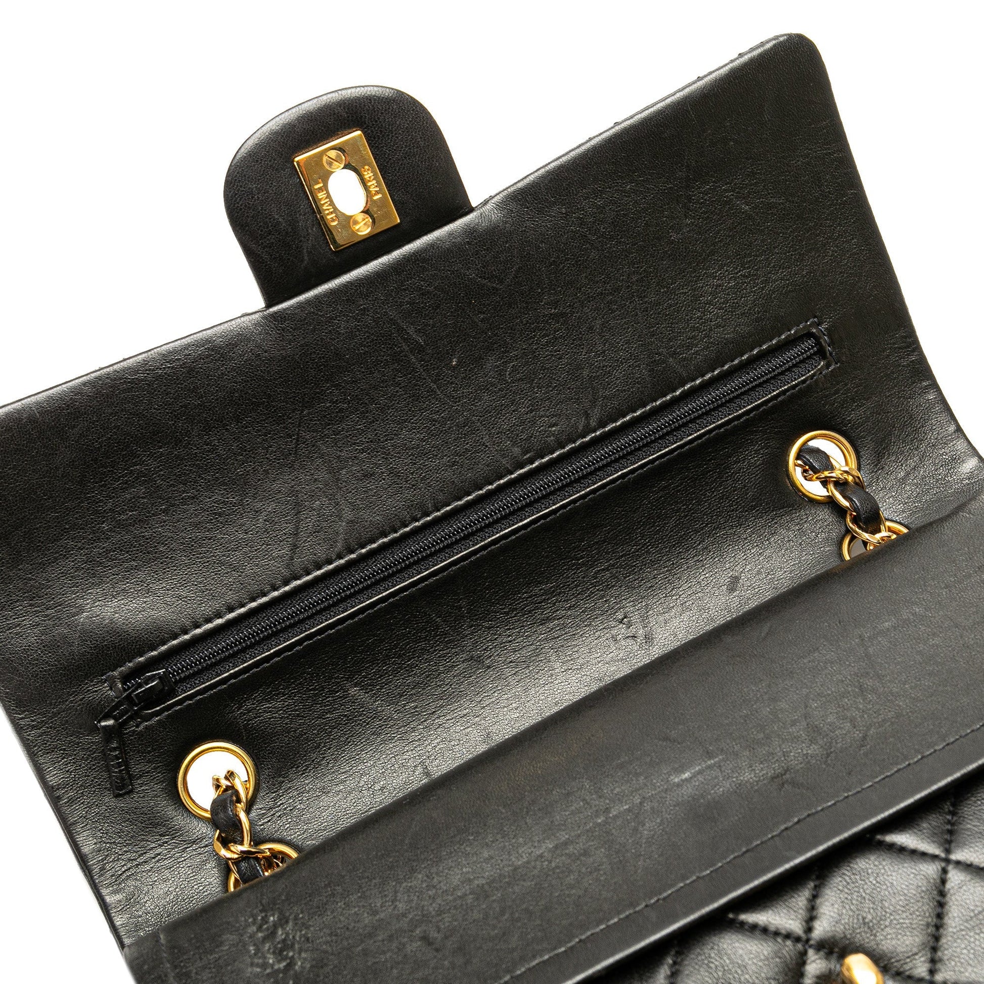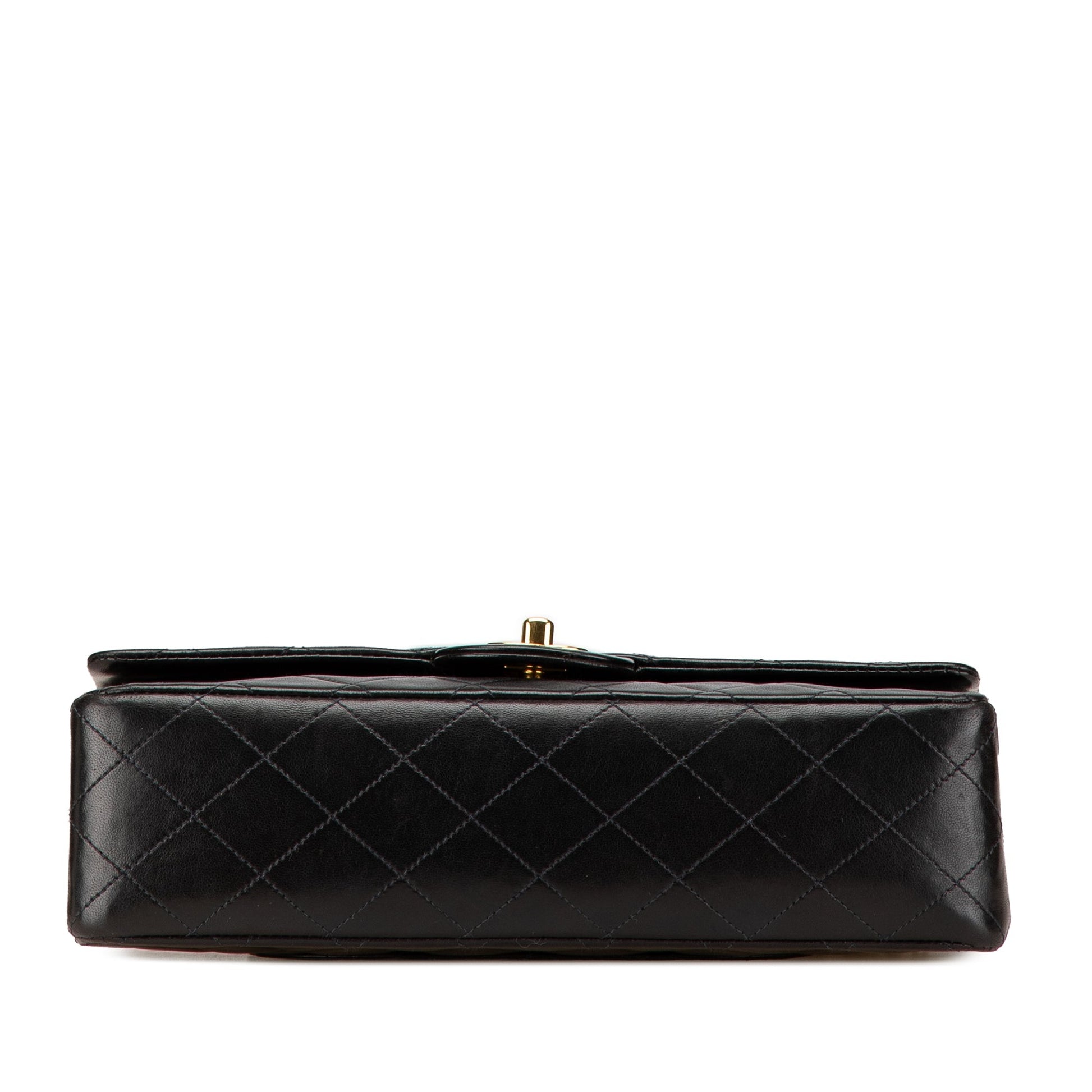Product Details: Black Chanel Medium Classic Lambskin Double Flap Shoulder Bag. This shoulder bag features a quilted lambskin body, leather woven chain straps, double front flaps with interlocking Cs and a twist lock closure, an exterior back slip pocket, and interior zip and slip pockets. 5.9" L x 9.8" W x 2.8" D. Serial number 5161812.
